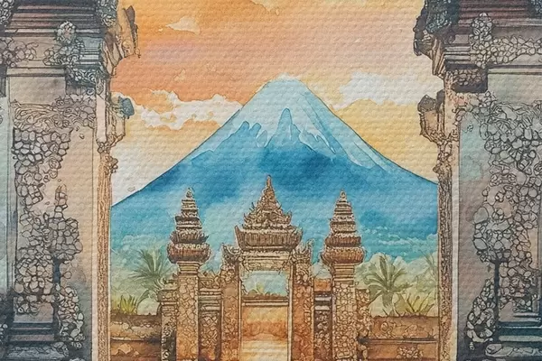 Afbeelding Bali esthetiek, tempel, zonsondergang, tropische natuur, aquarel stijl Nr r44149