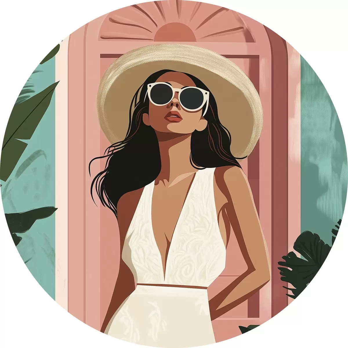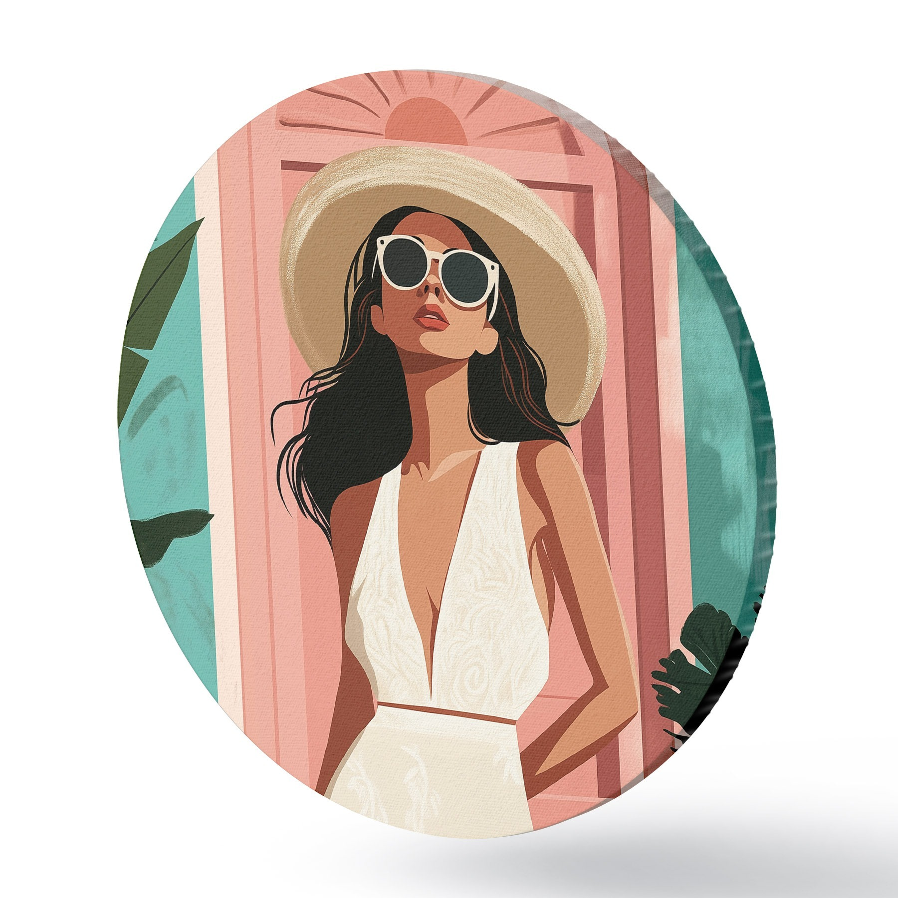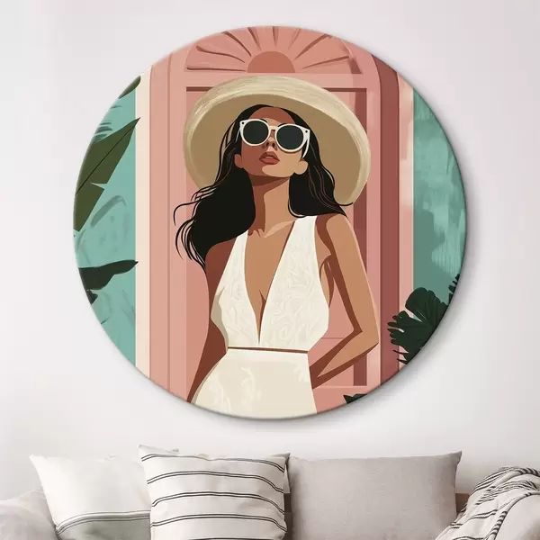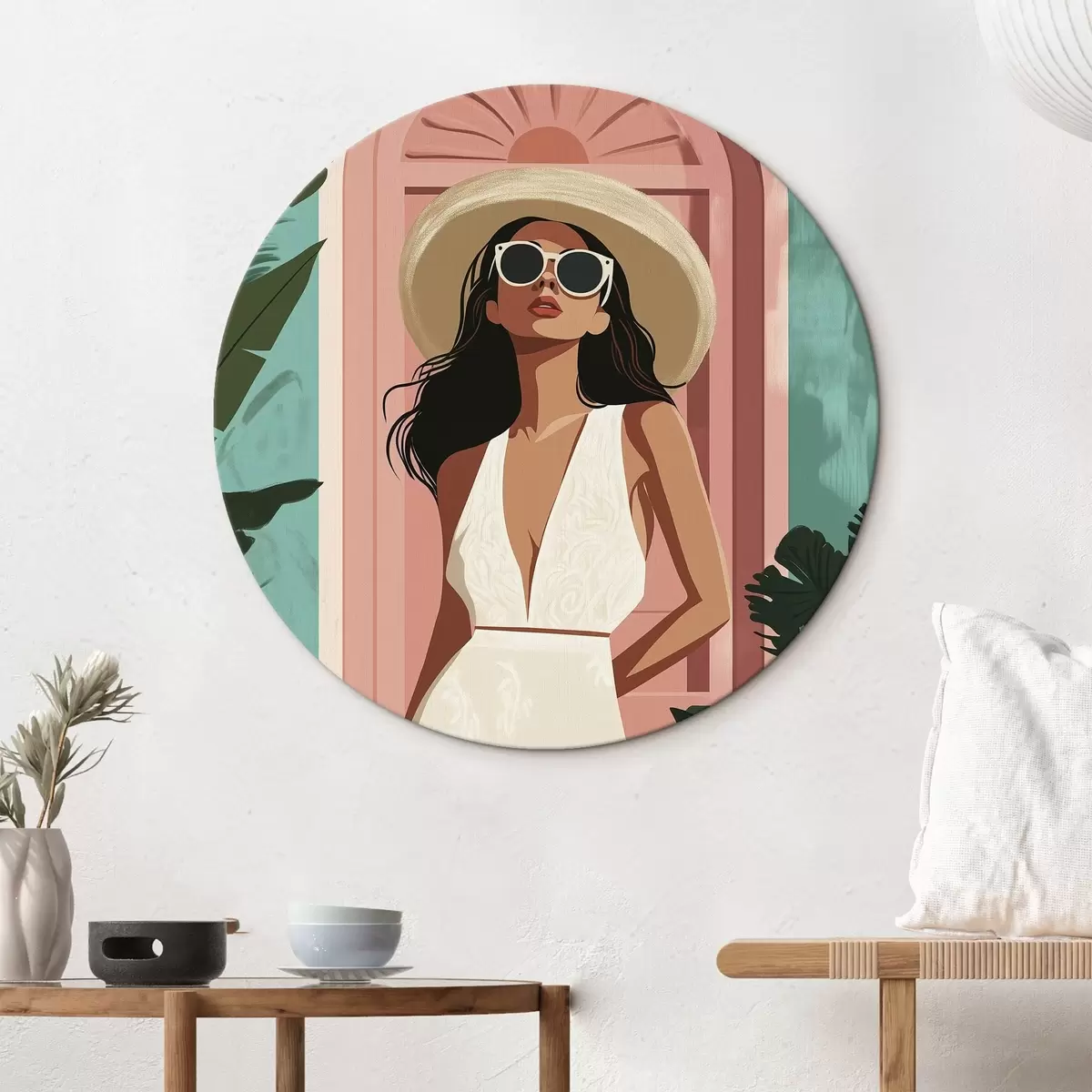 Ronde schilderijen Vrouw met zonnebril en hoed, tropische natuur, architectuur r44152