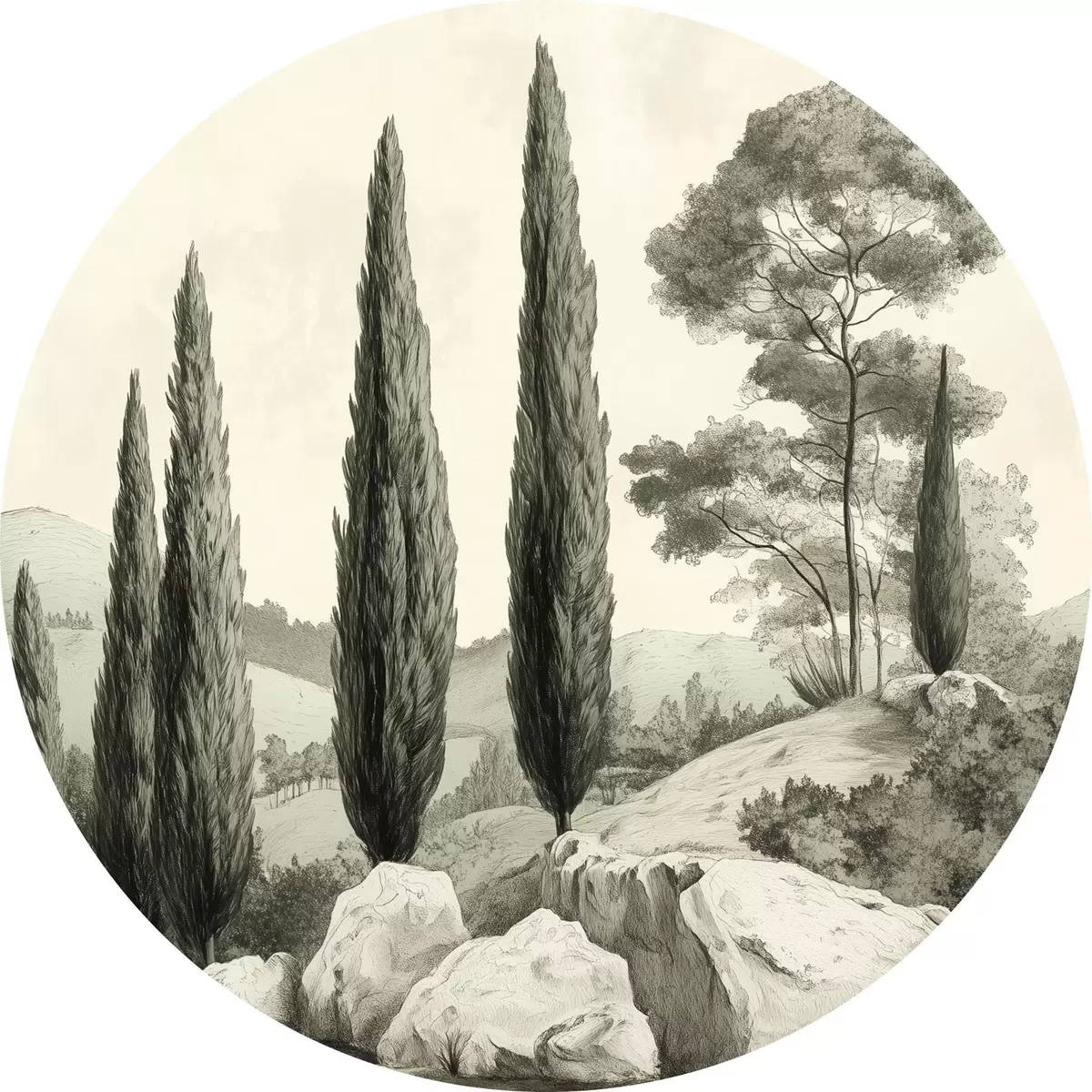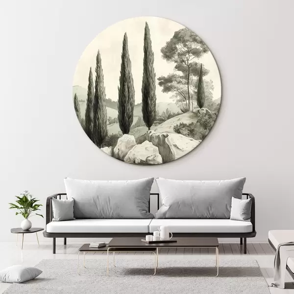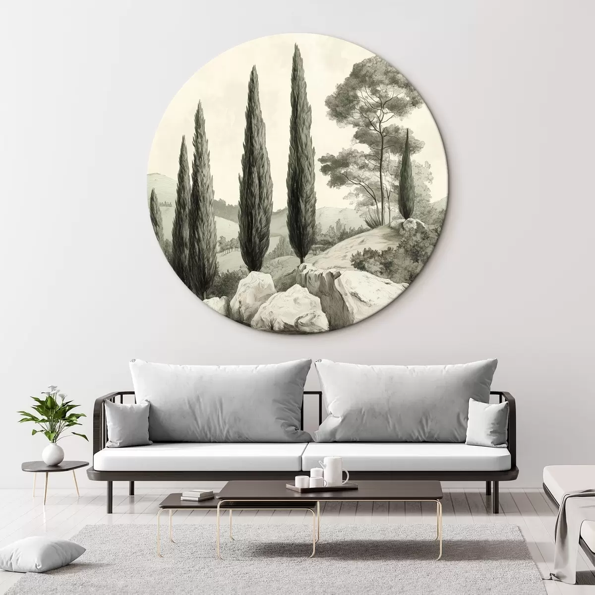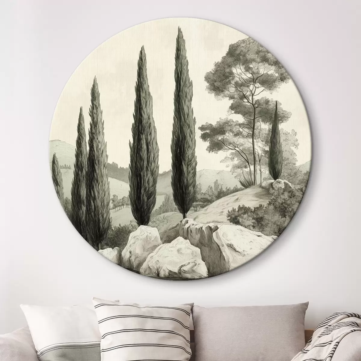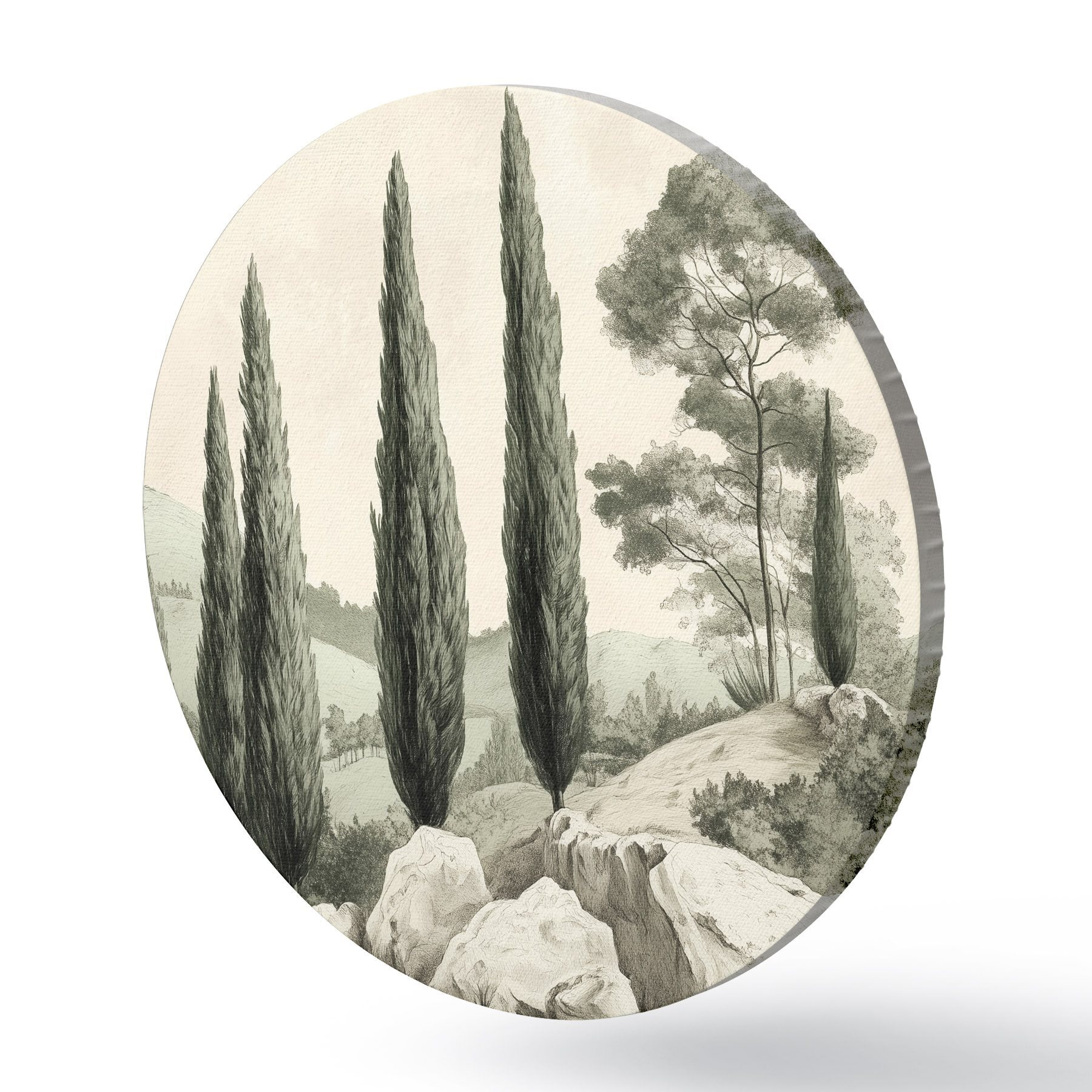 Ronde schilderijen Toscaanse landschappen, pastelkleuren, cipressen, rotsen, rustieke stijl r44307