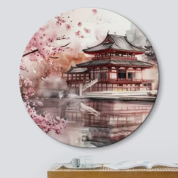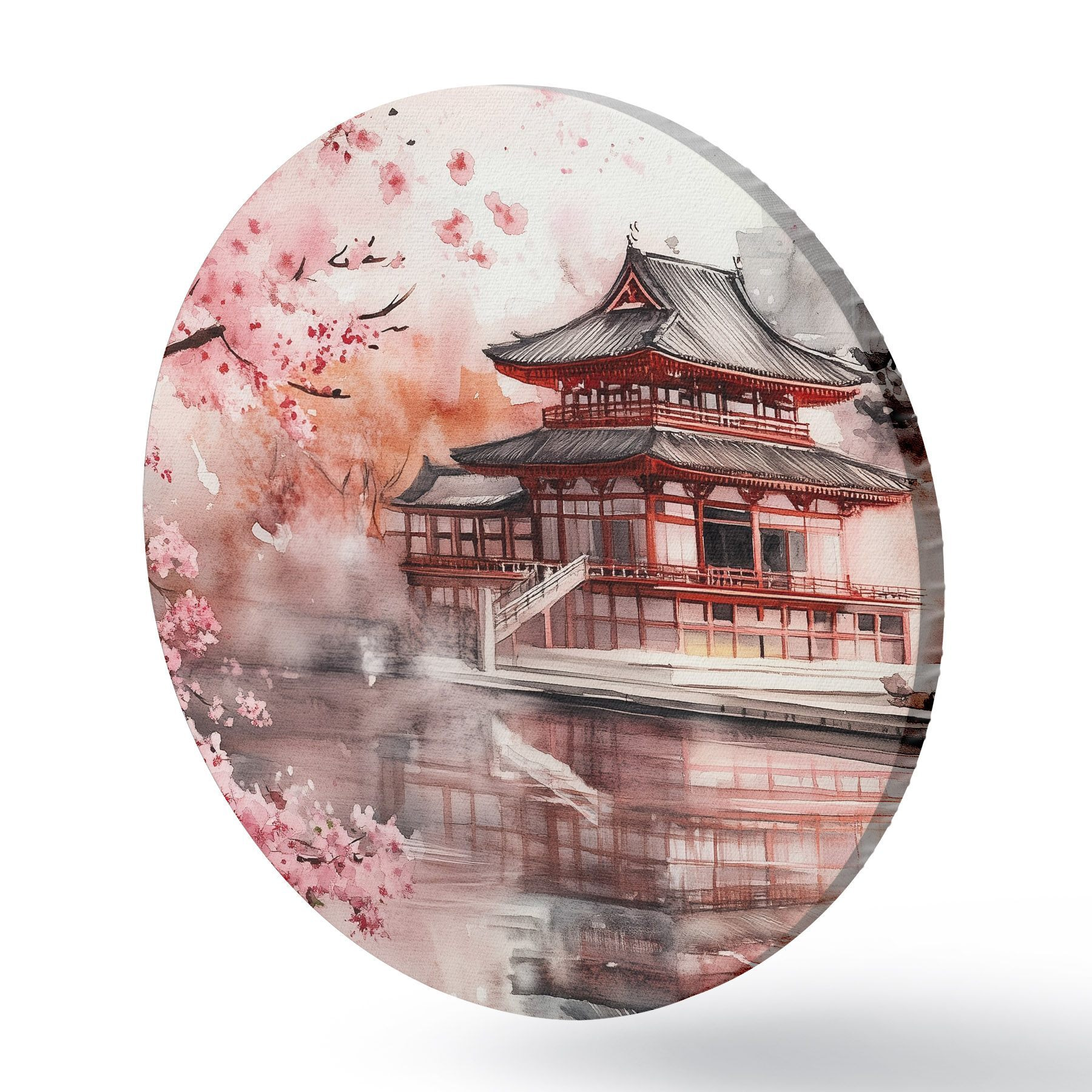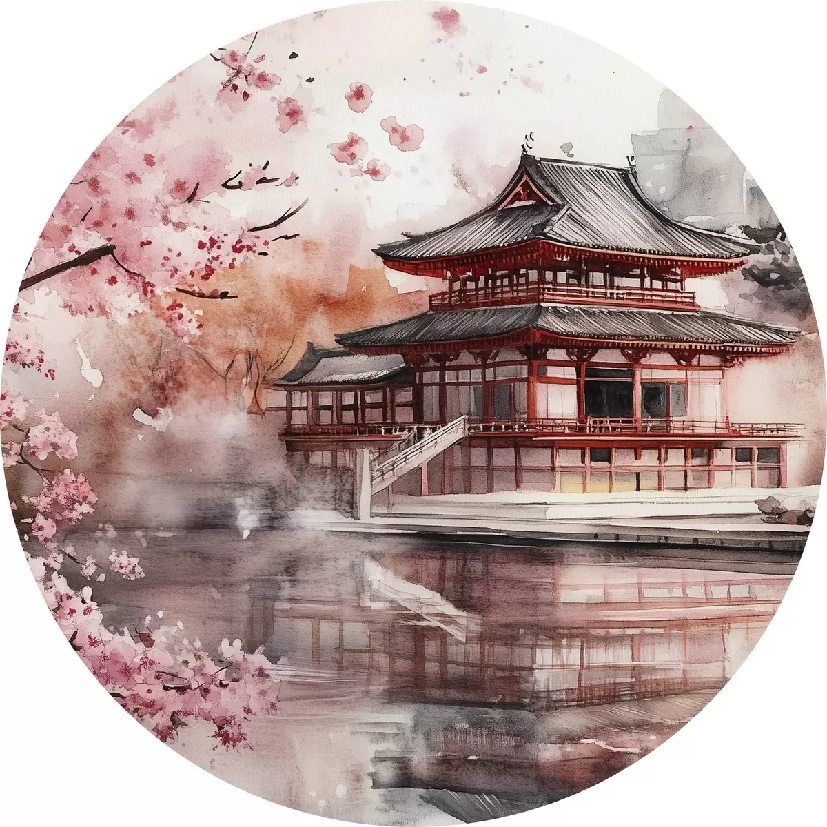 Ronde schilderijen Prachtig Japans landschap met bloeiende kersenboom en huis aan het meer r44310