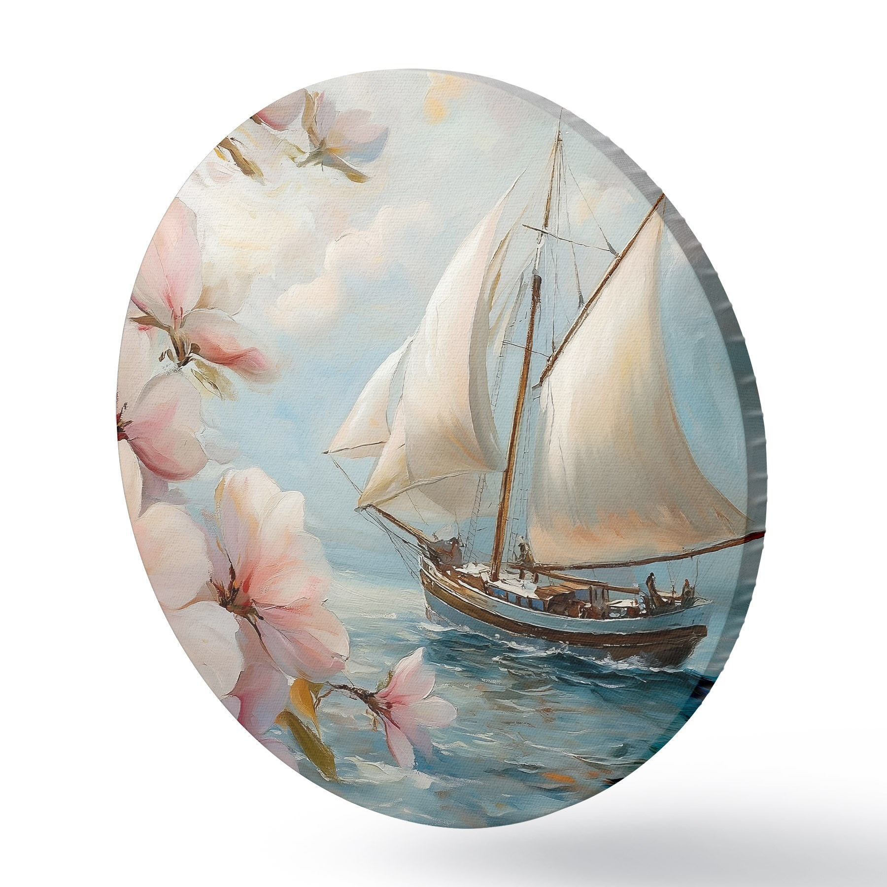 Ronde schilderijen Boot op zee en grote bloemen r44330