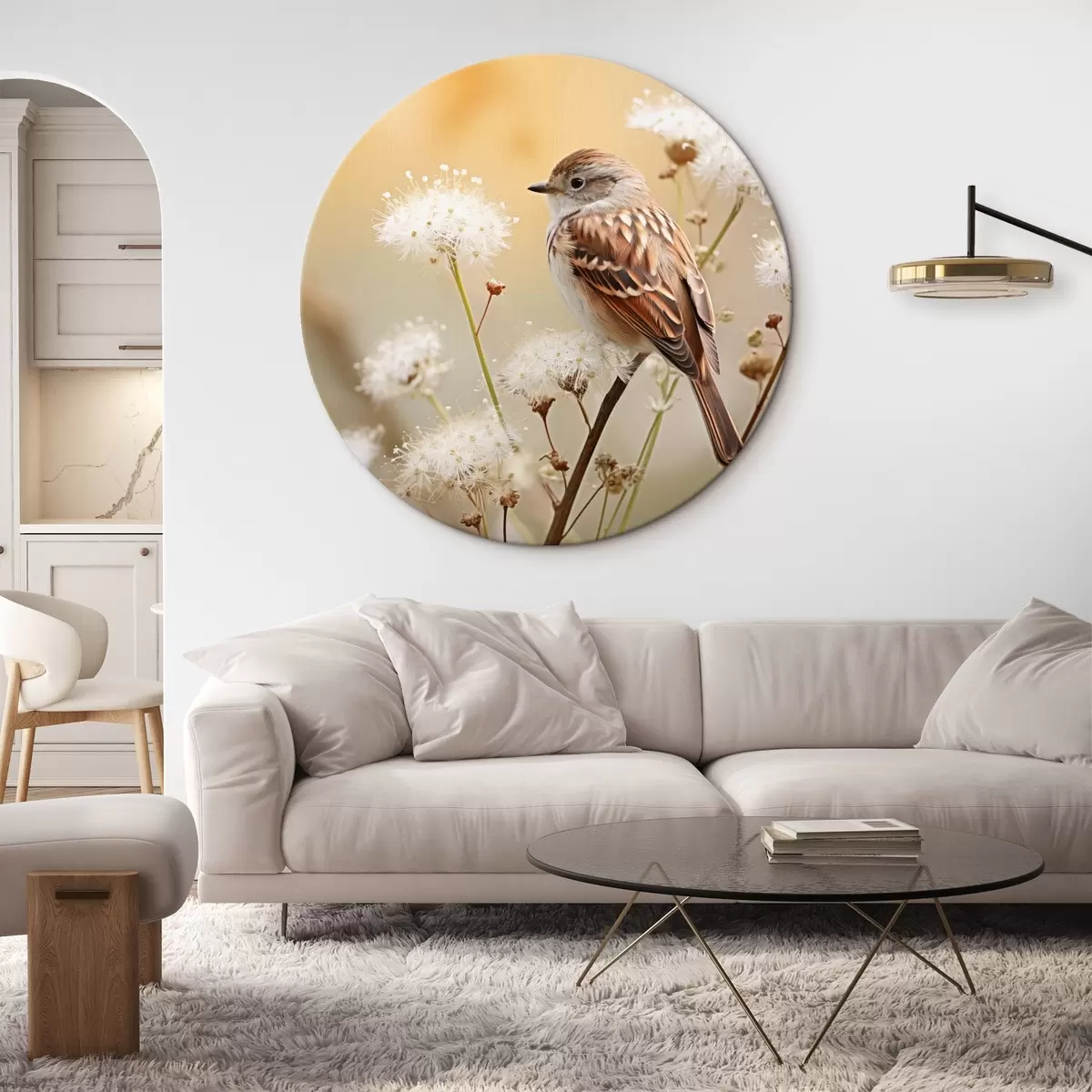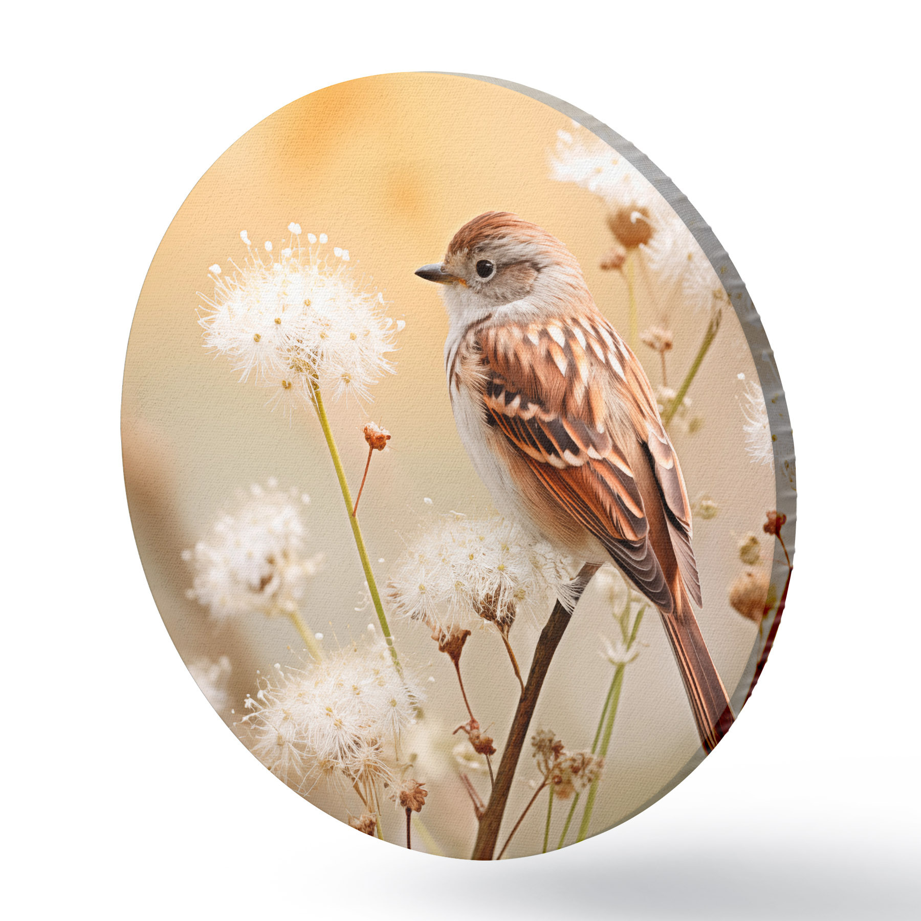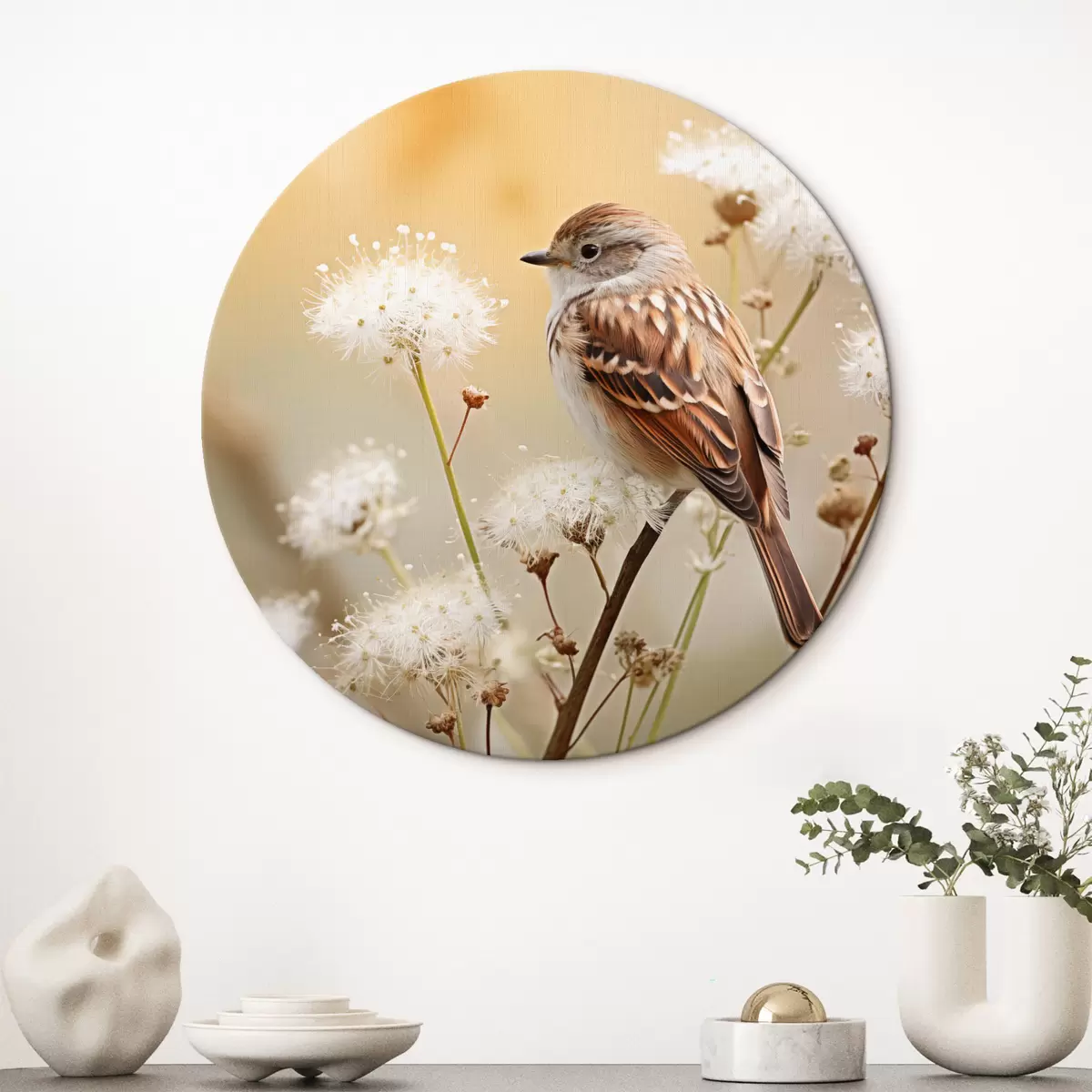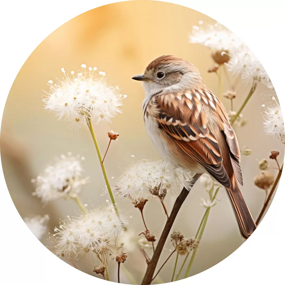 Ronde schilderijen Een vogel neergestreken op een tak met witte bloemen, zachte focus, natuur achtergrond r44393