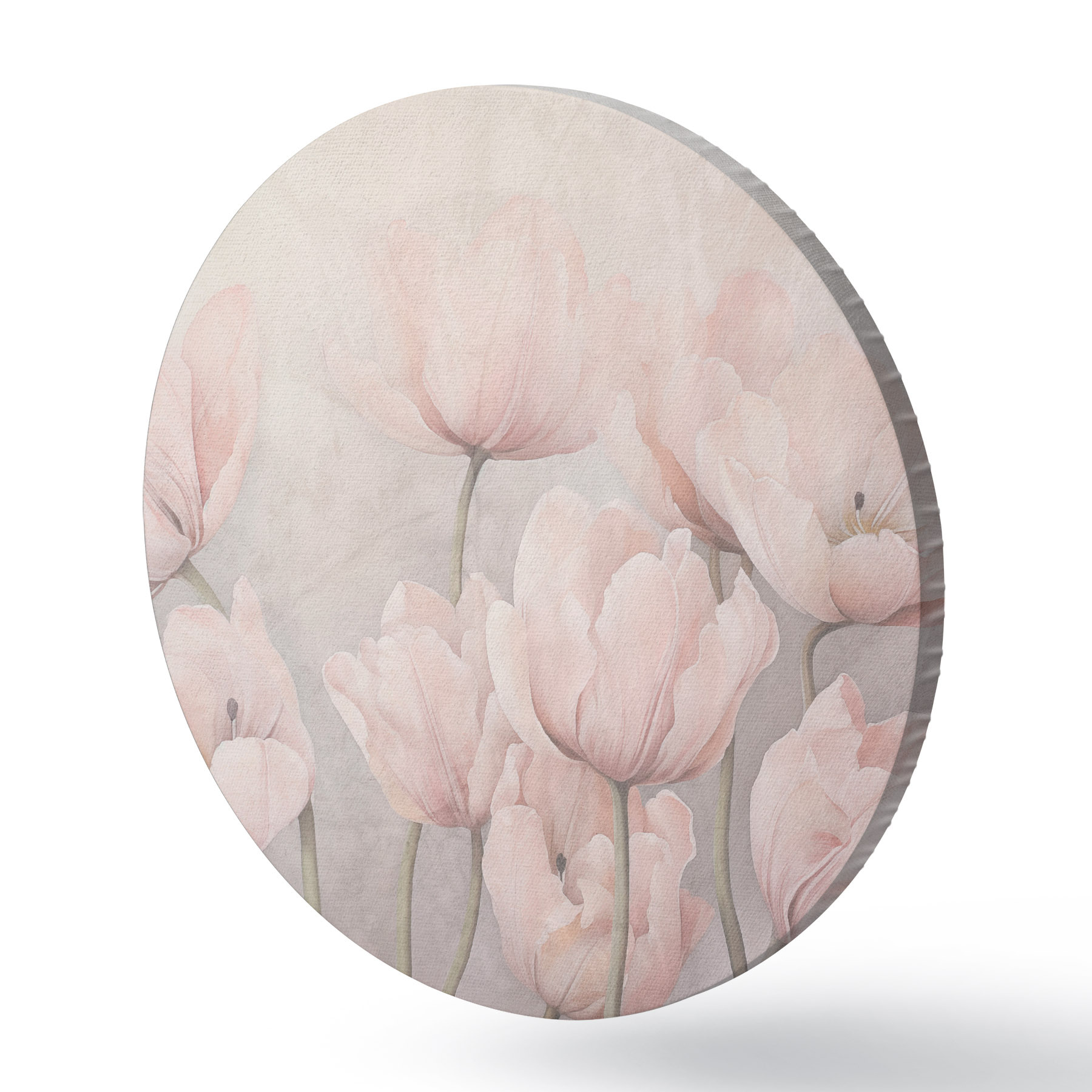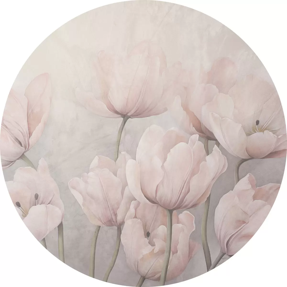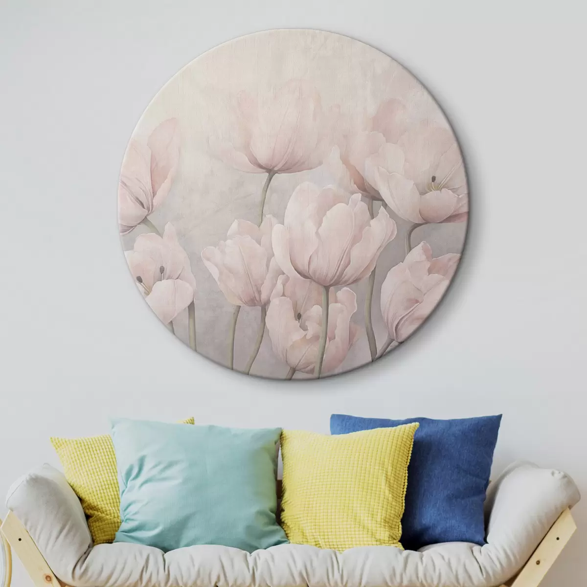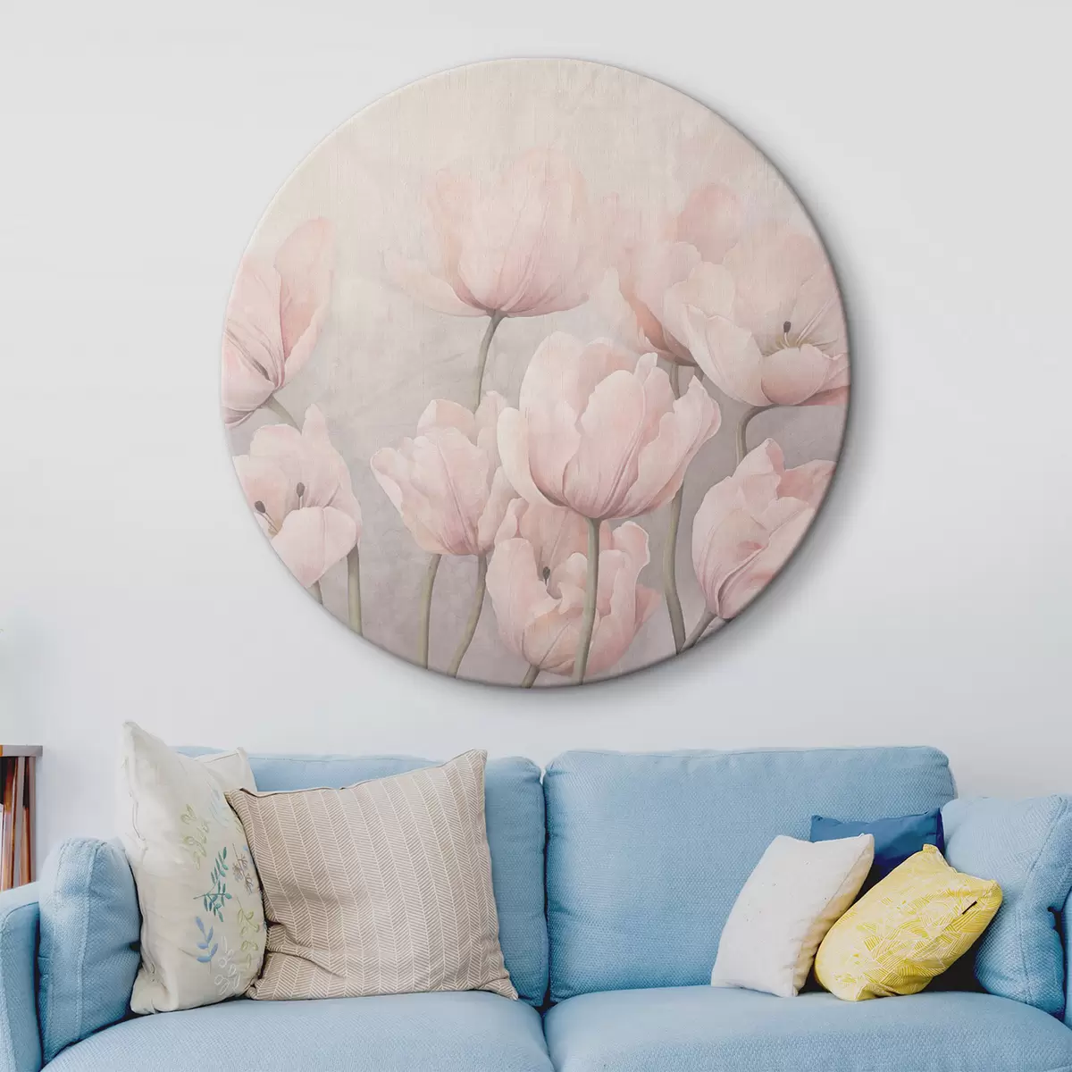 Ronde schilderijen Vintage roze tulpen met lange stelen, zachte gedempte kleuren, lichtgrijze achtergrond r44407