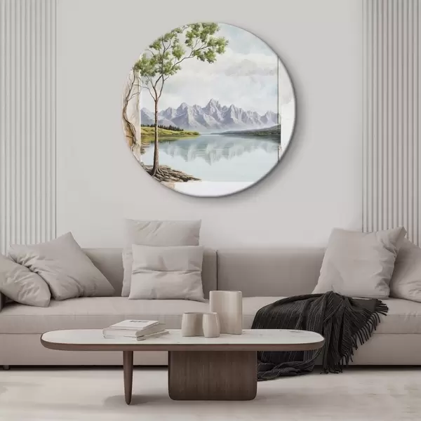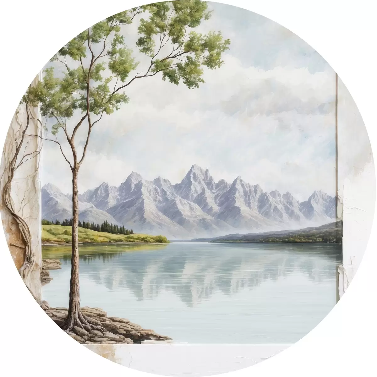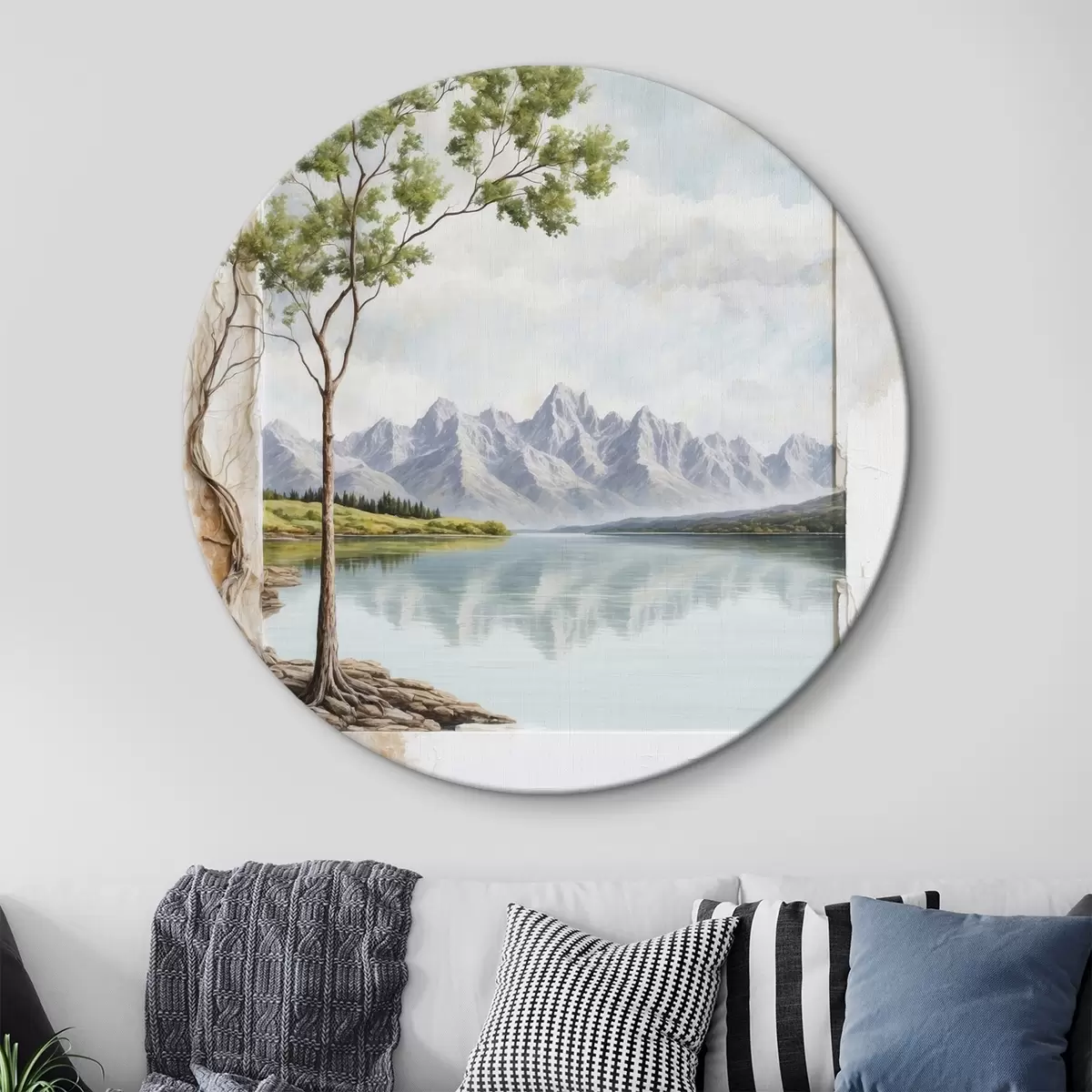 Ronde schilderijen Uitzicht op meer en besneeuwde bergen in frame r44458