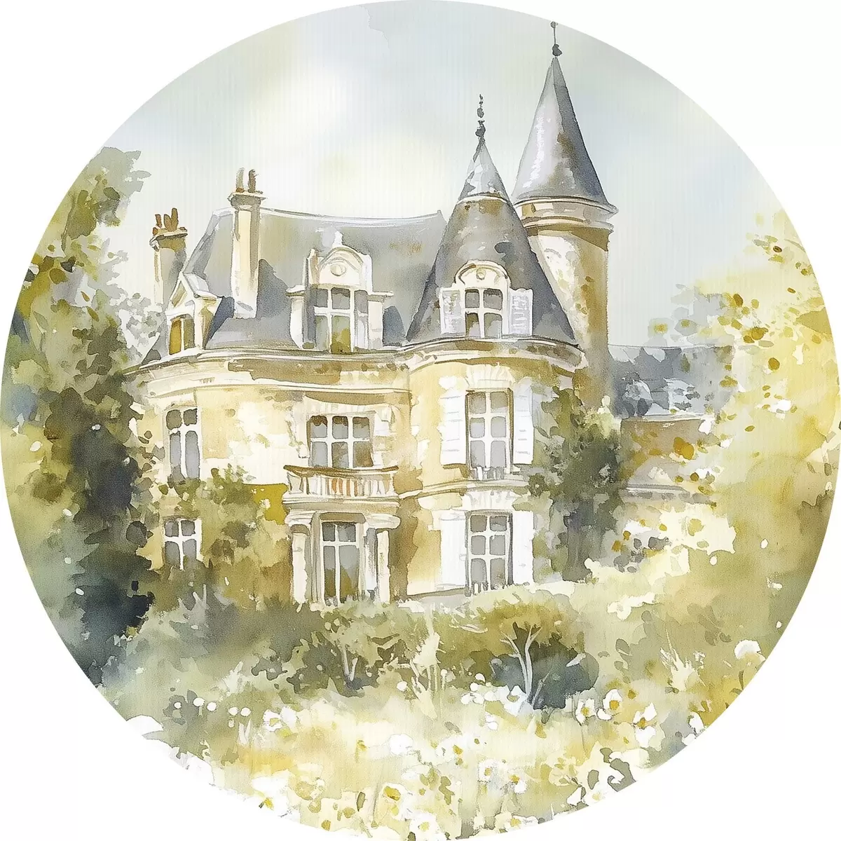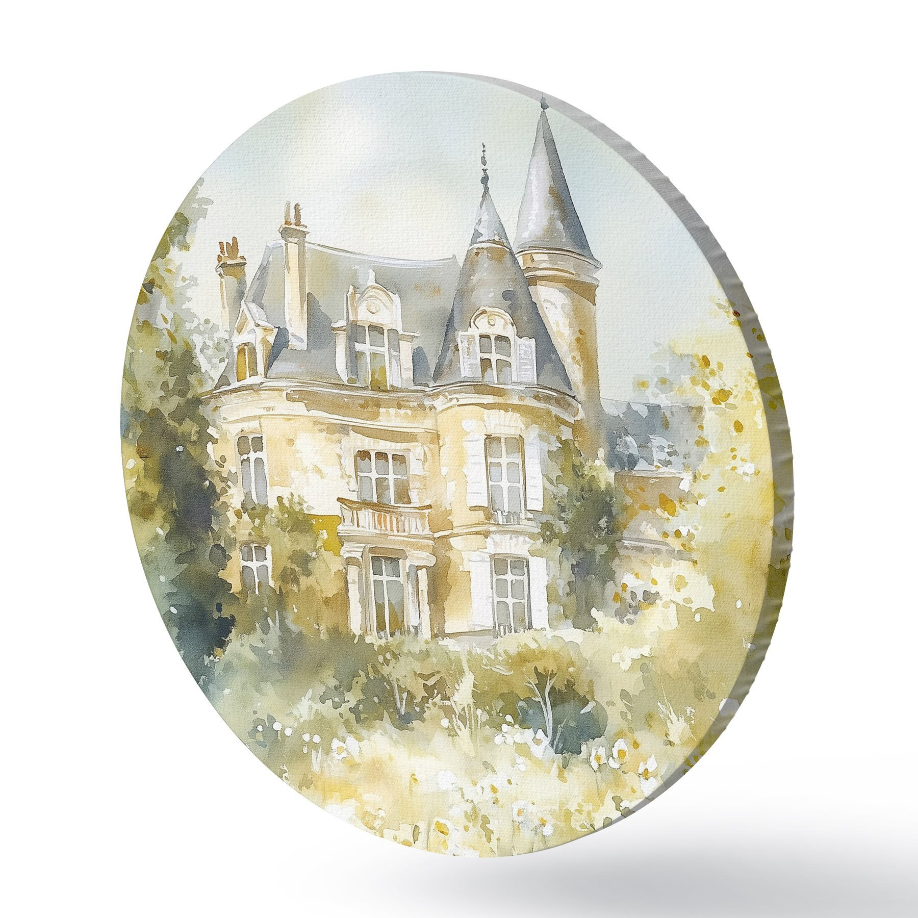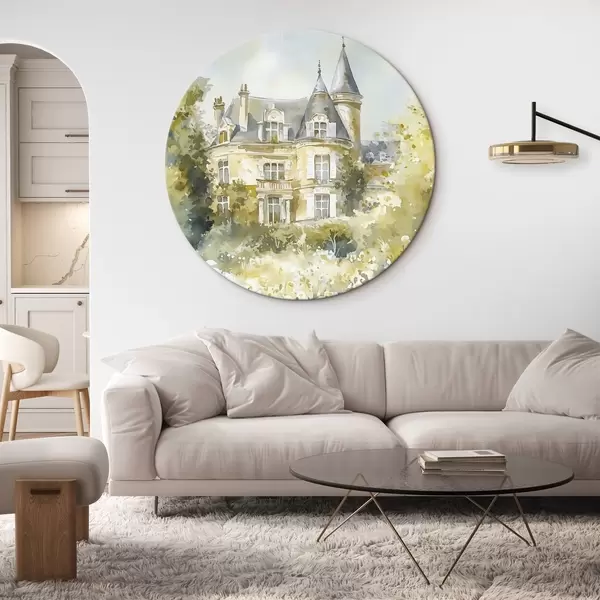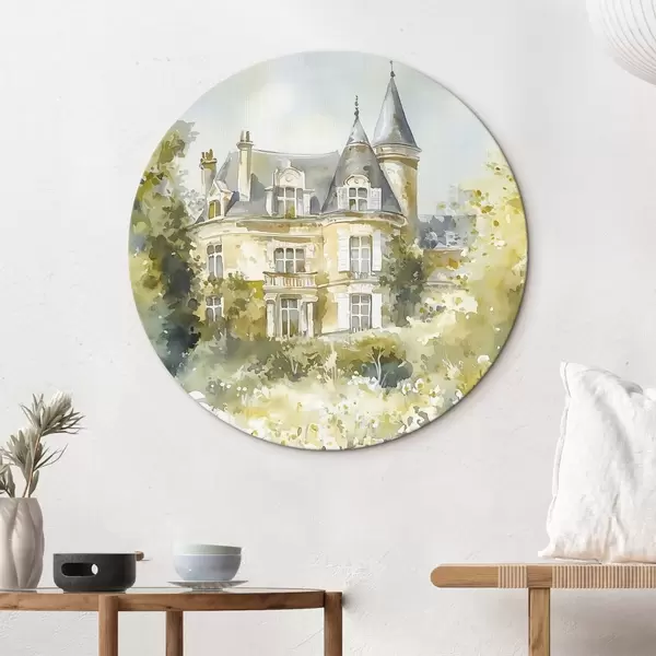 Ronde schilderijen Prachtig kasteel met groen en witte bloemen, aquarelstijl r44506
