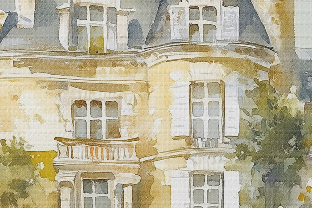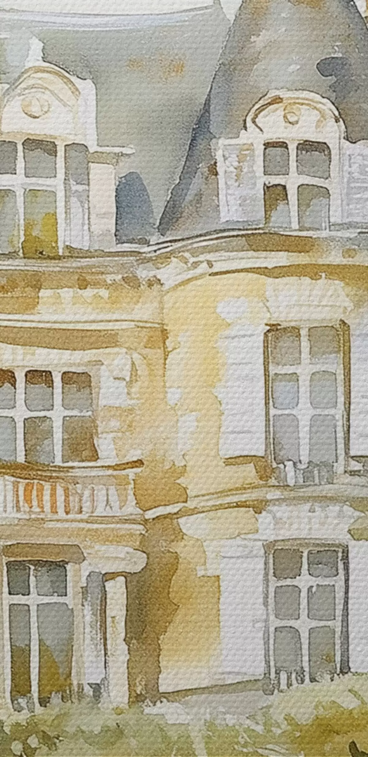 Afbeelding Prachtig kasteel met groen en witte bloemen, aquarelstijl Nr r44506