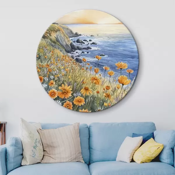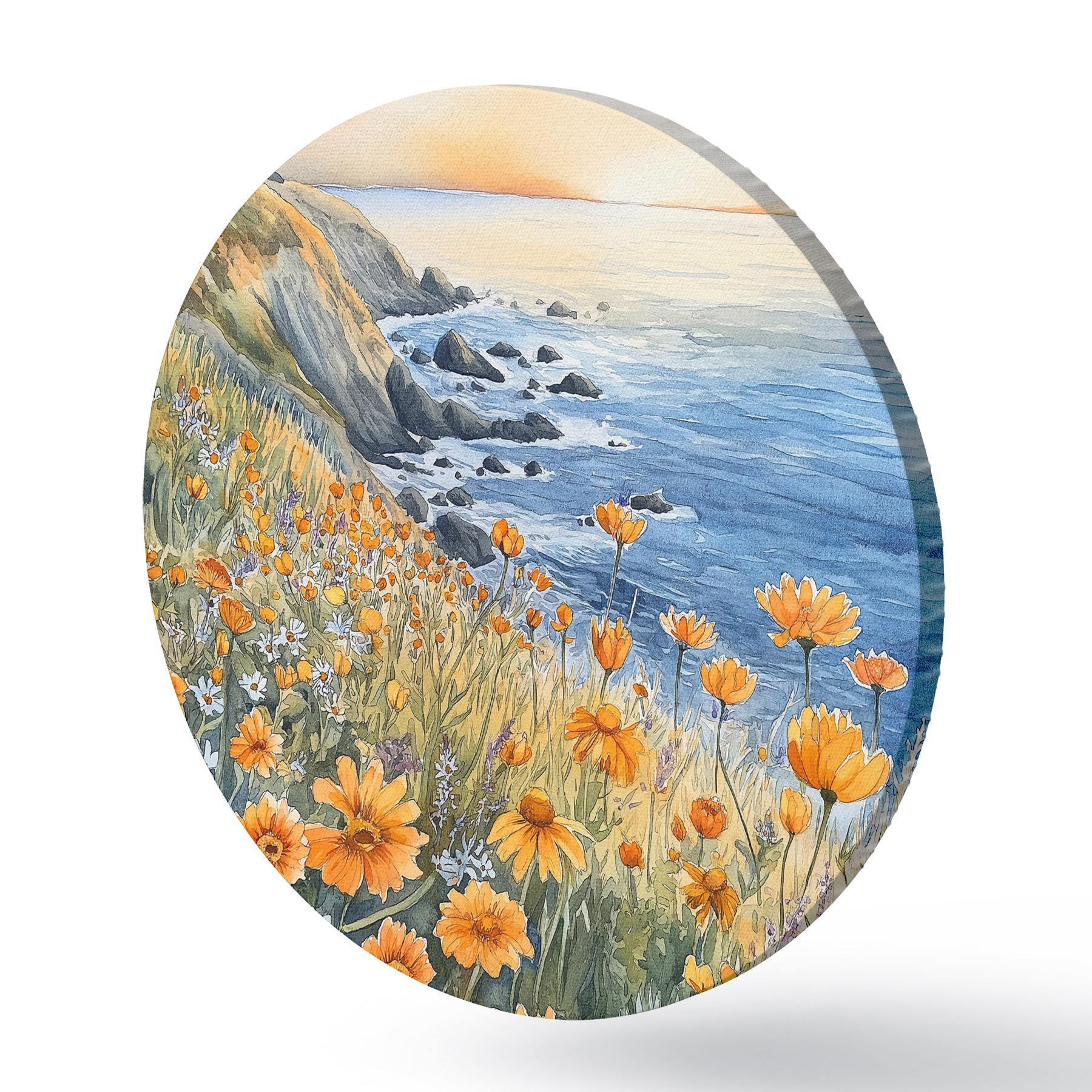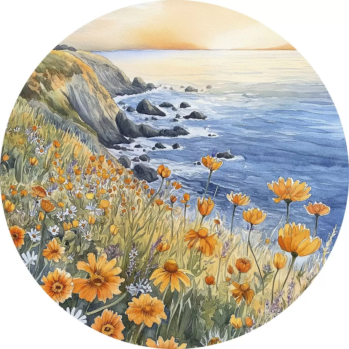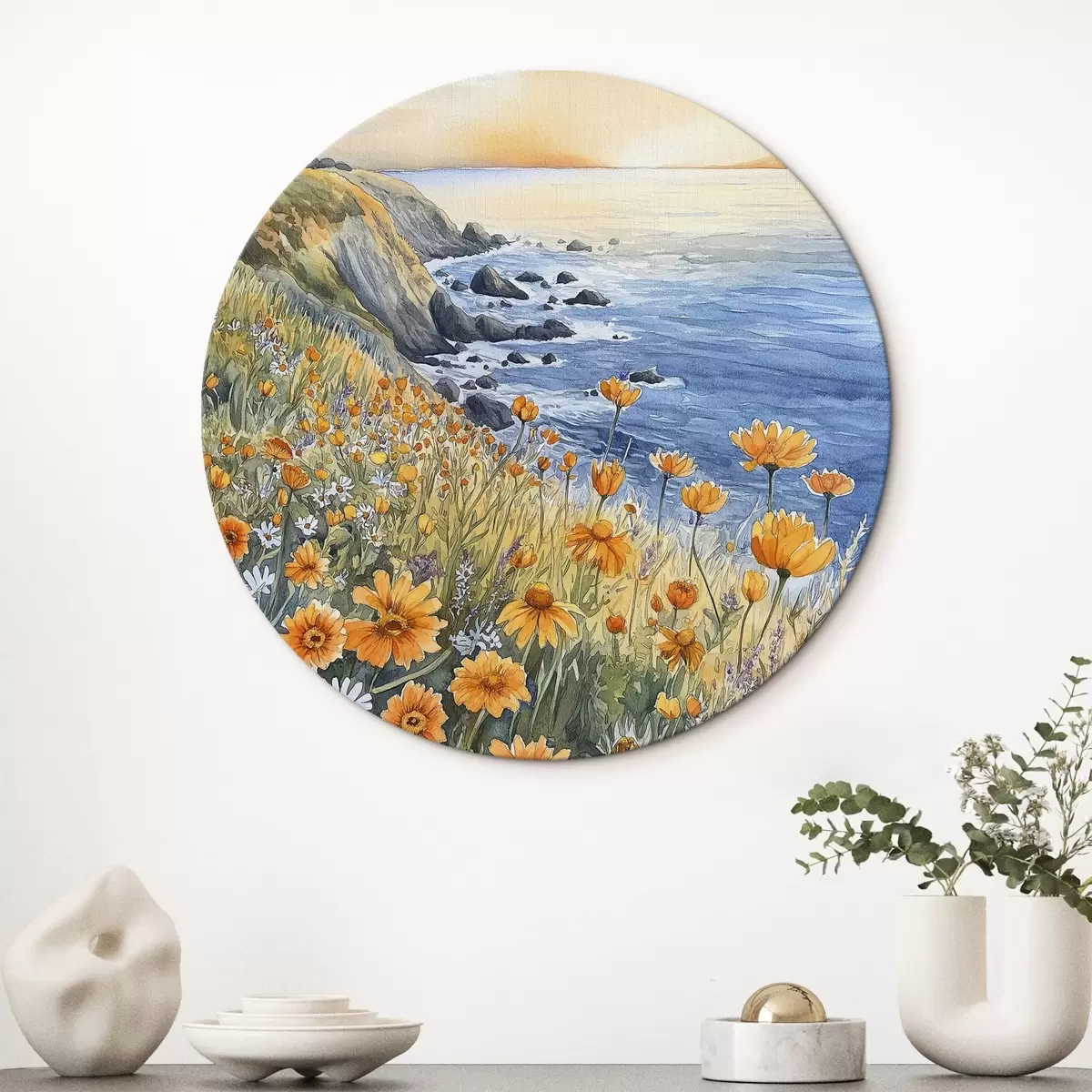 Ronde schilderijen Klif met oranje bloemen, oceaankust, Portugal, aquarelstijl r44604