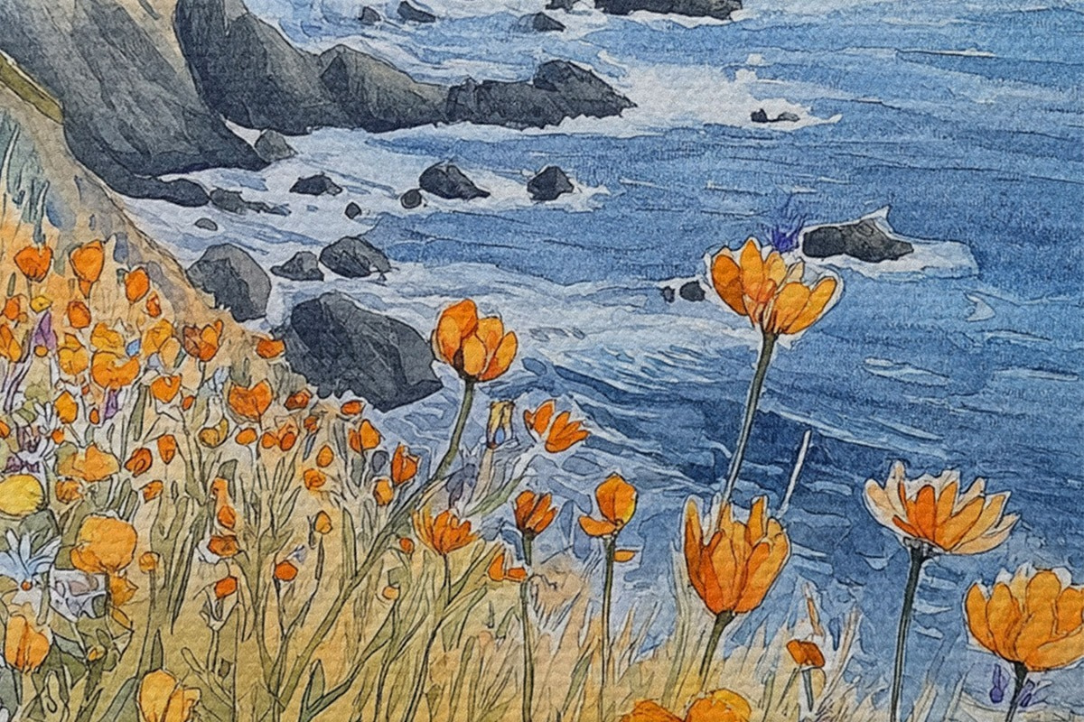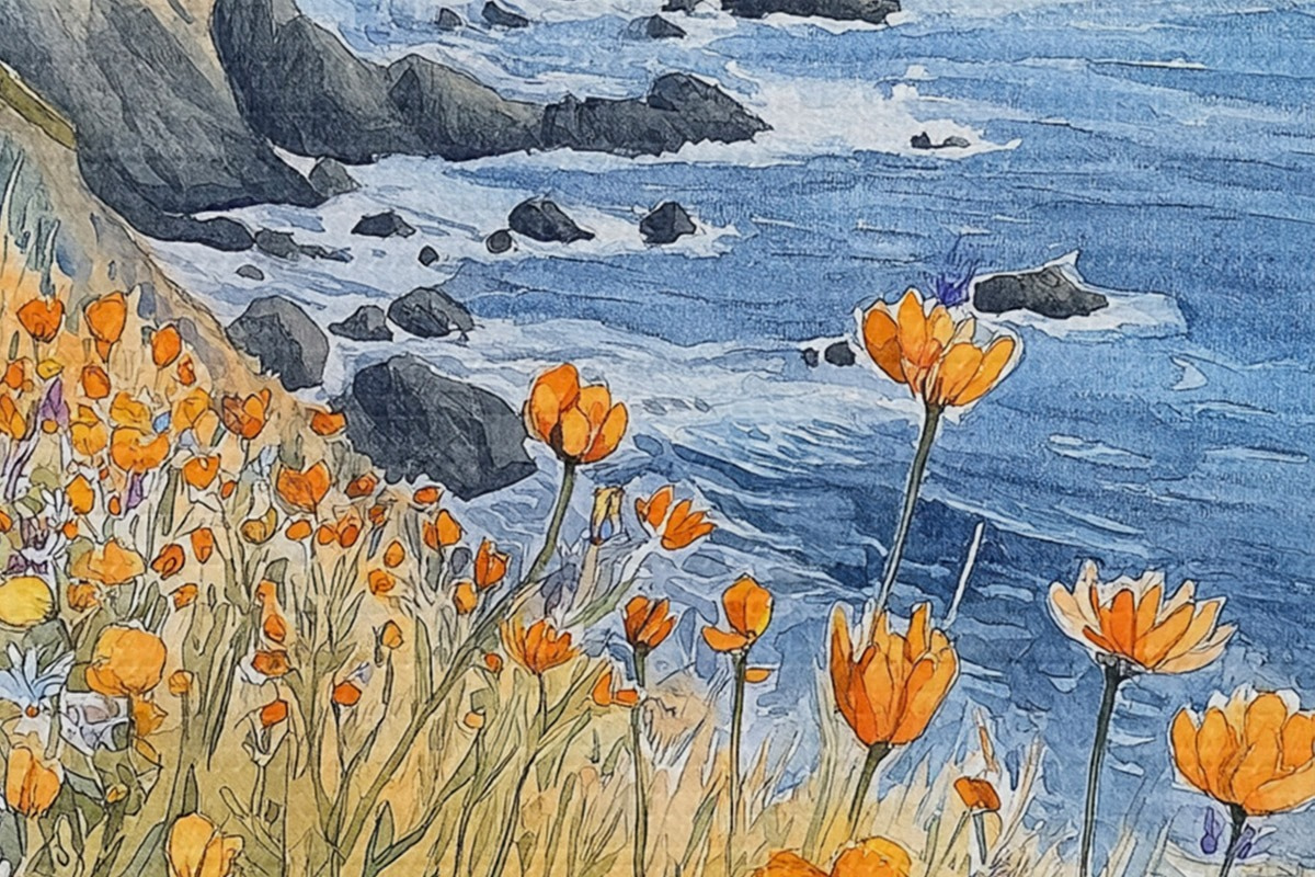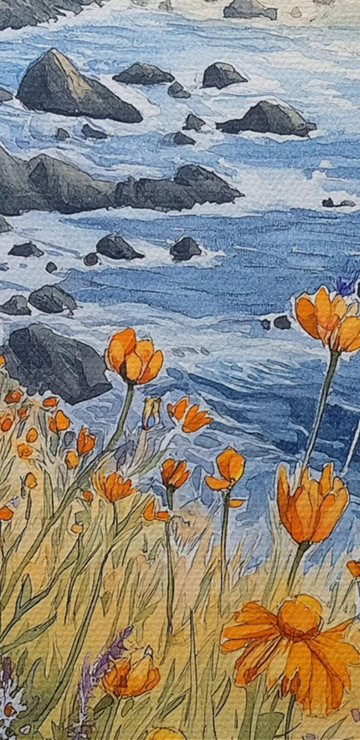 Afbeelding Klif met oranje bloemen, oceaankust, Portugal, aquarelstijl Nr r44604