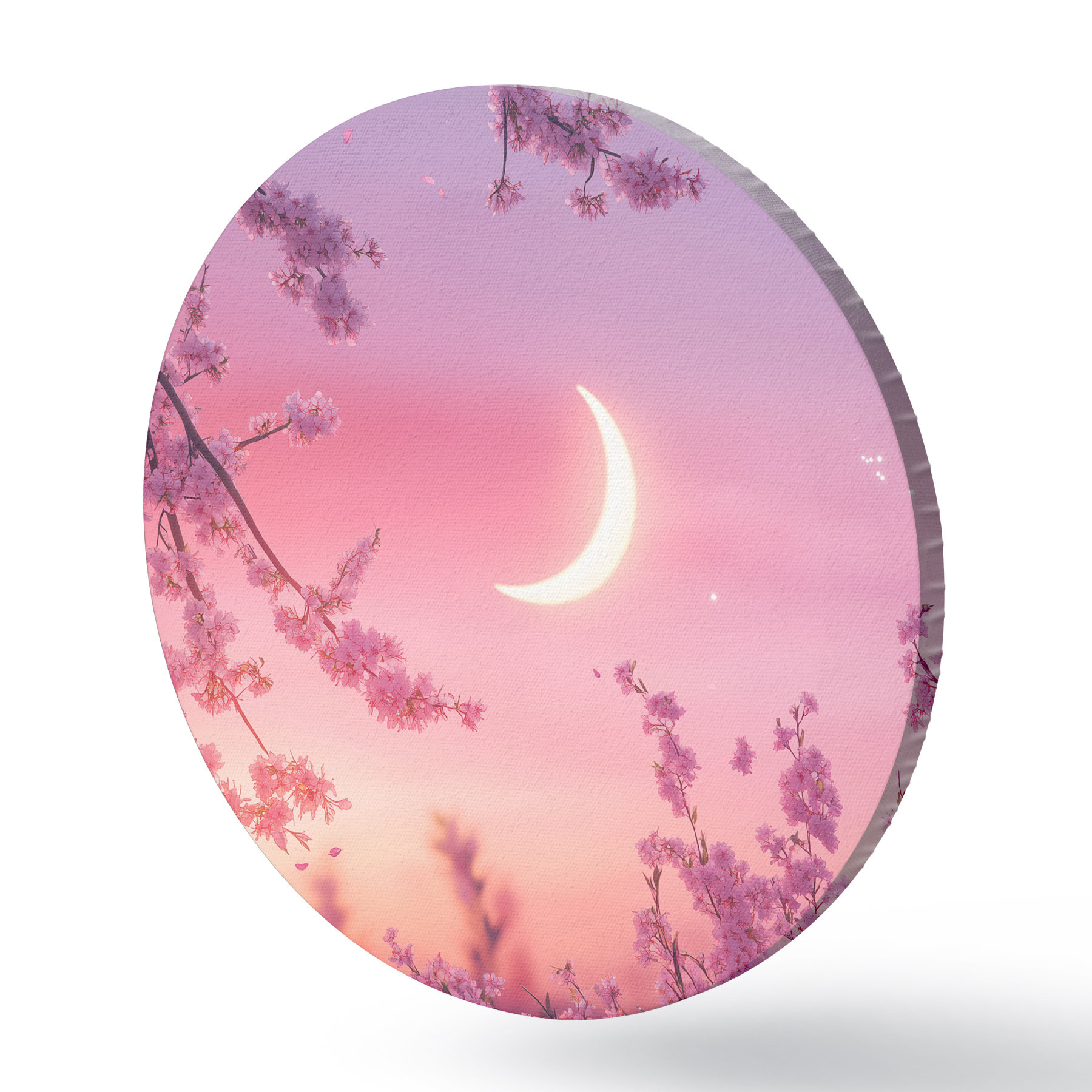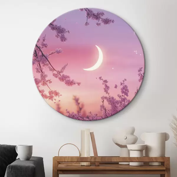 Ronde schilderijen Kersenbloesem, roze lucht met stralende maan, realisme r44715