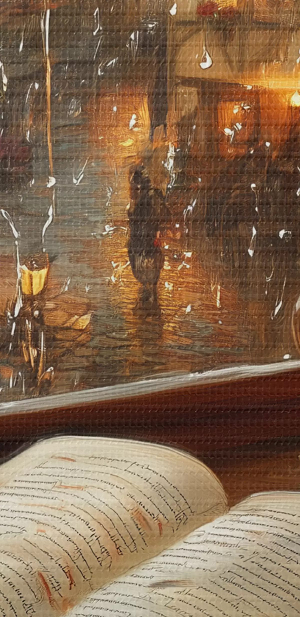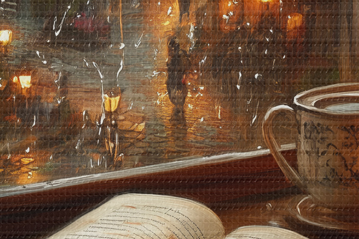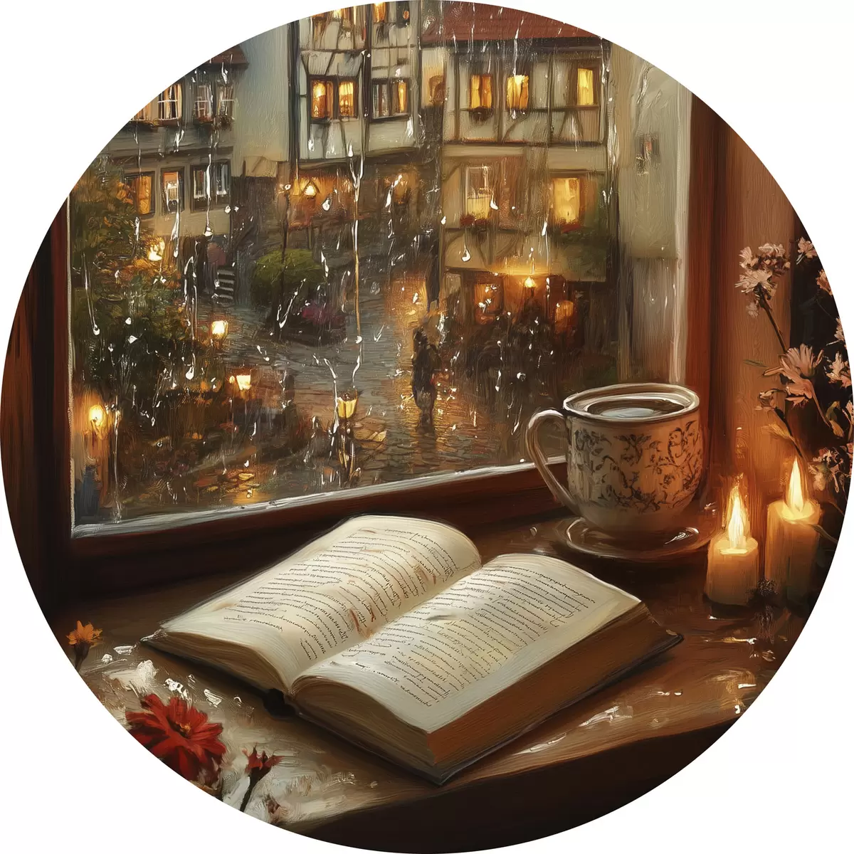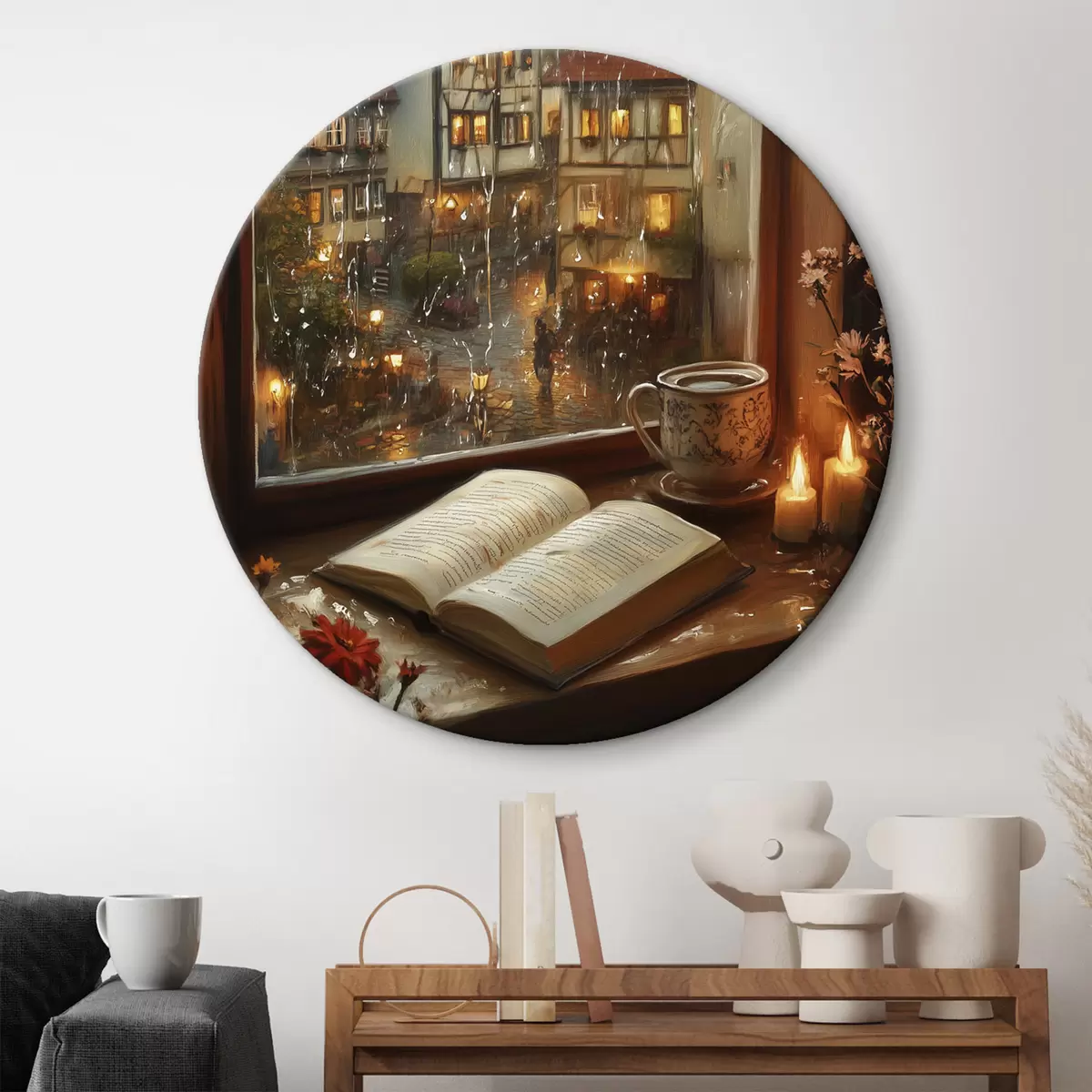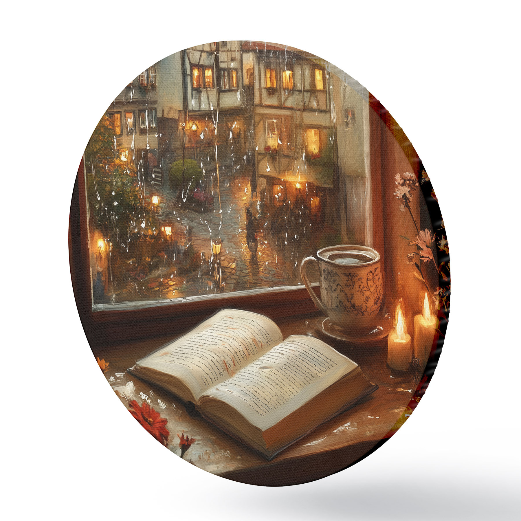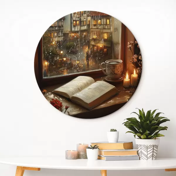 Ronde schilderijen Boek op de vensterbank, kaarsen, regenachtige dag, gezellig r44722