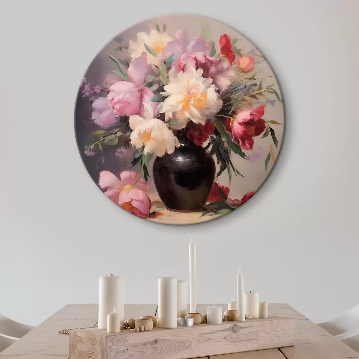 Ronde schilderijen Boeket pioenrozen in een donkere vaas r44769