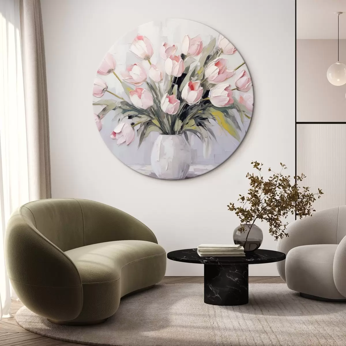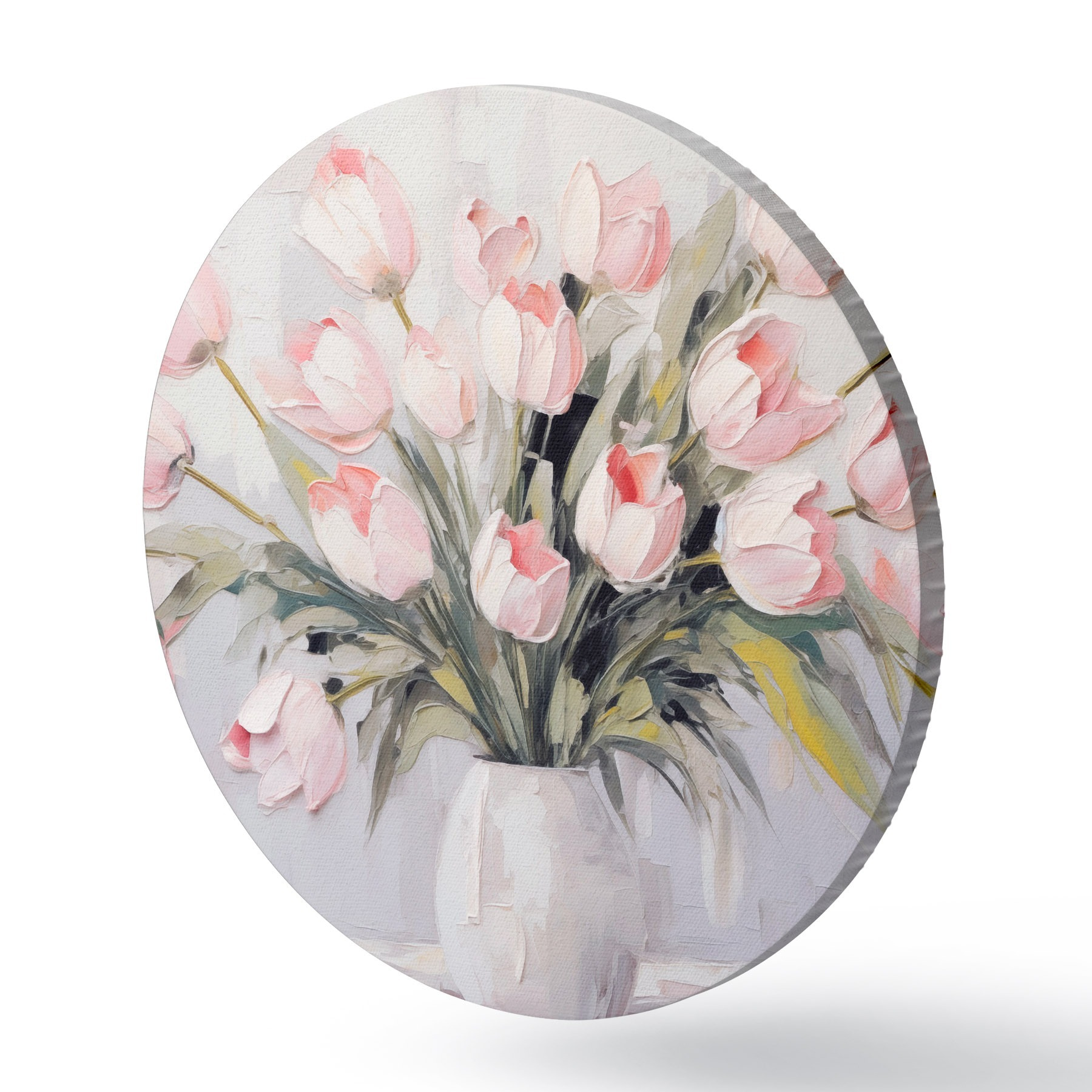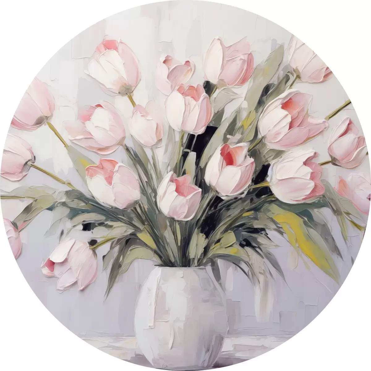 Ronde schilderijen Een vaas met roze tulpen, groene bladeren, lichtgrijze achtergrond , olieverfschilderij stijl, dikke penseelstreken r44852