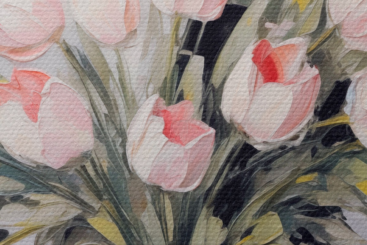 Afbeelding Een vaas met roze tulpen, groene bladeren, lichtgrijze achtergrond , olieverfschilderij stijl, dikke penseelstreken Nr r44852