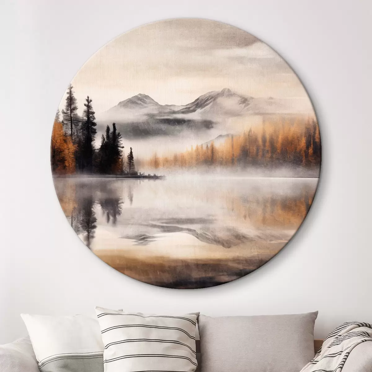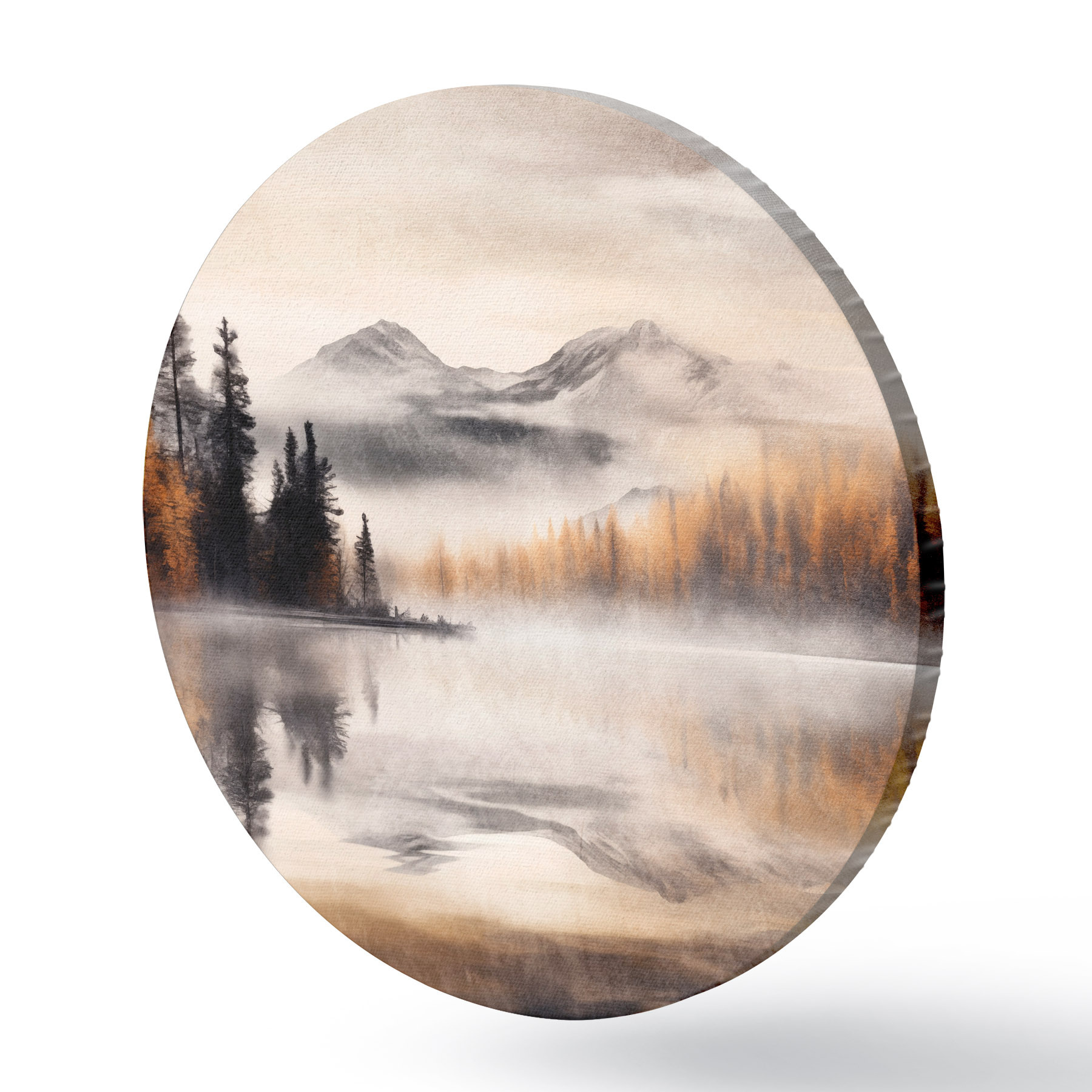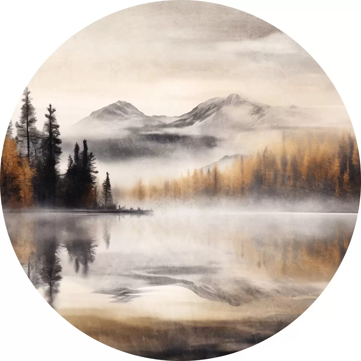 Ronde schilderijen Een mistig meerlandschap met dennenbomen en bergen, bewolkte grijze lucht r44856