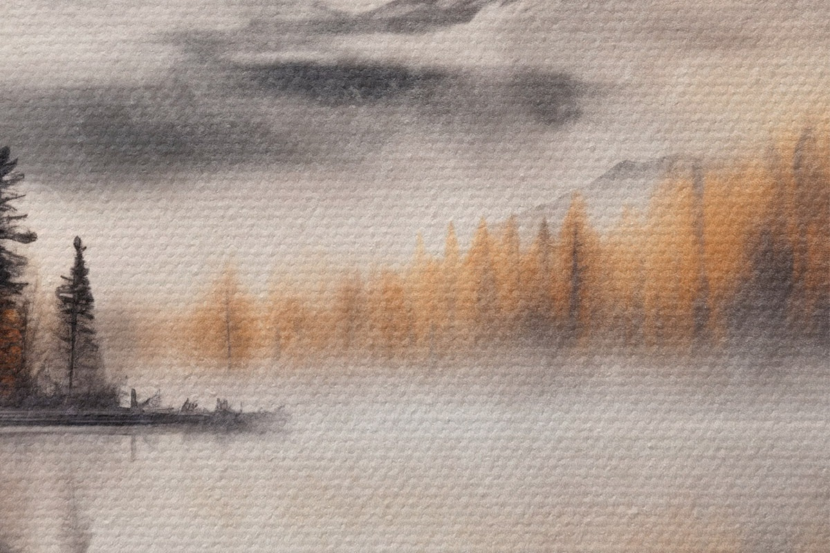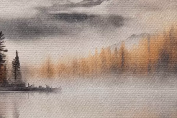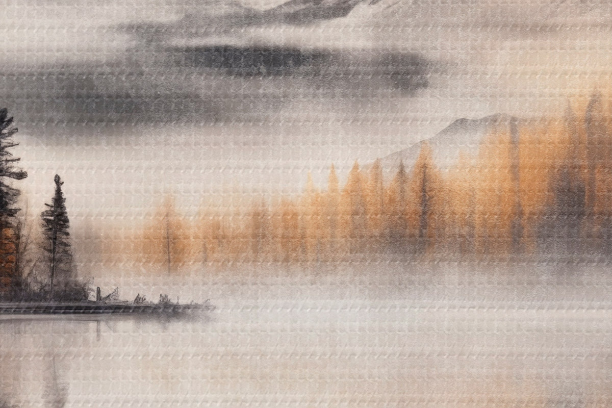 Afbeelding Een mistig meerlandschap met dennenbomen en bergen, bewolkte grijze lucht Nr r44856