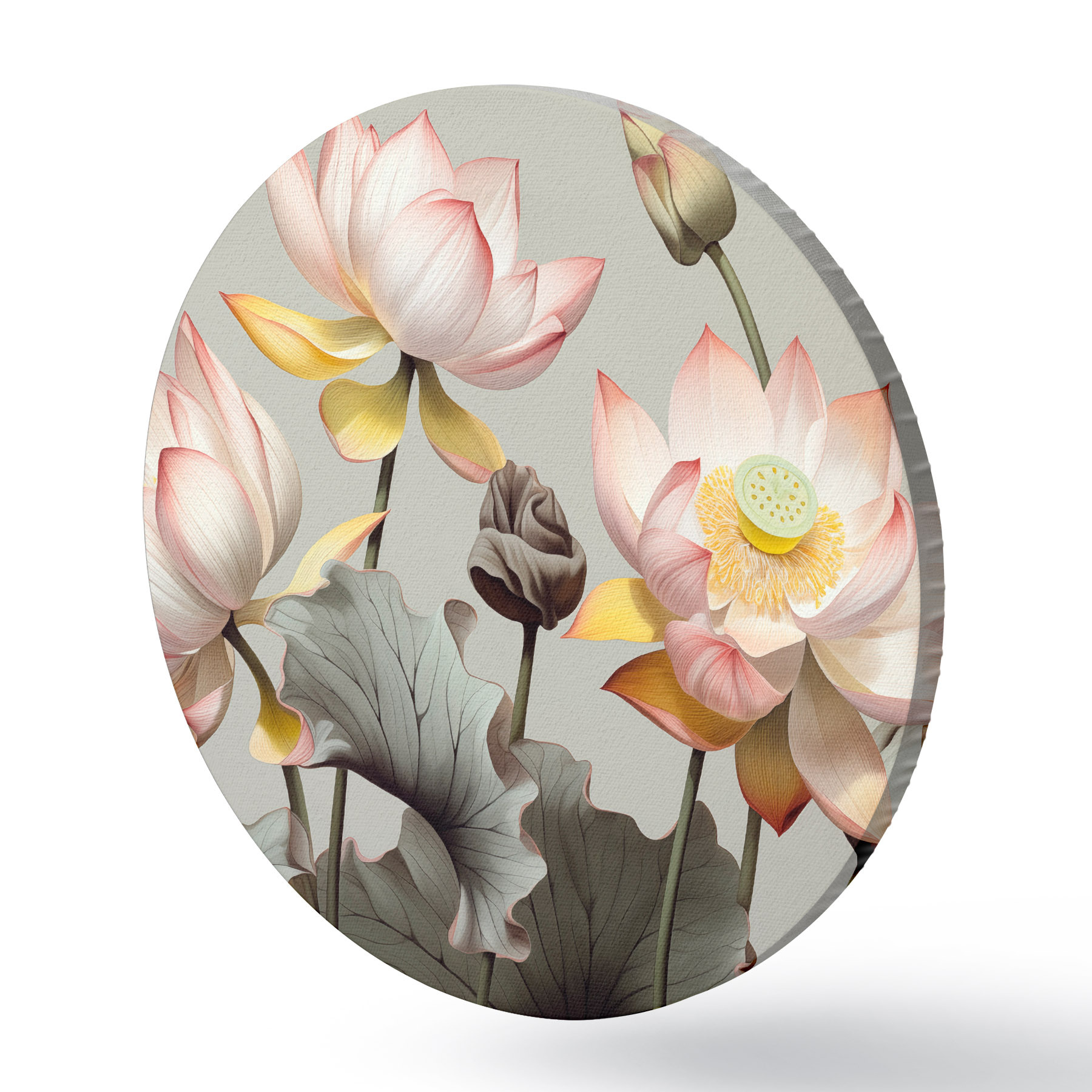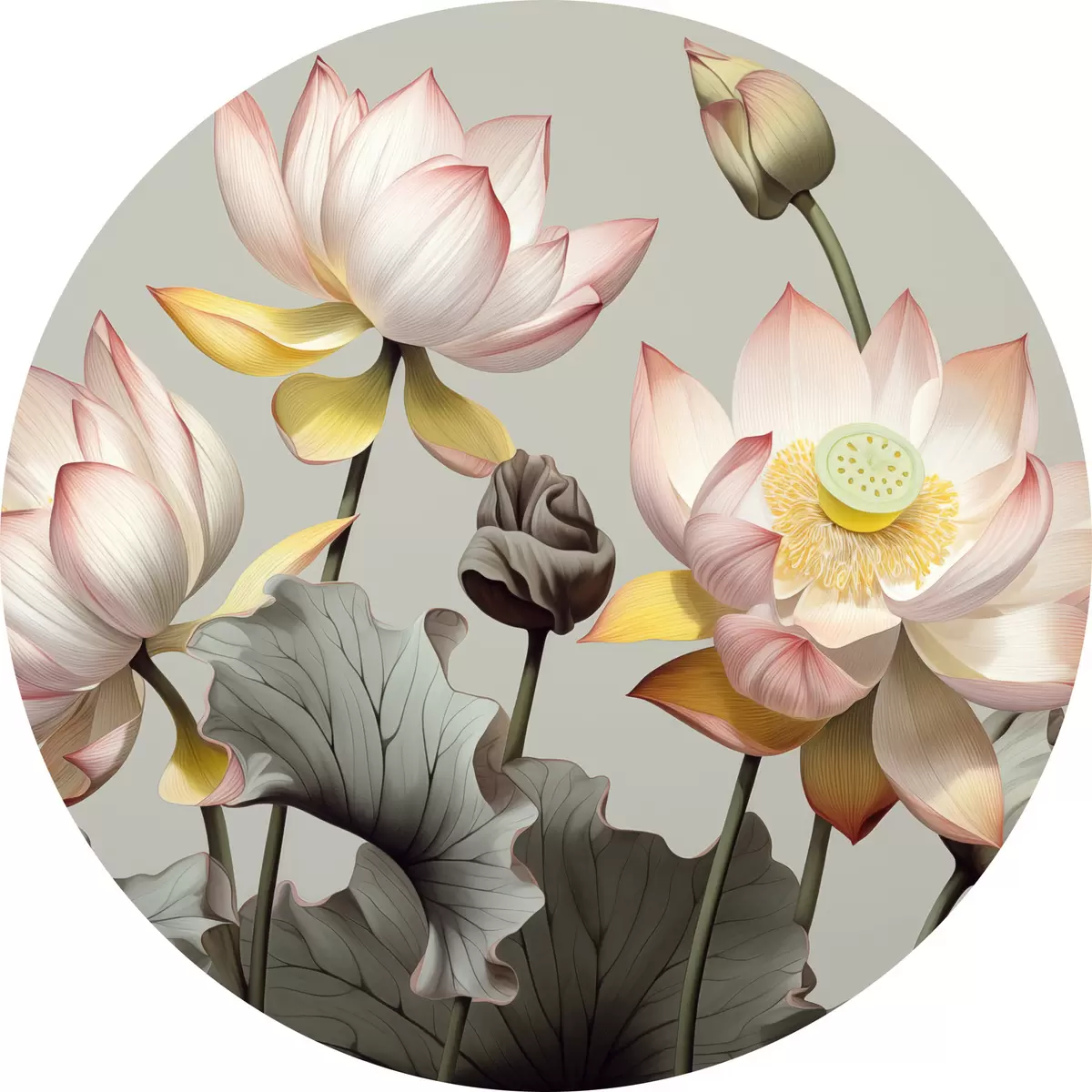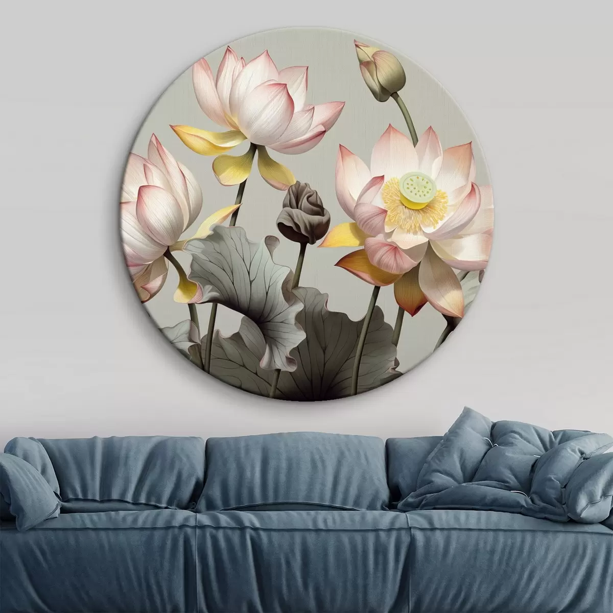 Ronde schilderijen Lotusbloemen met pastelkleurige bloemblaadjes en groene bladeren, in een gedempt kleurenpalet, tegen een effen achtergrond r44862