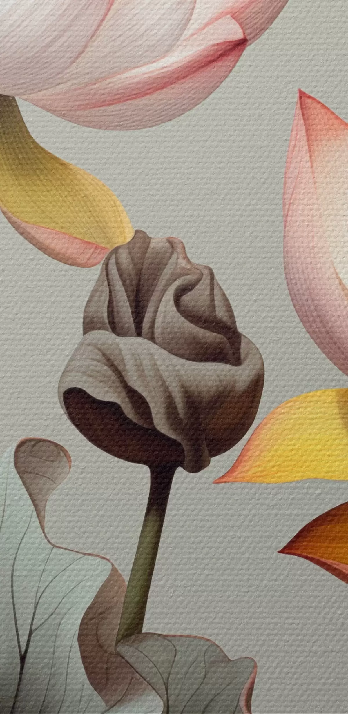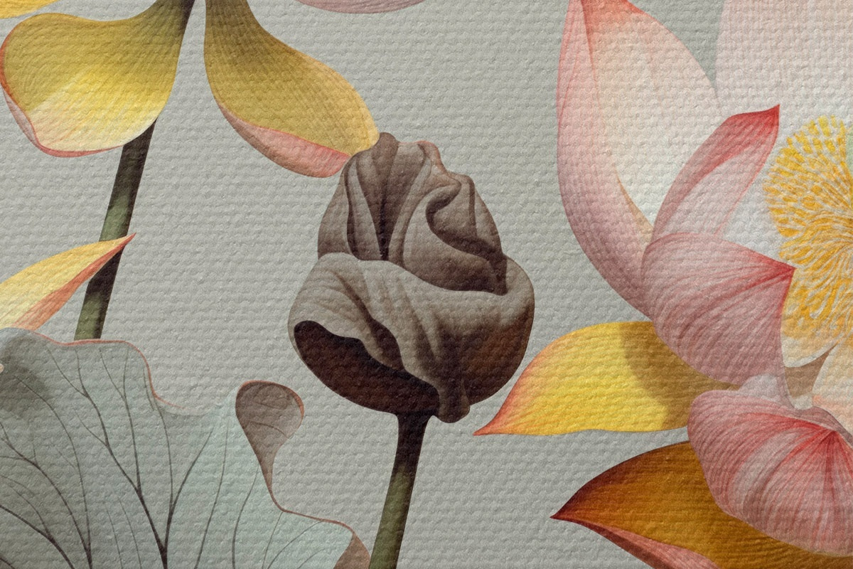 Afbeelding Lotusbloemen met pastelkleurige bloemblaadjes en groene bladeren, in een gedempt kleurenpalet, tegen een effen achtergrond Nr r44862