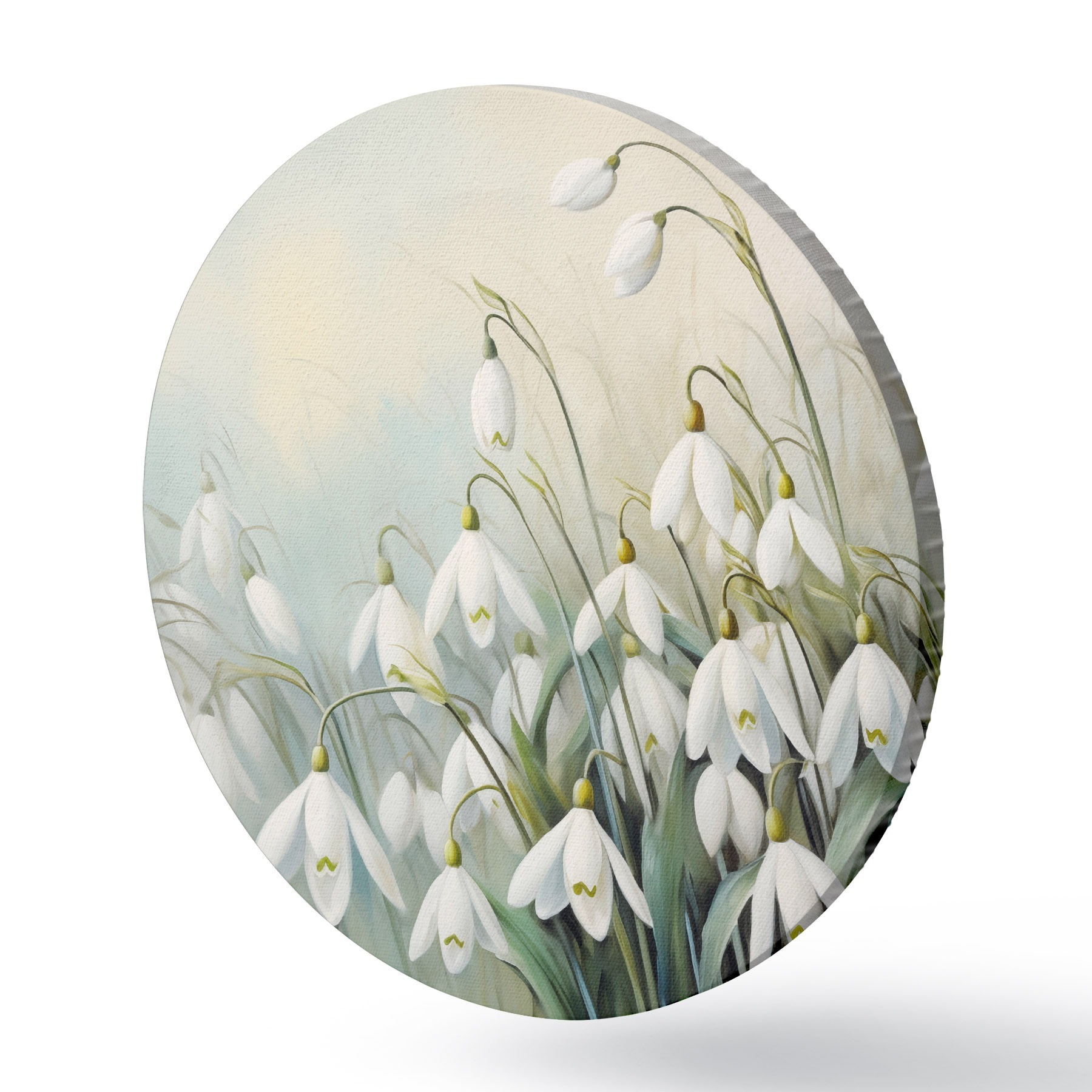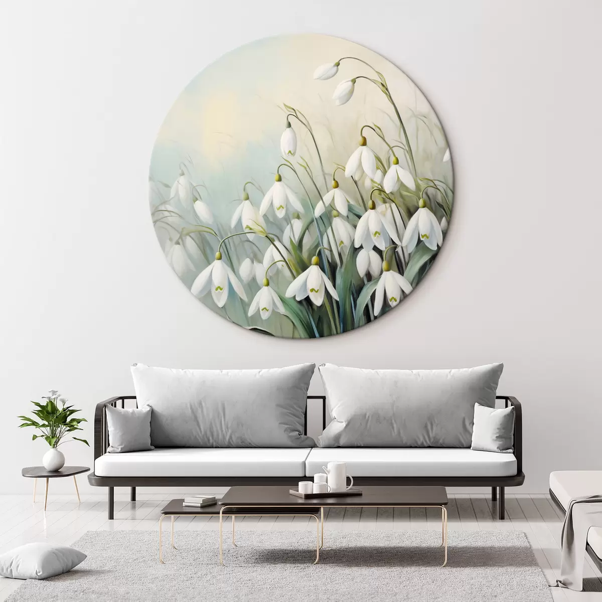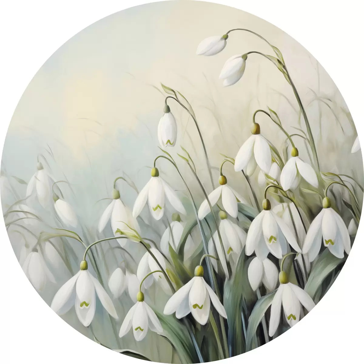 Ronde schilderijen Witte sneeuwklokjesbloemen met blauwe en groene stengels en bladeren, zachte penseelstreken, onscherpe achtergrond r44864