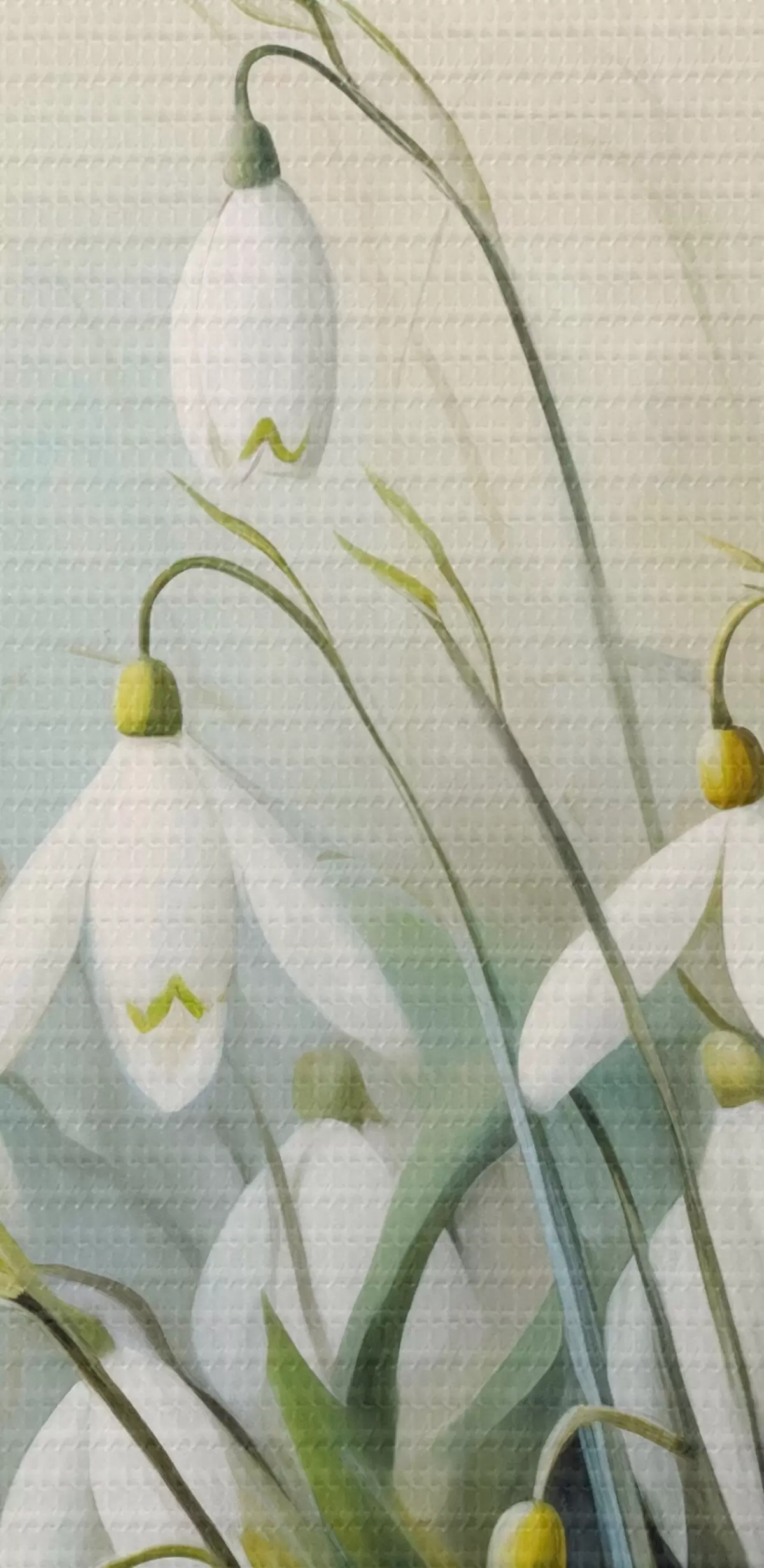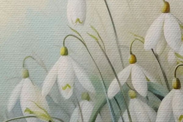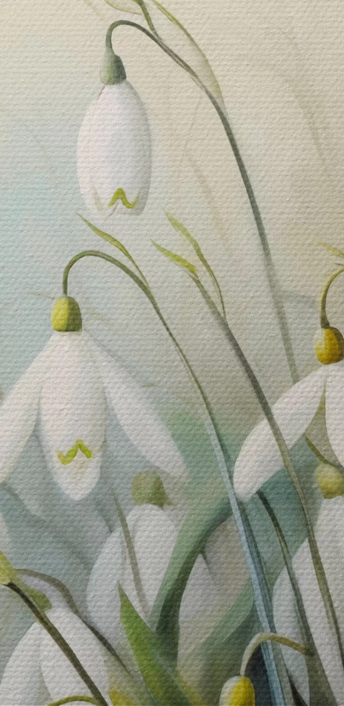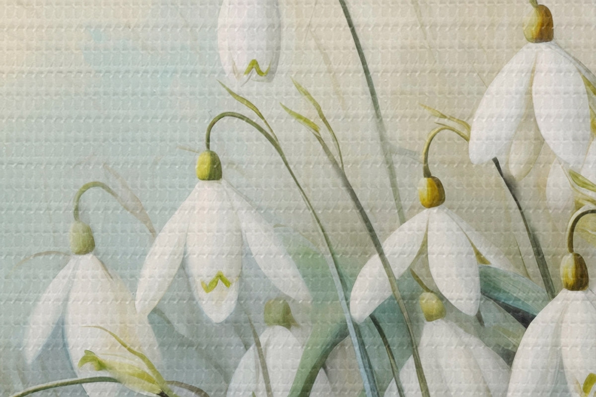 Afbeelding Witte sneeuwklokjesbloemen met blauwe en groene stengels en bladeren, zachte penseelstreken, onscherpe achtergrond Nr r44864