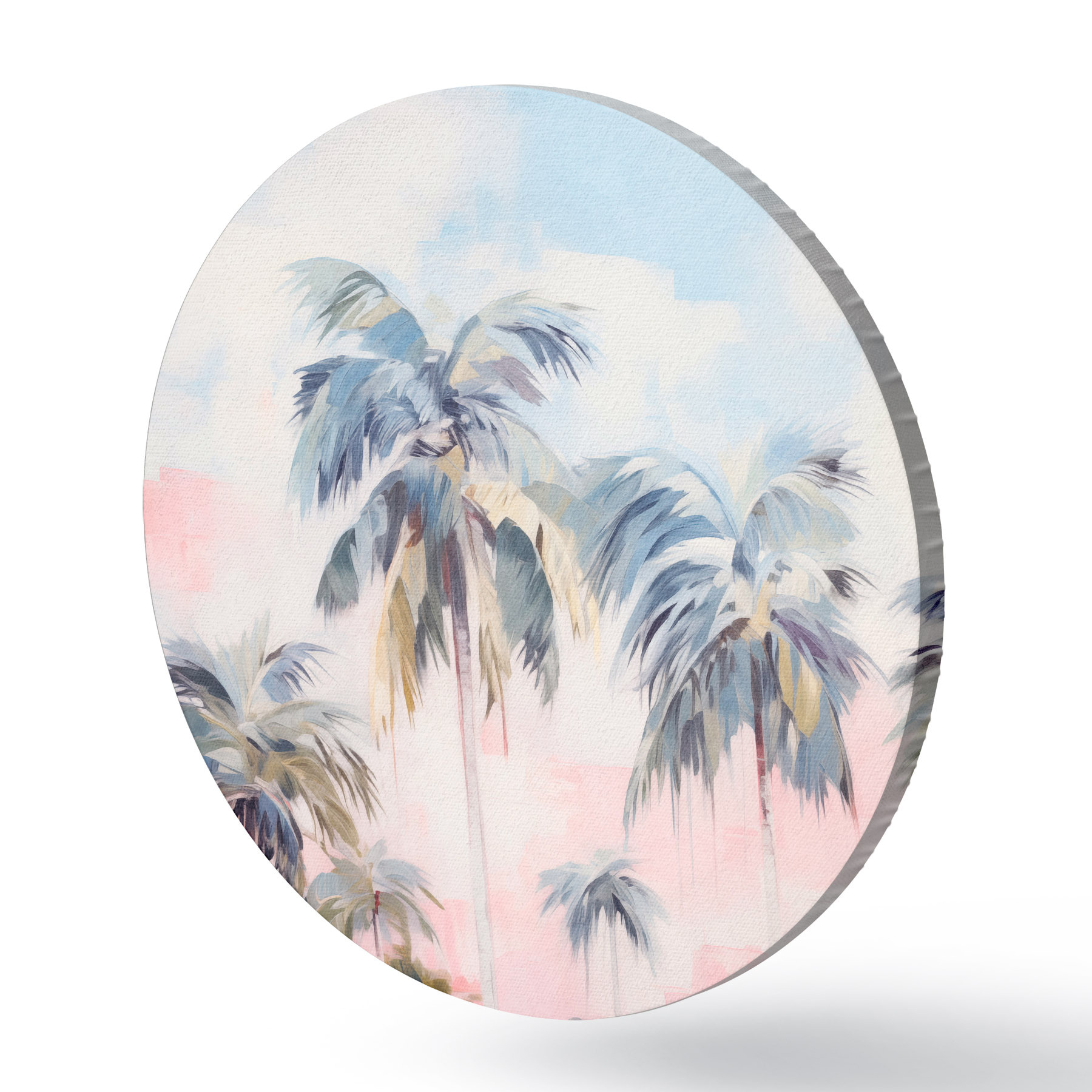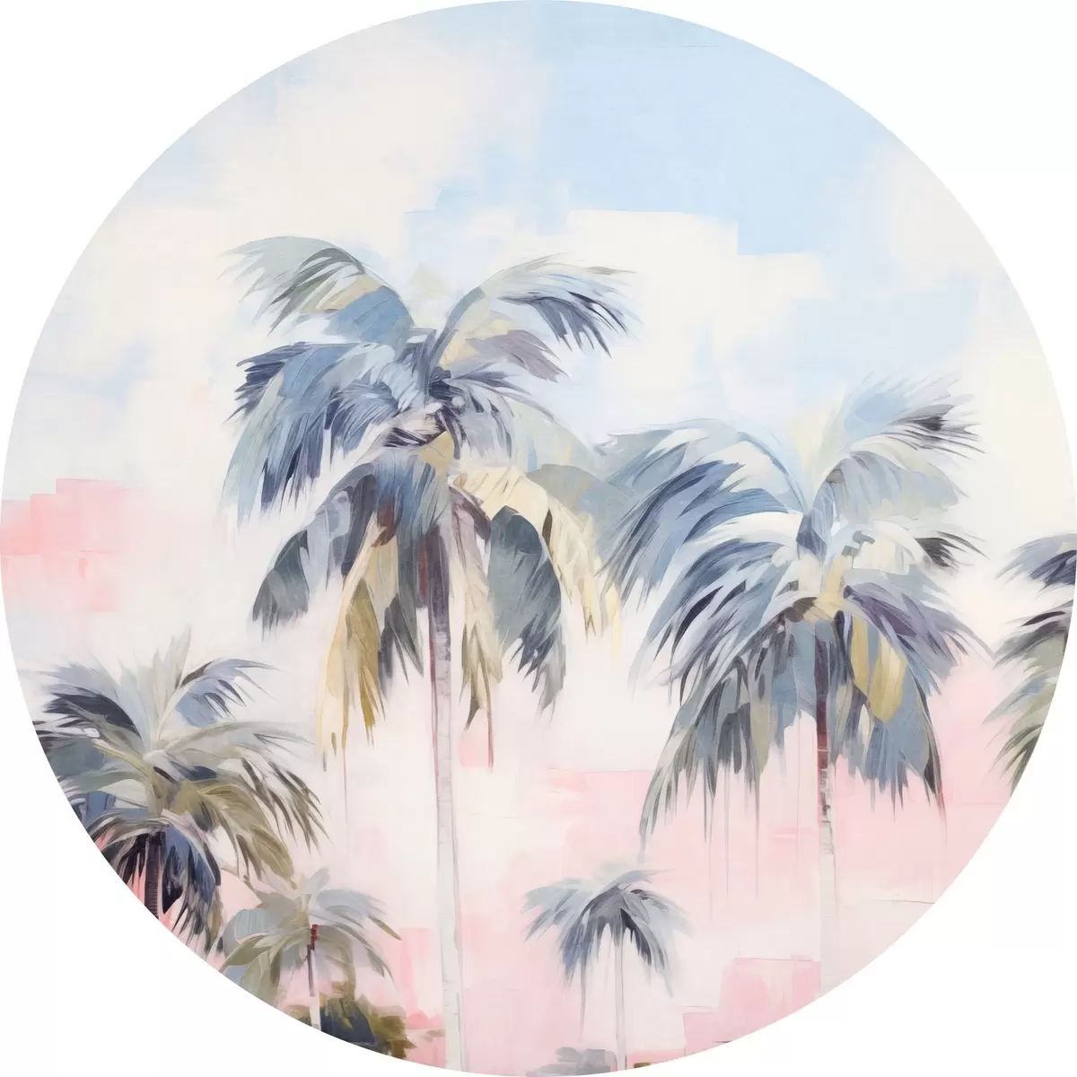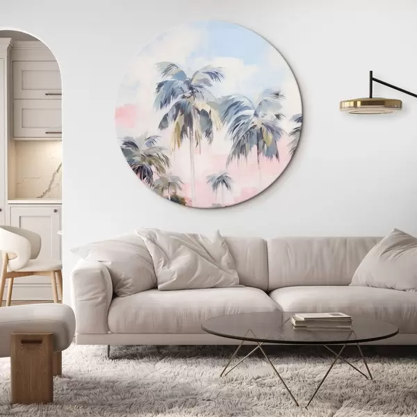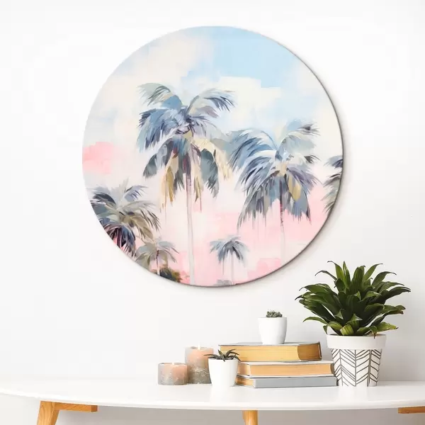 Ronde schilderijen Palmbomen met pastelkleurige bladeren en bruine stammen, roze en blauwe lucht, tropische omgeving r44866
