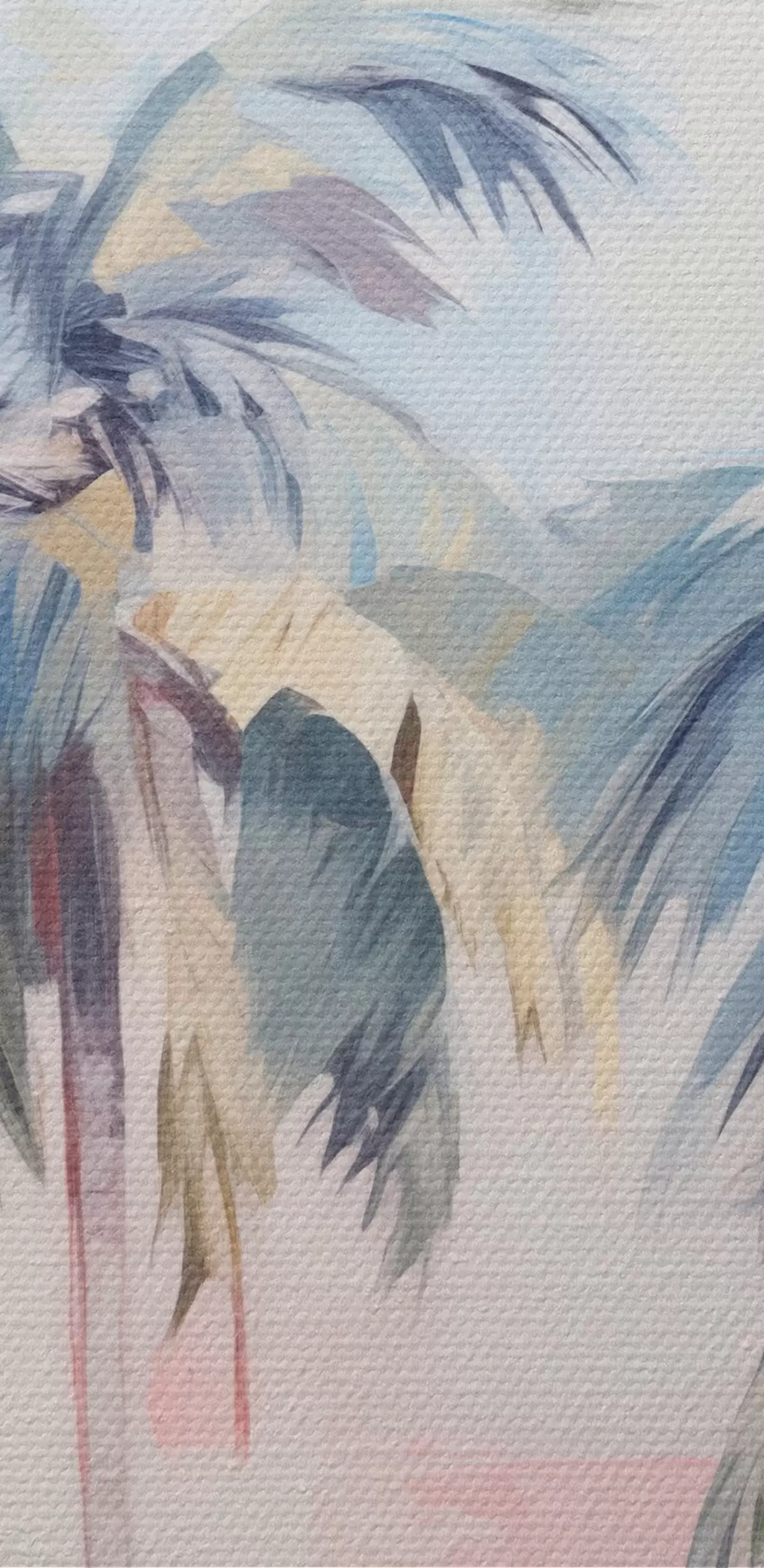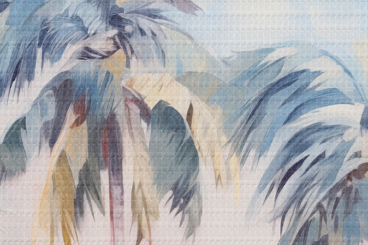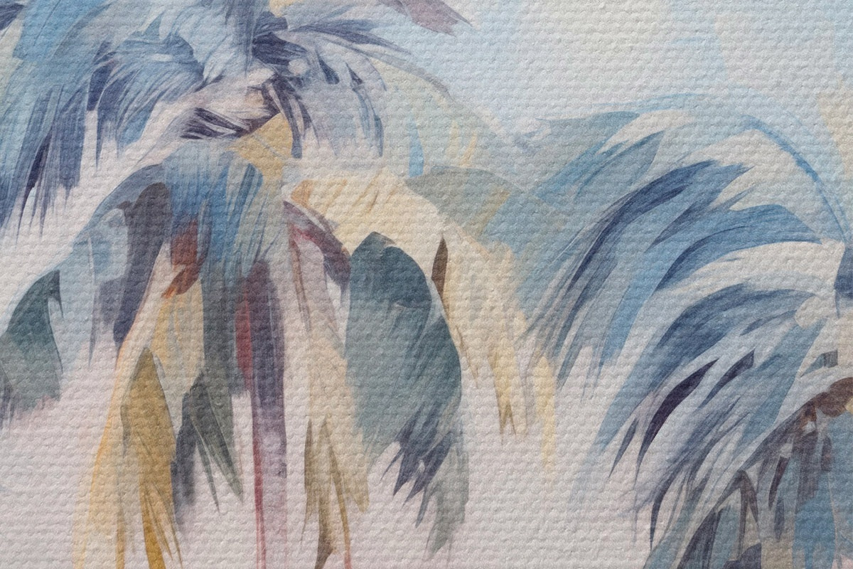 Afbeelding Palmbomen met pastelkleurige bladeren en bruine stammen, roze en blauwe lucht, tropische omgeving Nr r44866