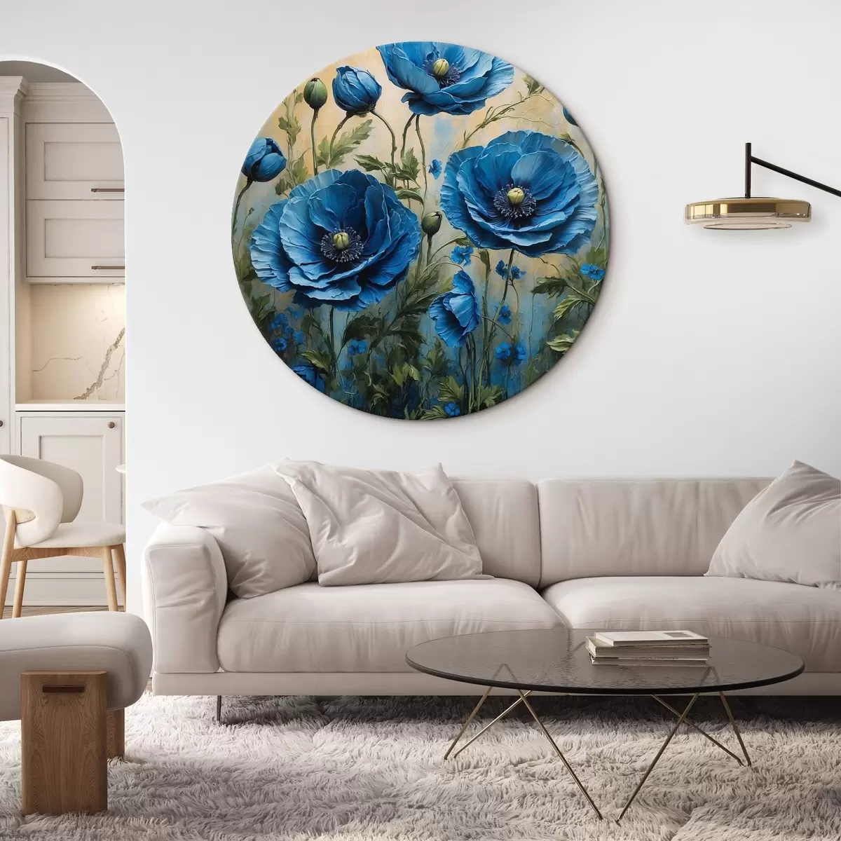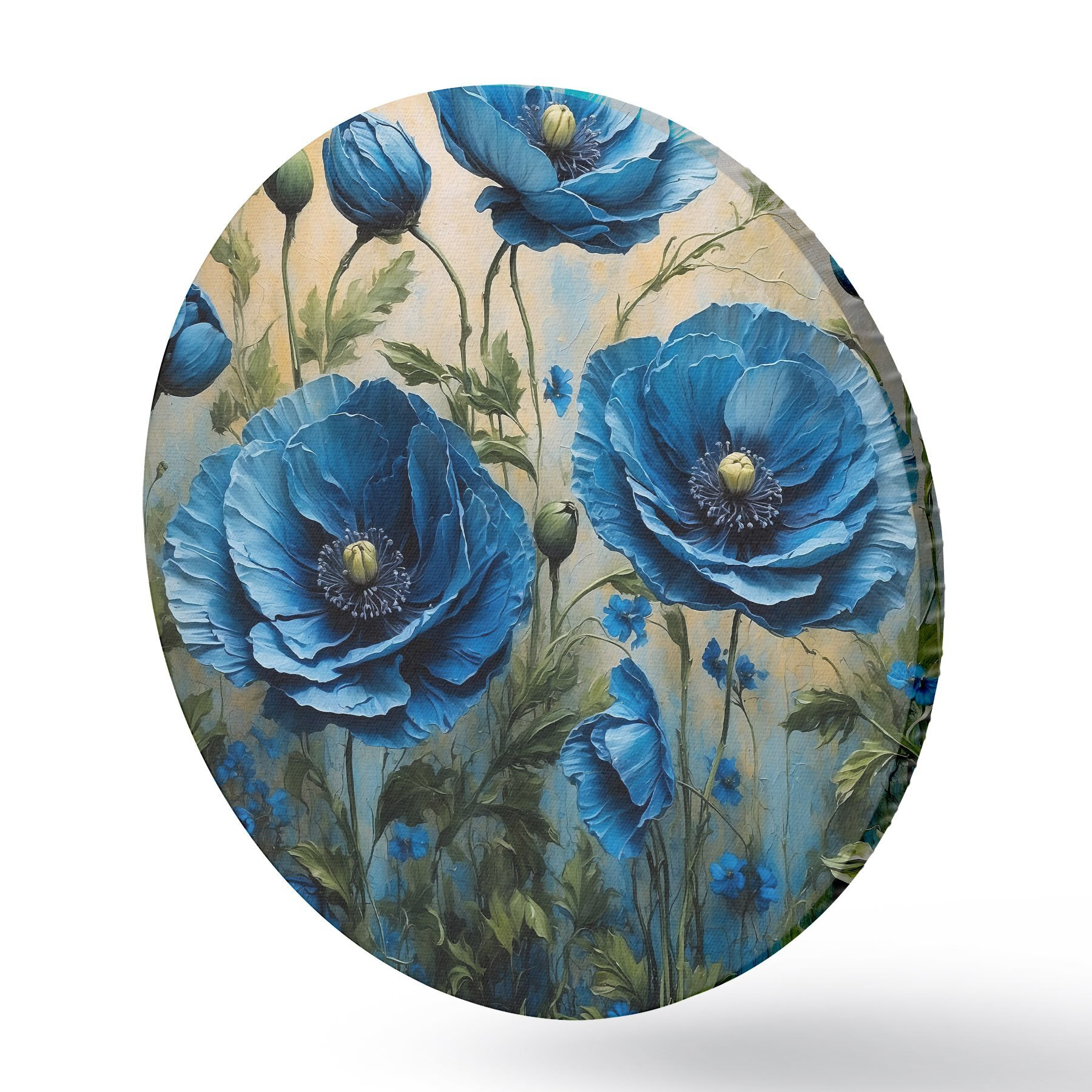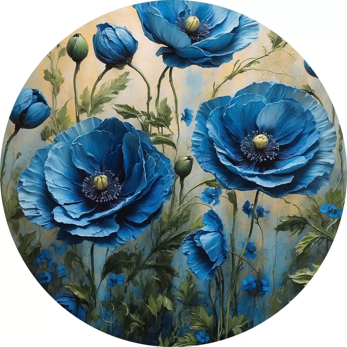 Ronde schilderijen Blauwe klaprozen op een pastelkleurige achtergrond met bladeren r44882
