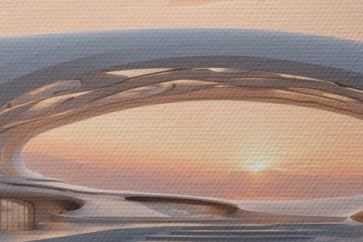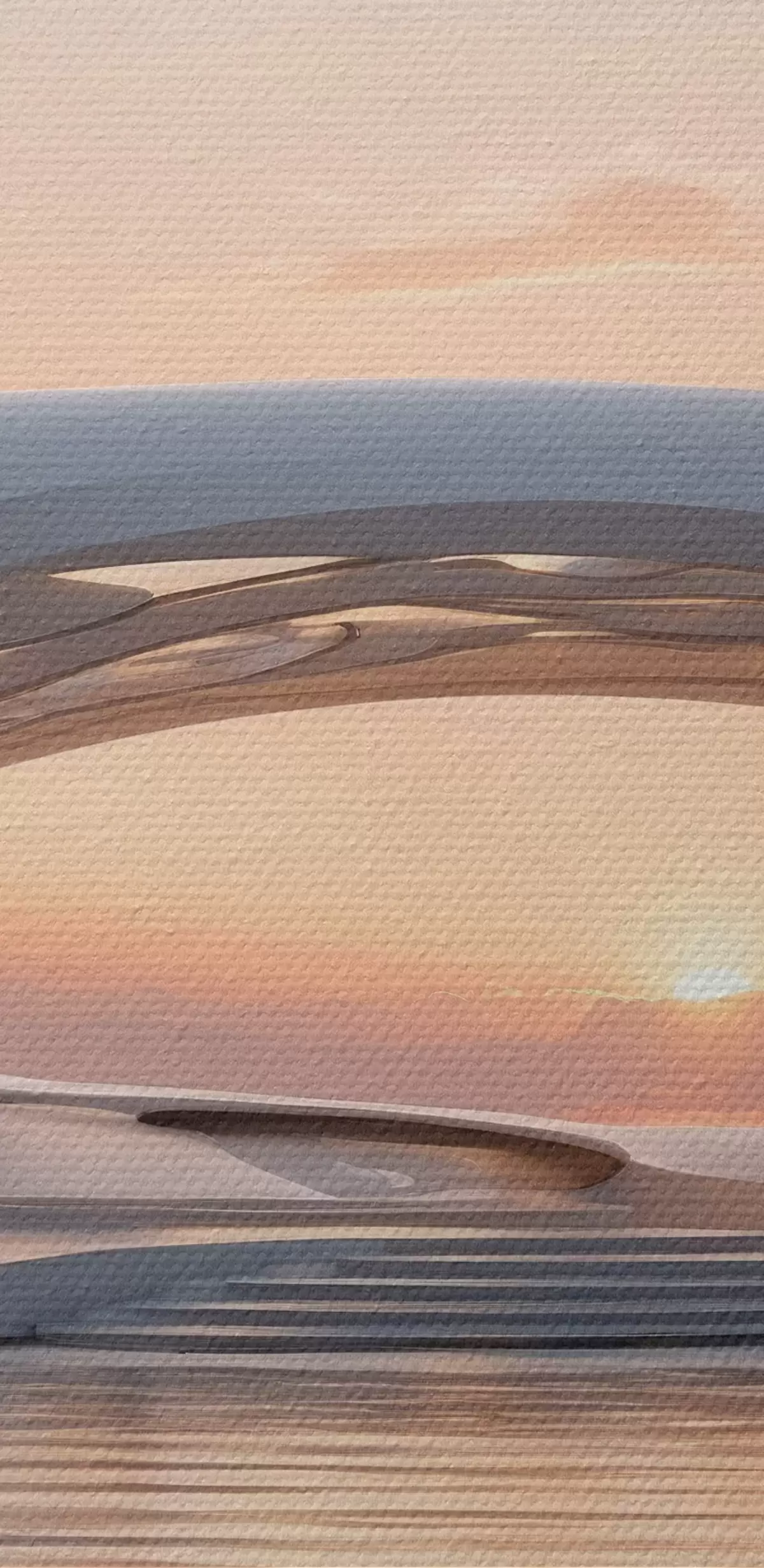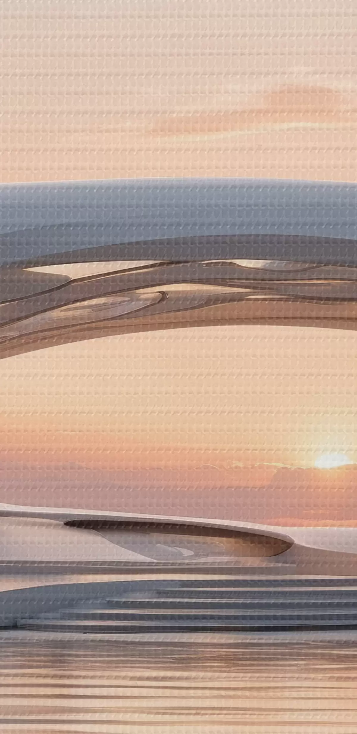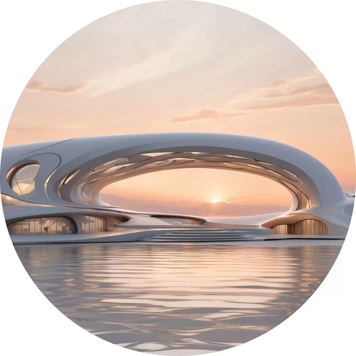 Afbeelding Futuristisch gebouw op het water tegen een roze zonsondergang Nr r44884