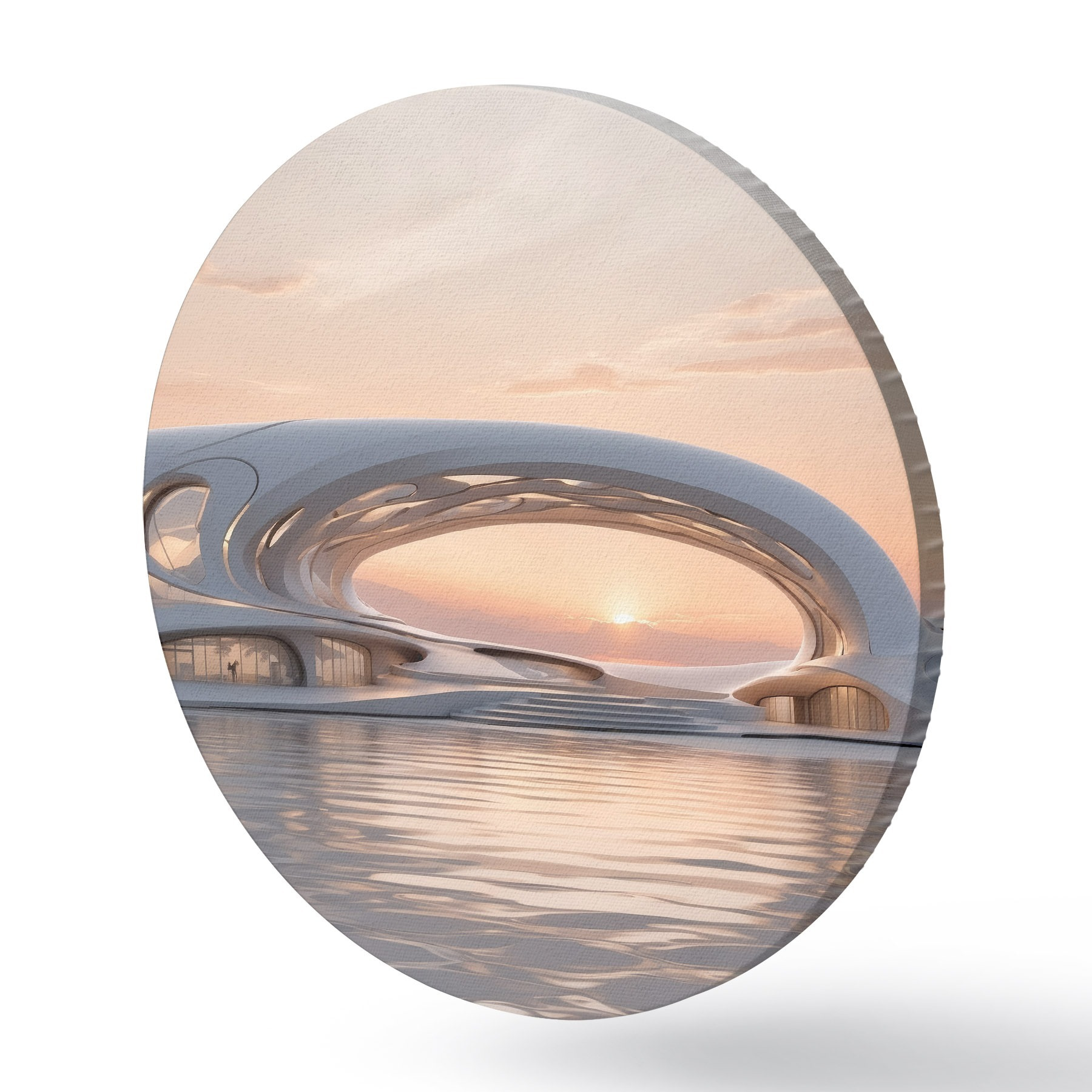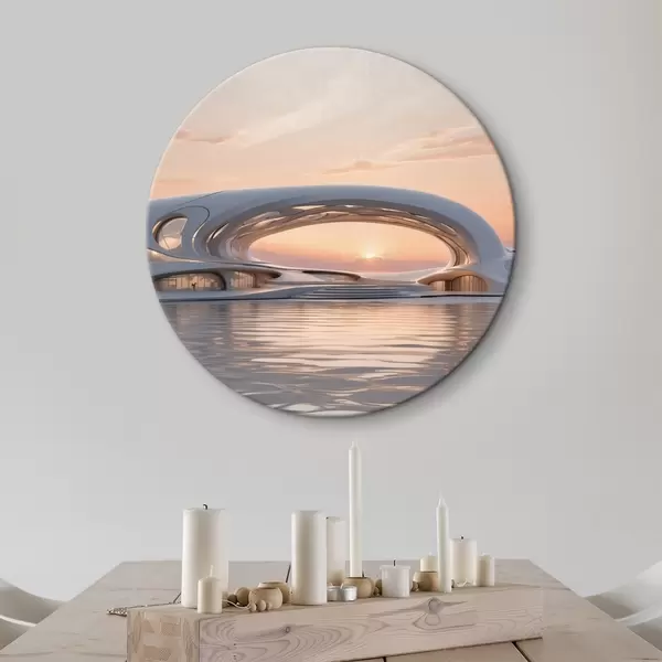 Ronde schilderijen Futuristisch gebouw op het water tegen een roze zonsondergang r44884