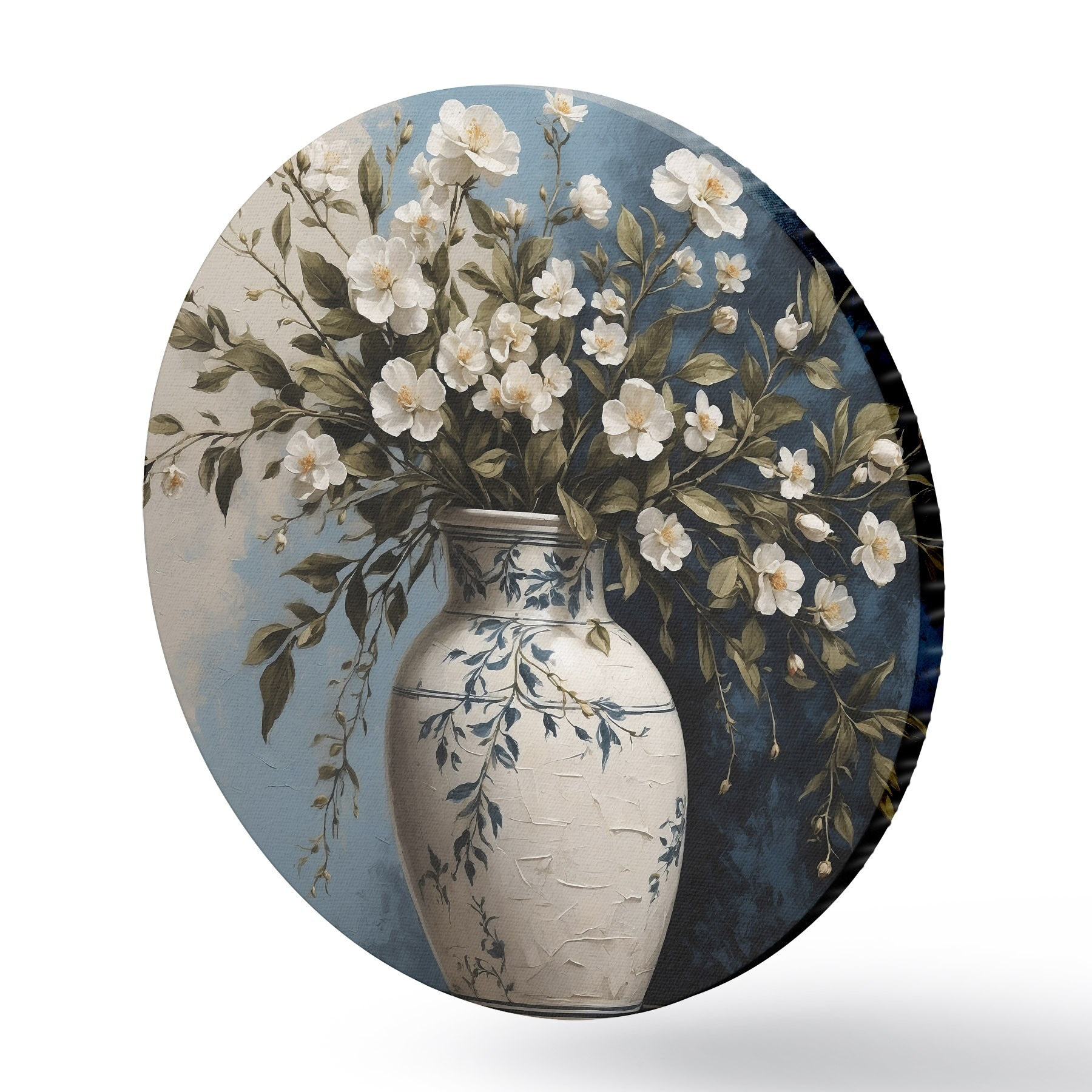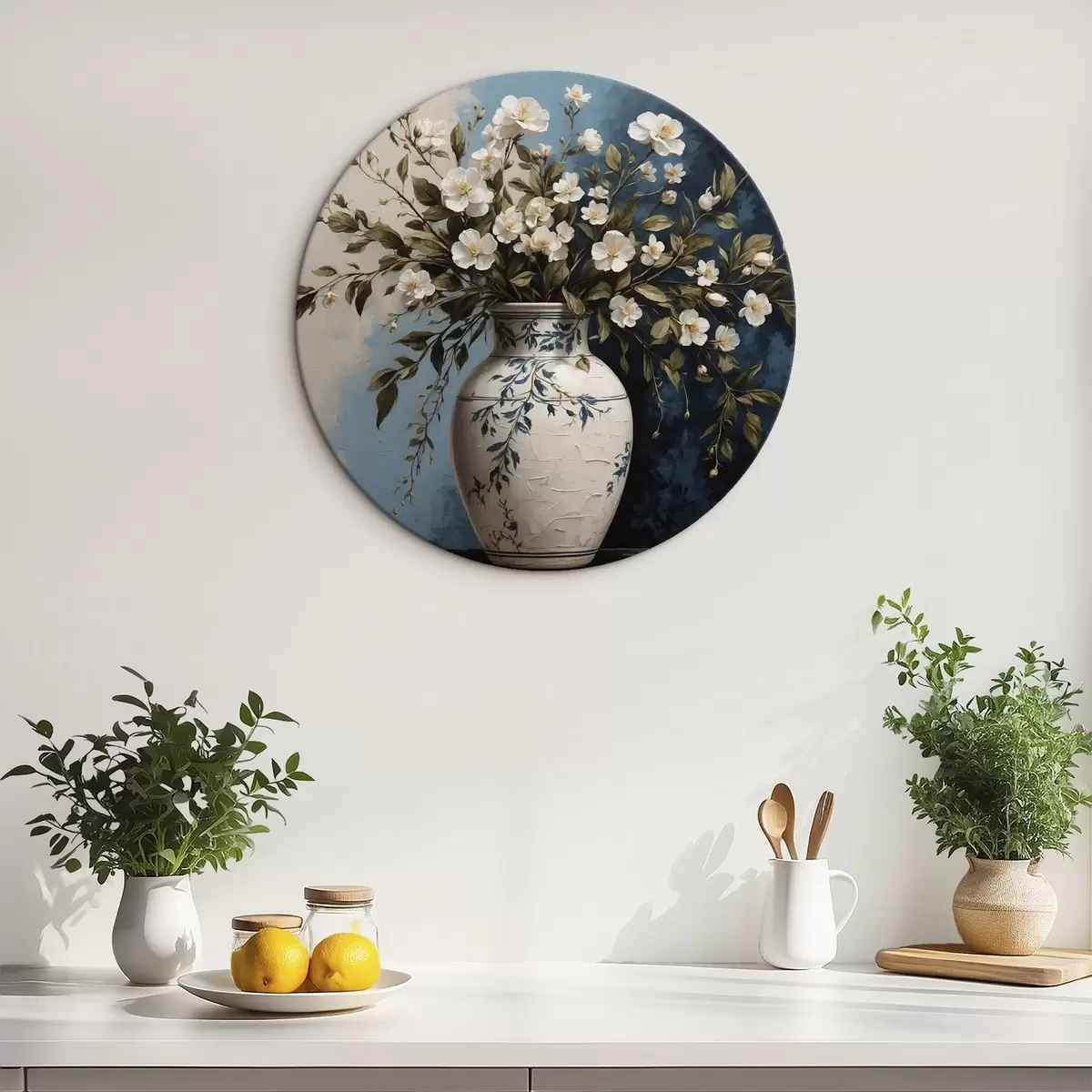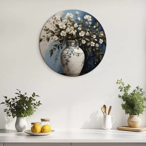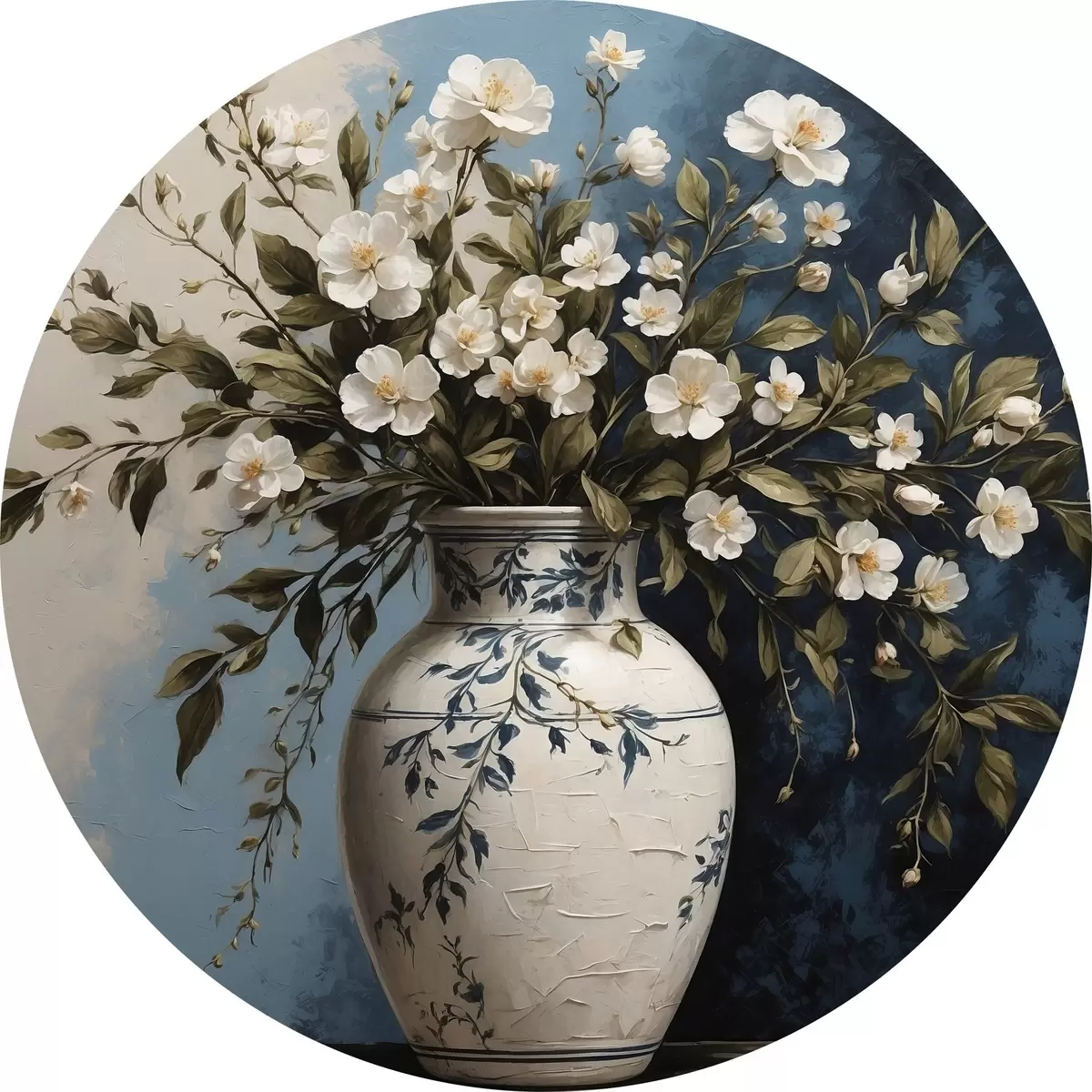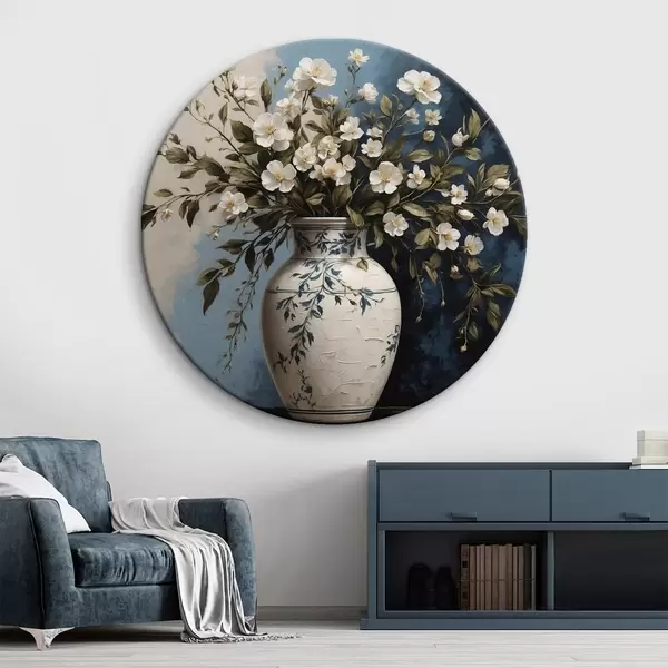Ronde schilderijen Witte en gele bloemen in een grote vaas op een blauwe achtergrond r44893