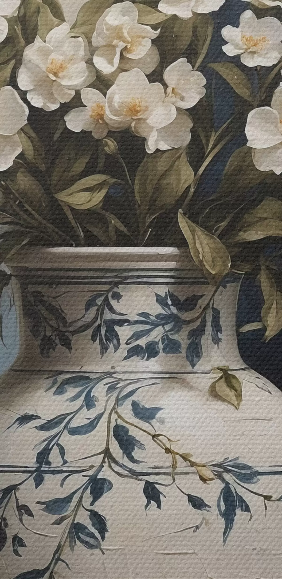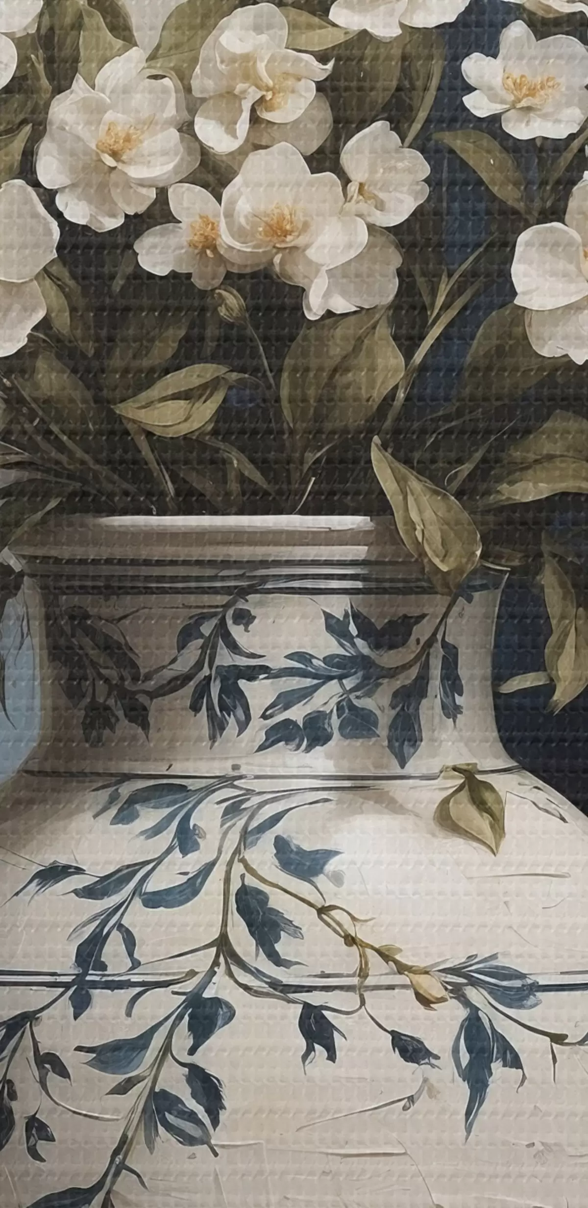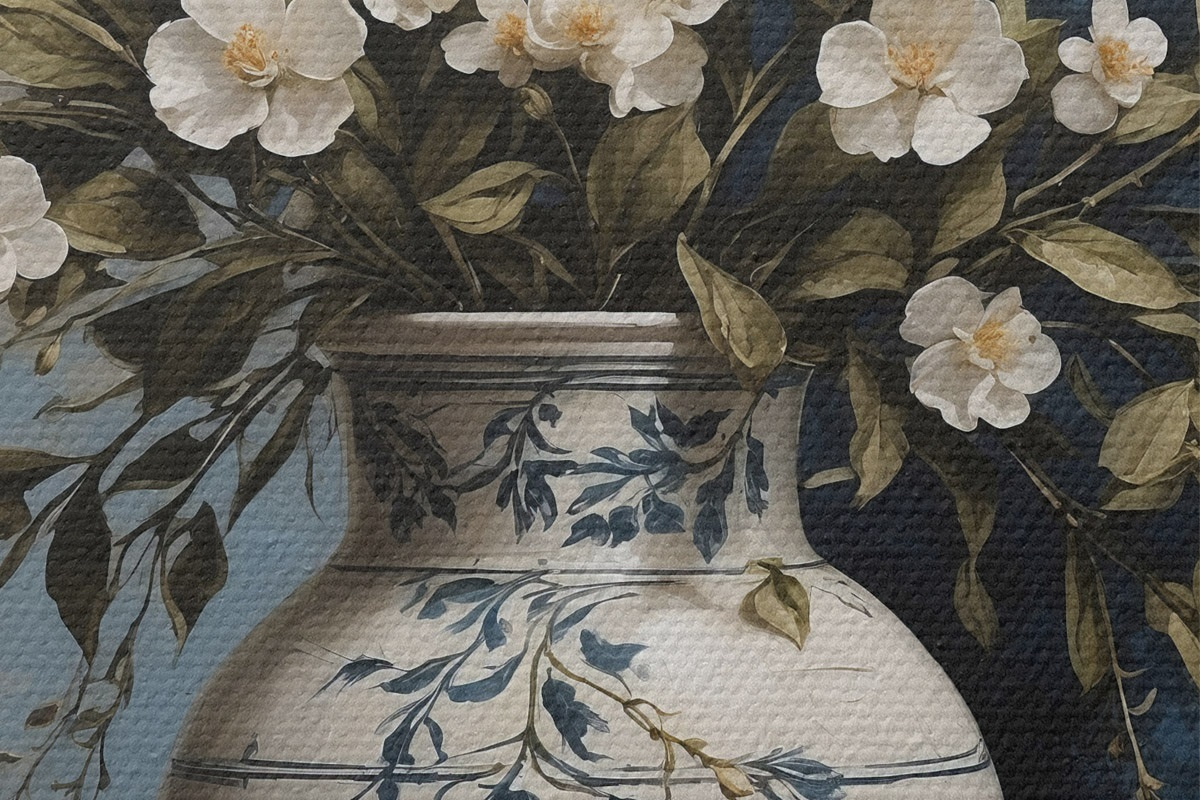Afbeelding Witte en gele bloemen in een grote vaas op een blauwe achtergrond Nr r44893