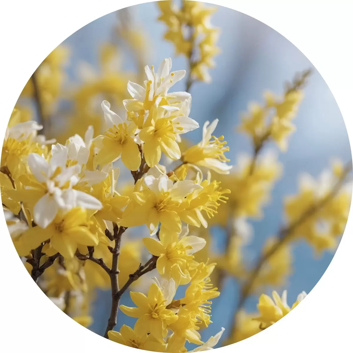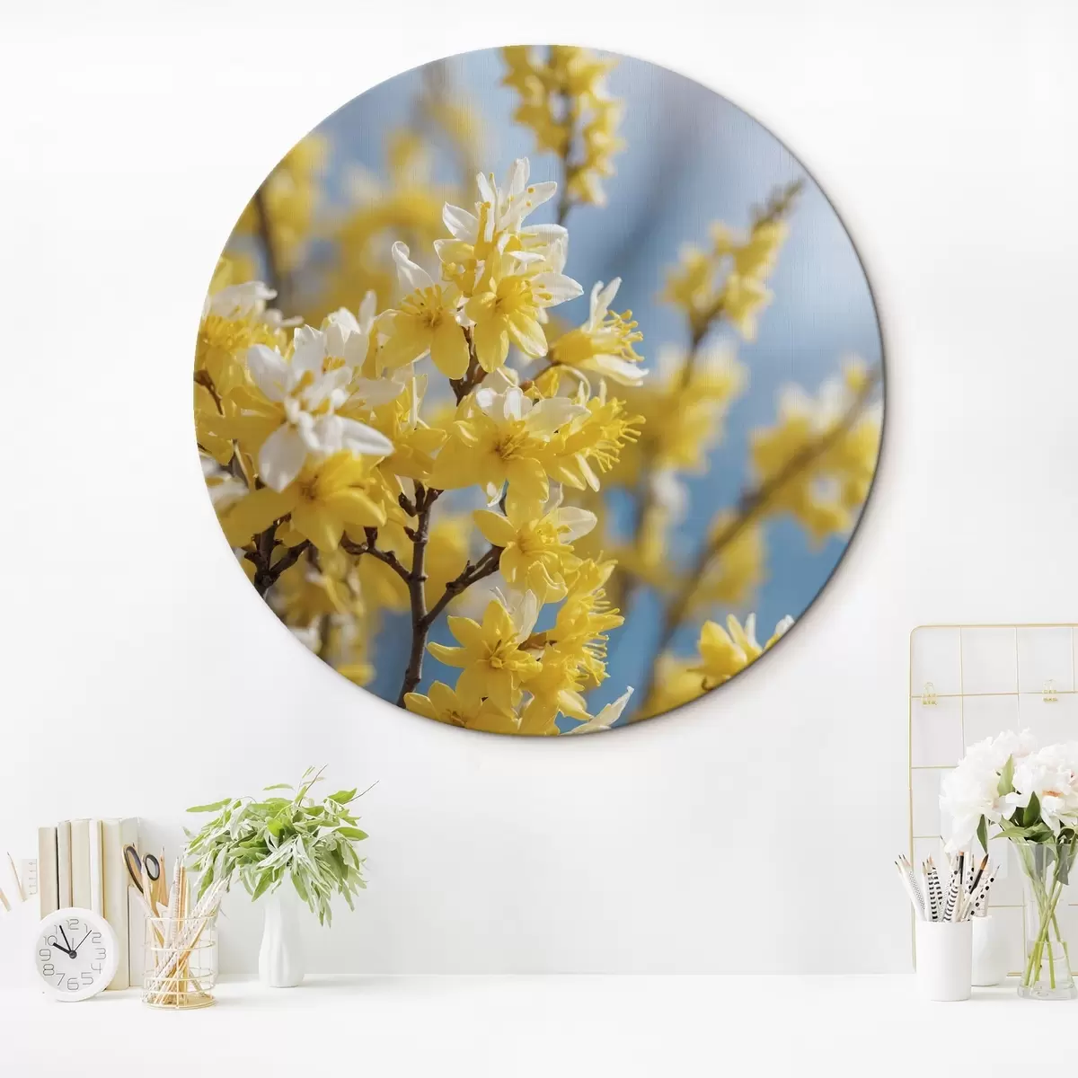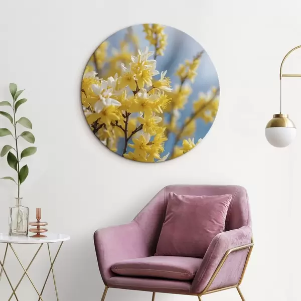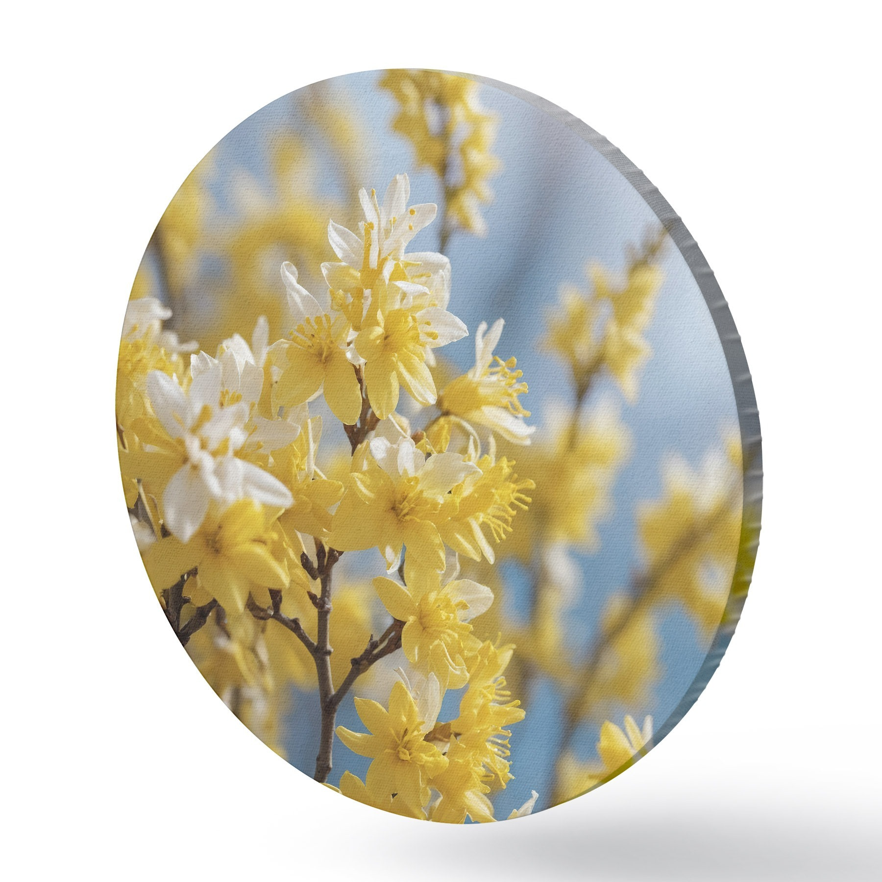 Ronde schilderijen Gele bloemen op een blauwe achtergrond met zachte focus r44894