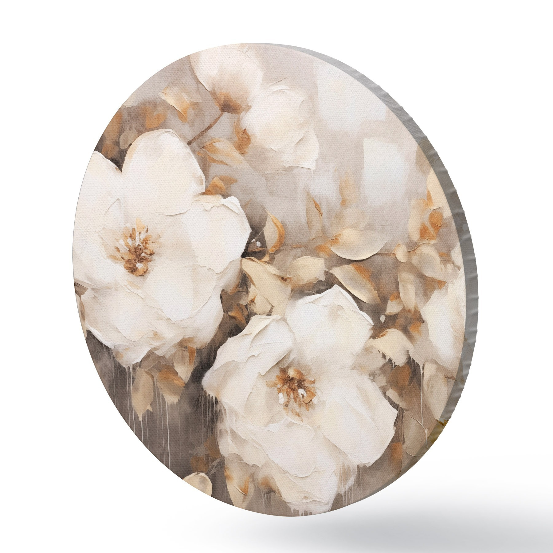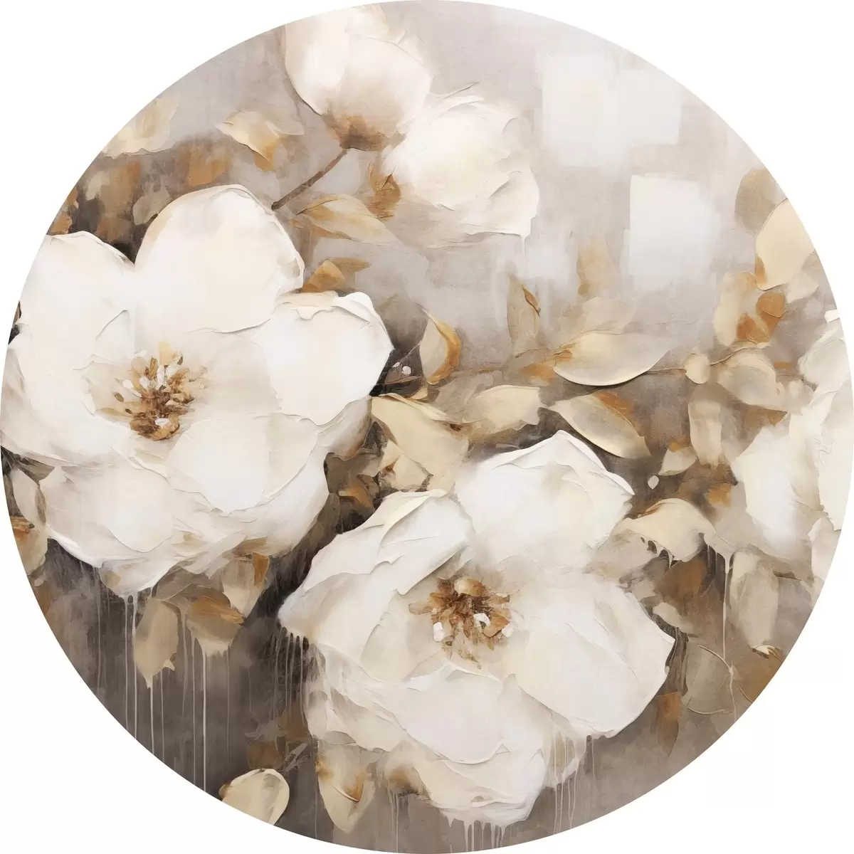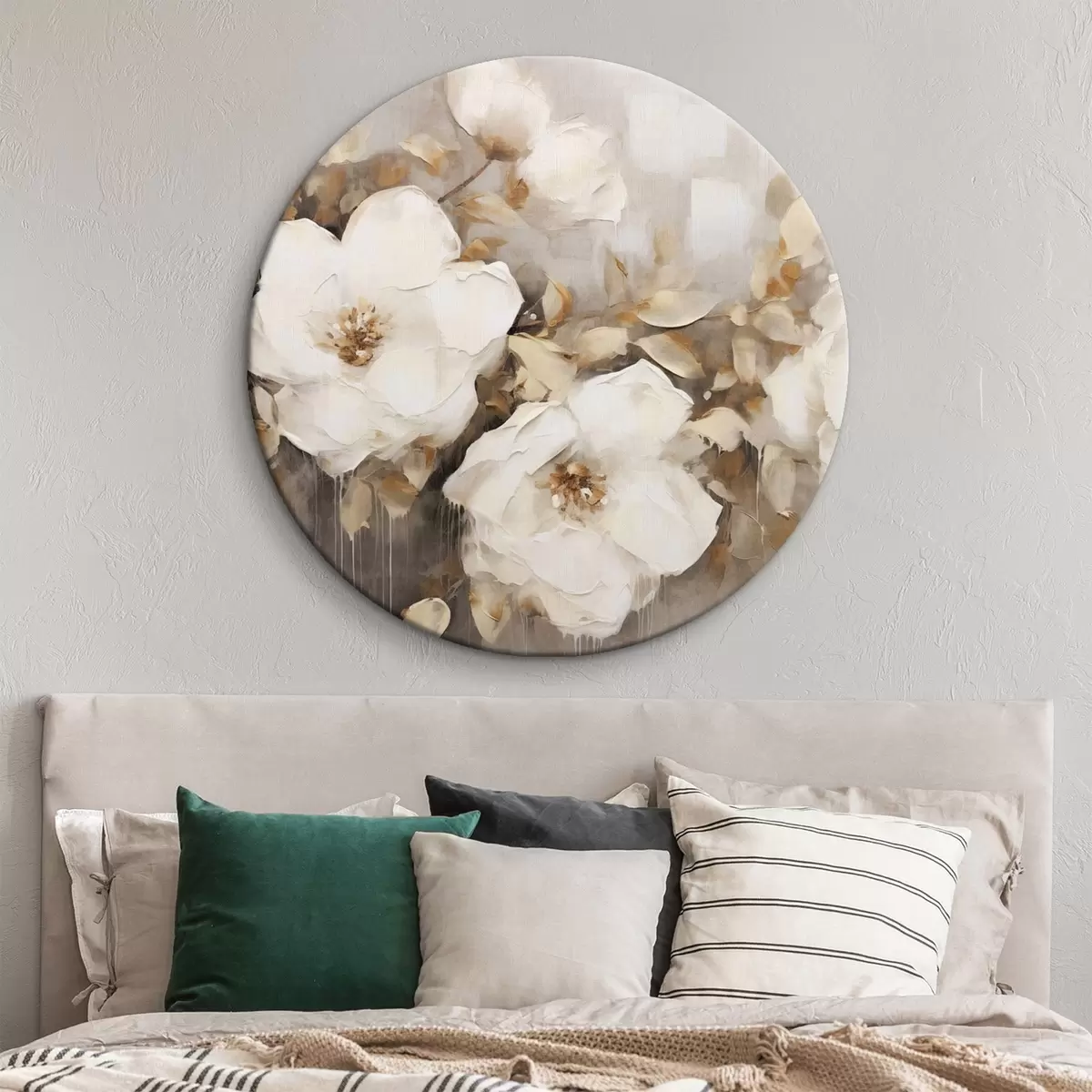 Ronde schilderijen Witte bloemen met bruine bladeren op een beige achtergrond, olieverfschilderij imitatie, bloemstuk, botanische kunst r44922