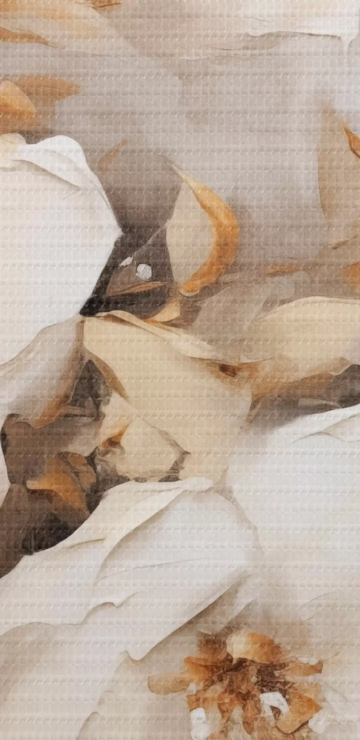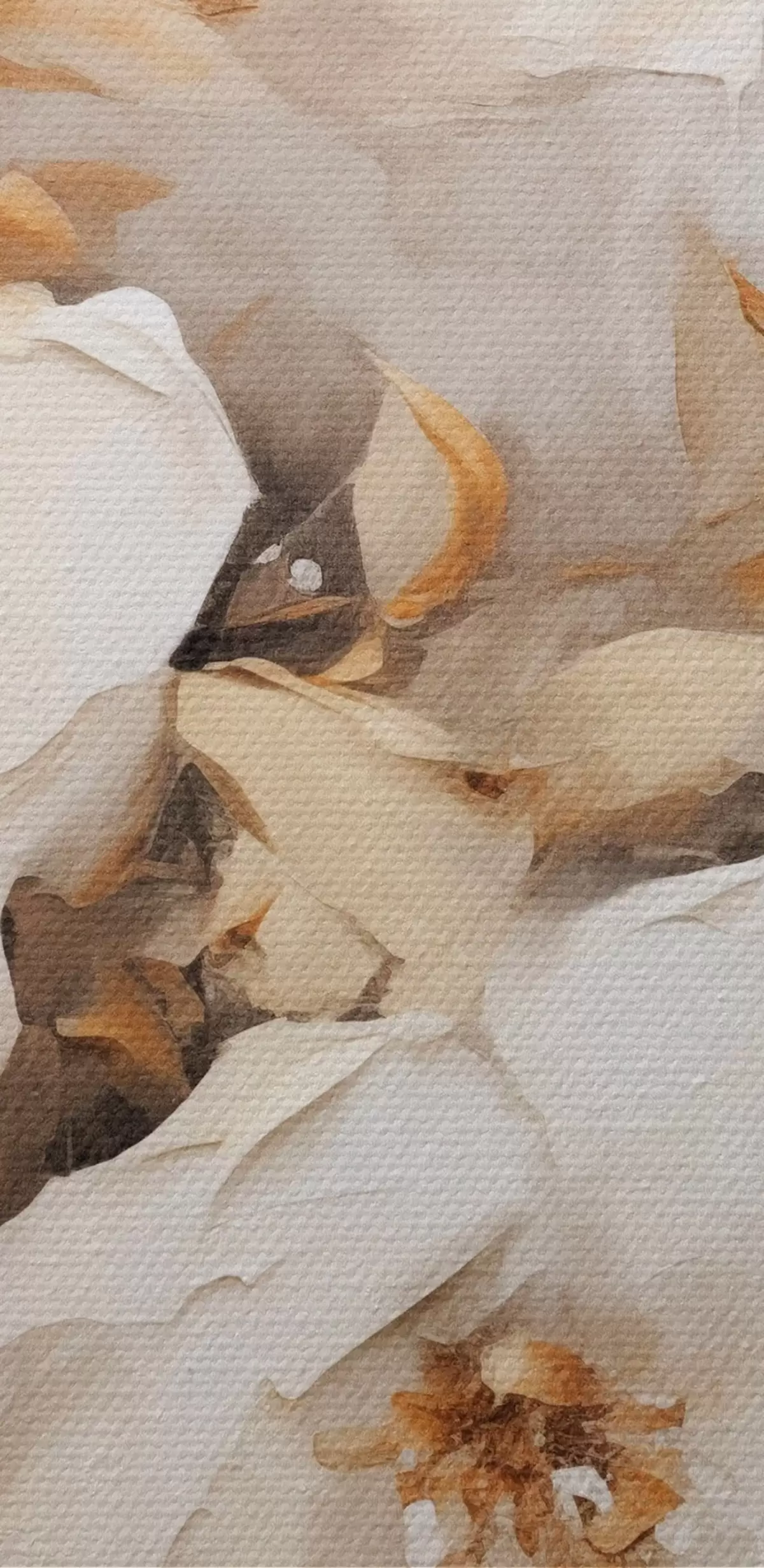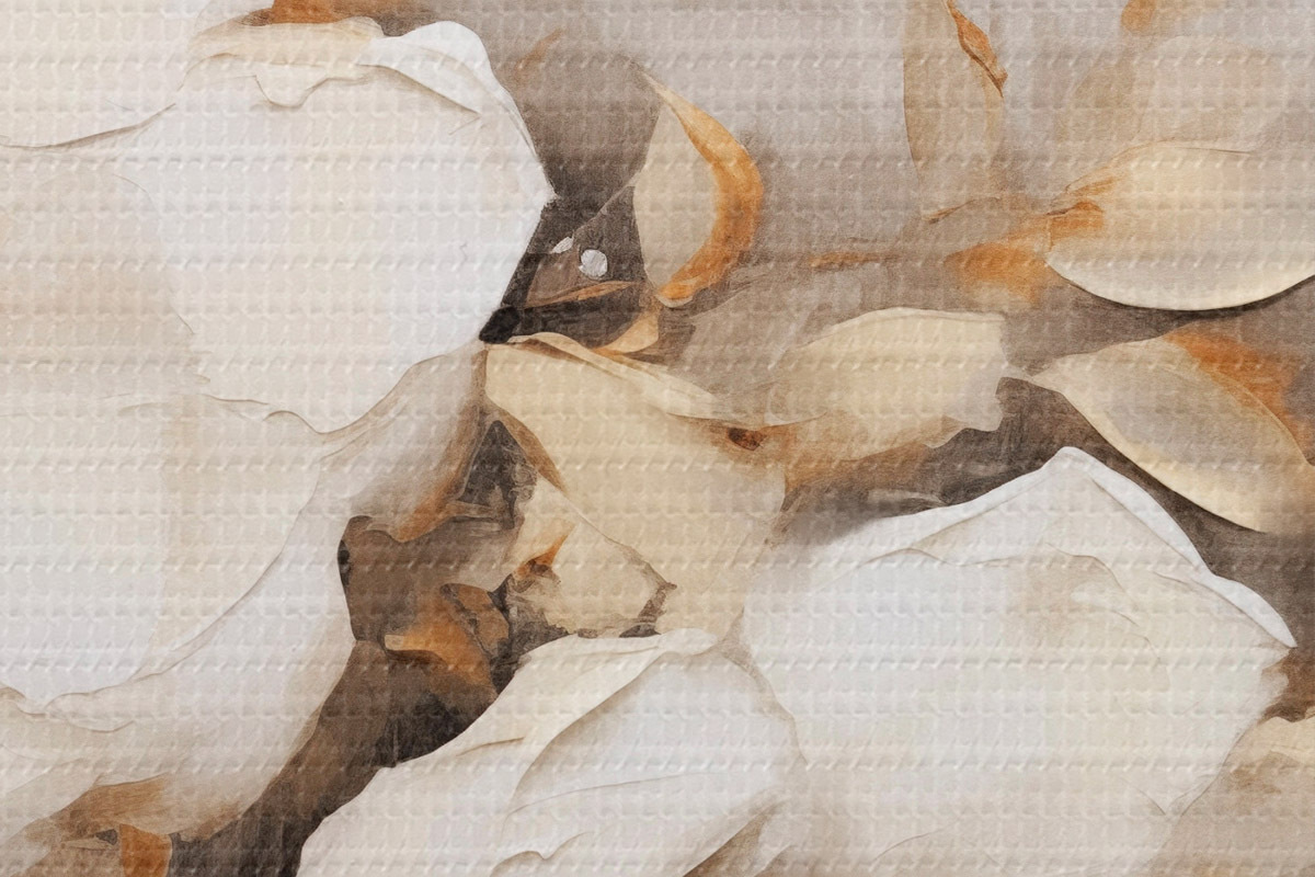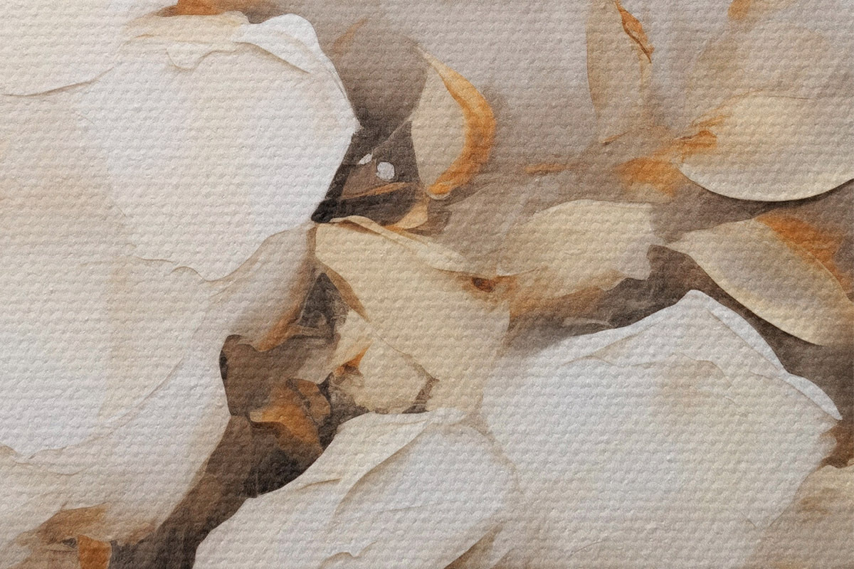 Afbeelding Witte bloemen met bruine bladeren op een beige achtergrond, olieverfschilderij imitatie, bloemstuk, botanische kunst Nr r44922