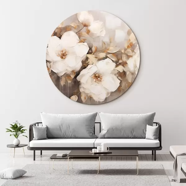 Ronde schilderijen Witte bloemen met bruine bladeren op een beige achtergrond, olieverfschilderij imitatie, bloemstuk, botanische kunst r44922