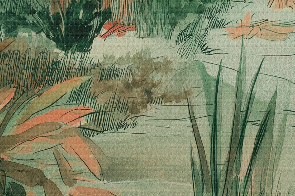 Afbeelding Oosterse tuin met struiken en bomen, groene kleuren Nr r44982
