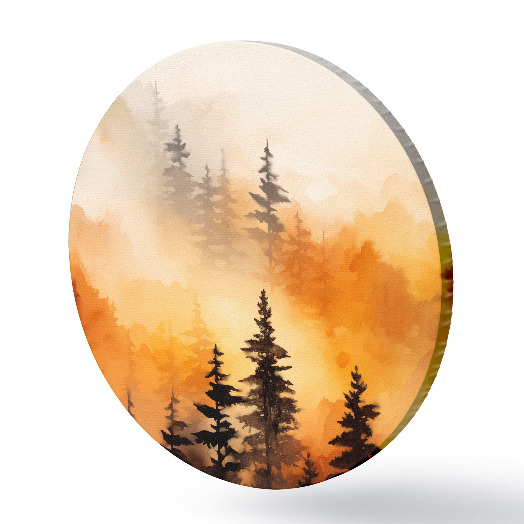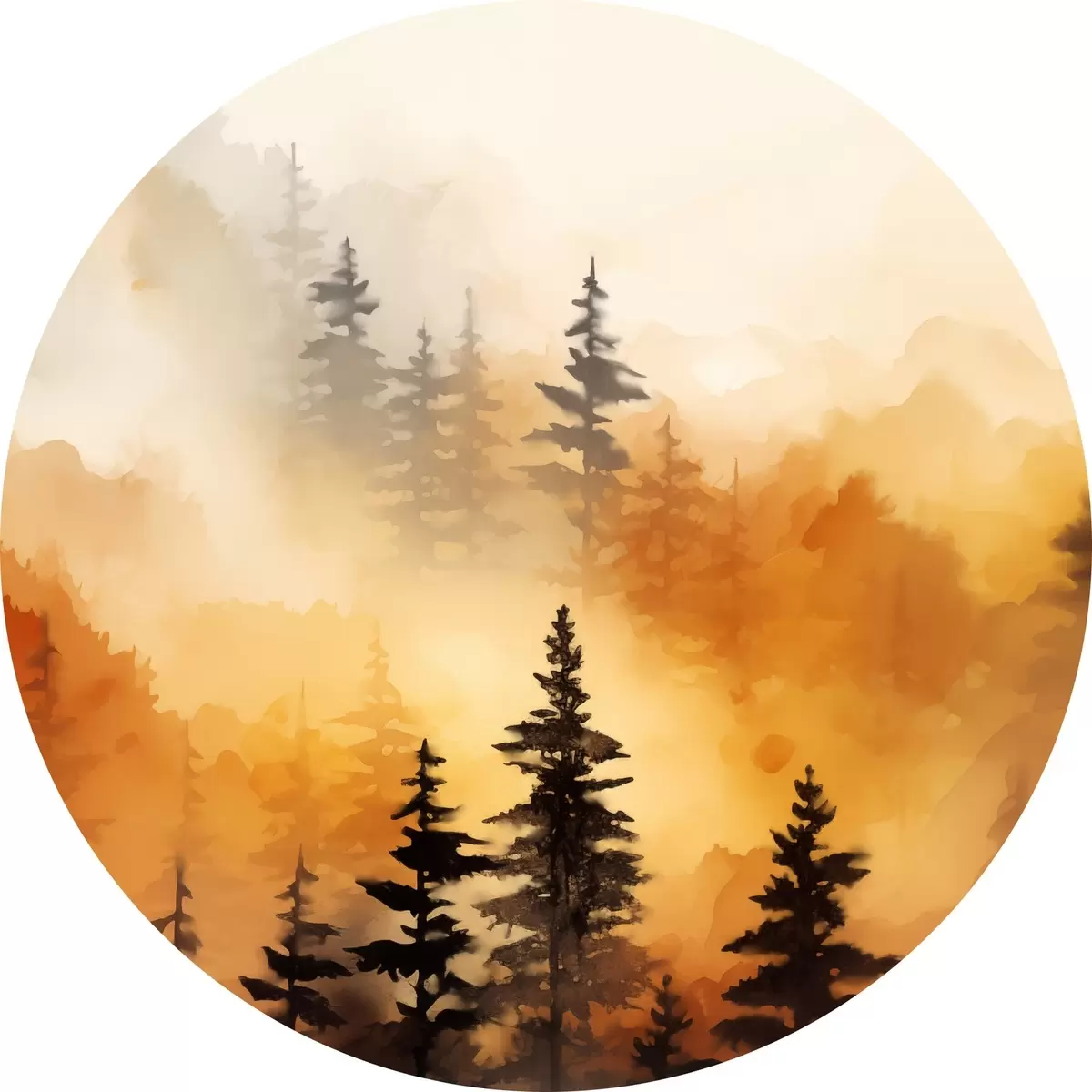 Ronde schilderijen Een landschap aquarel imitatie van een bos met hoge pijnbomen en bergen op de achtergrond r45170