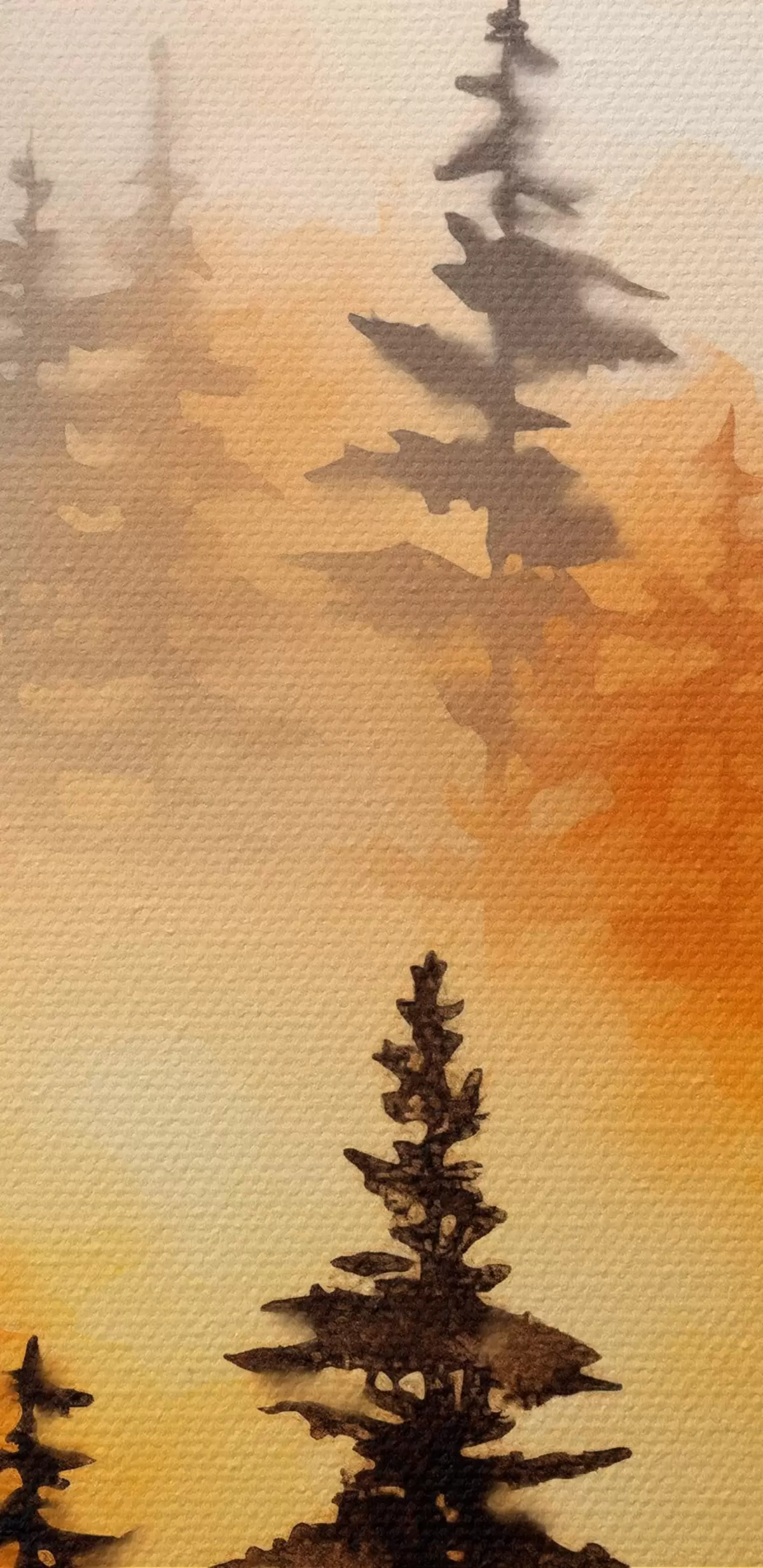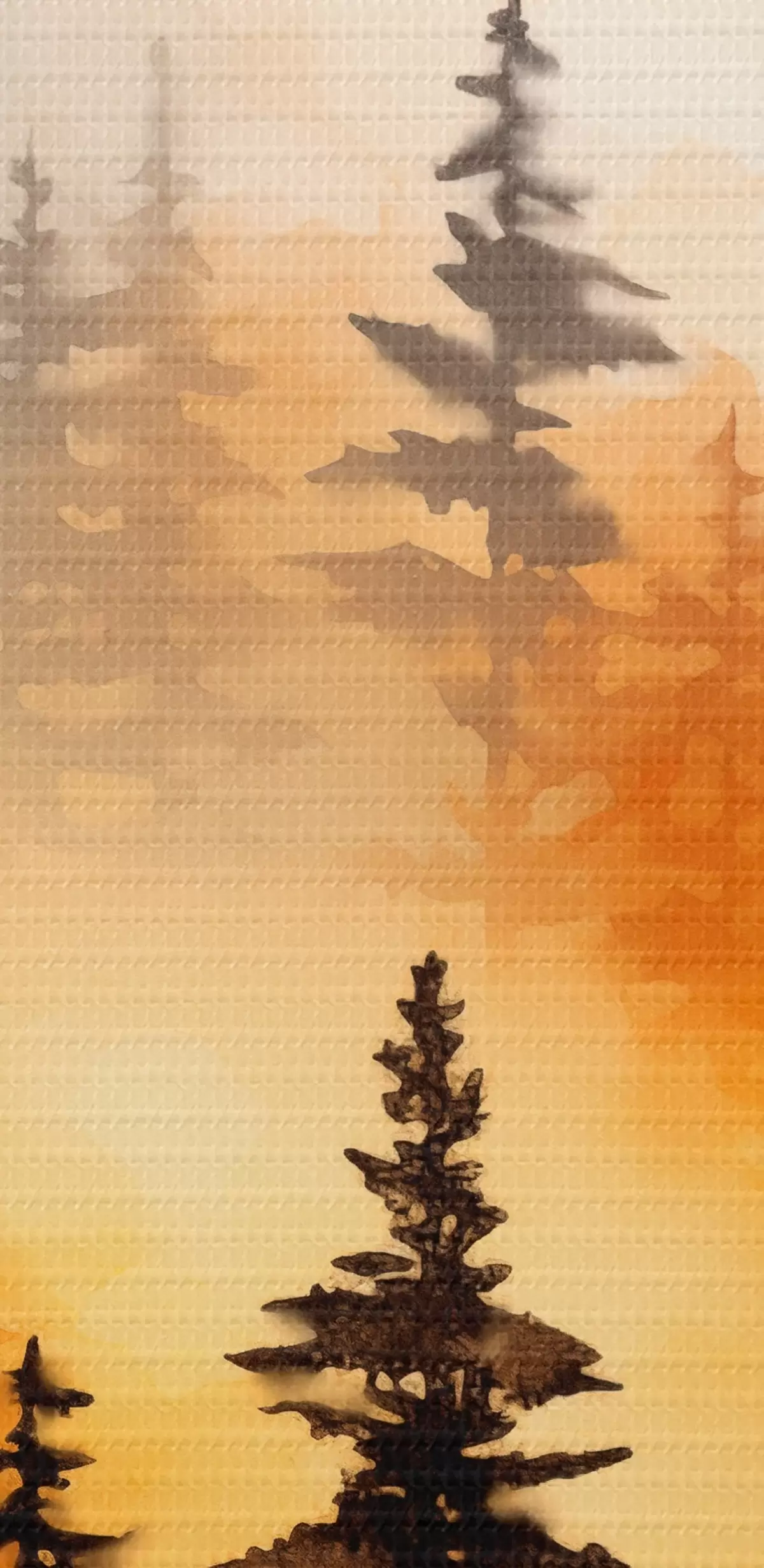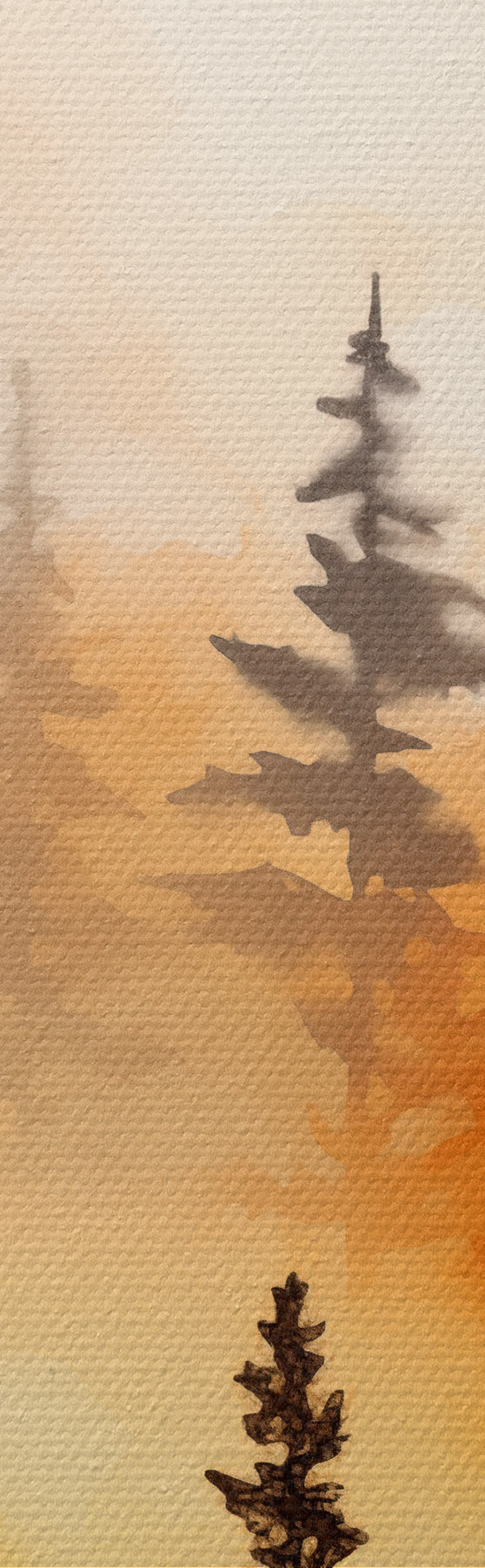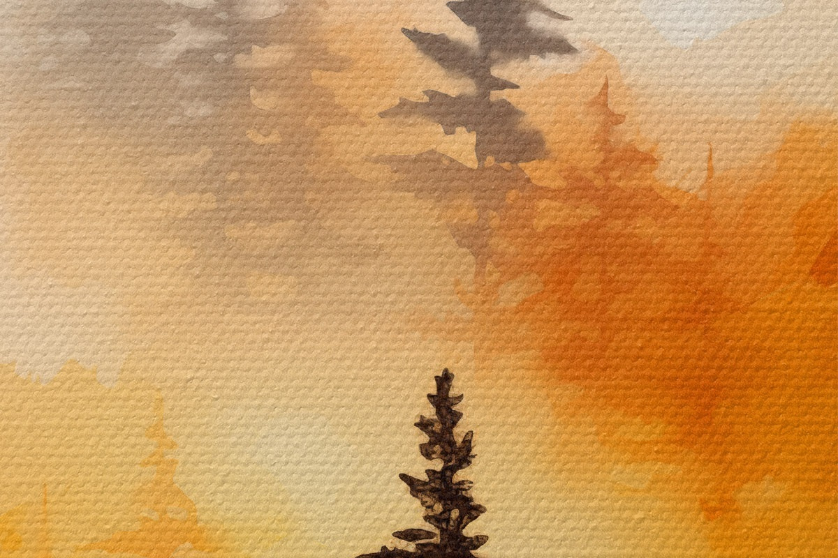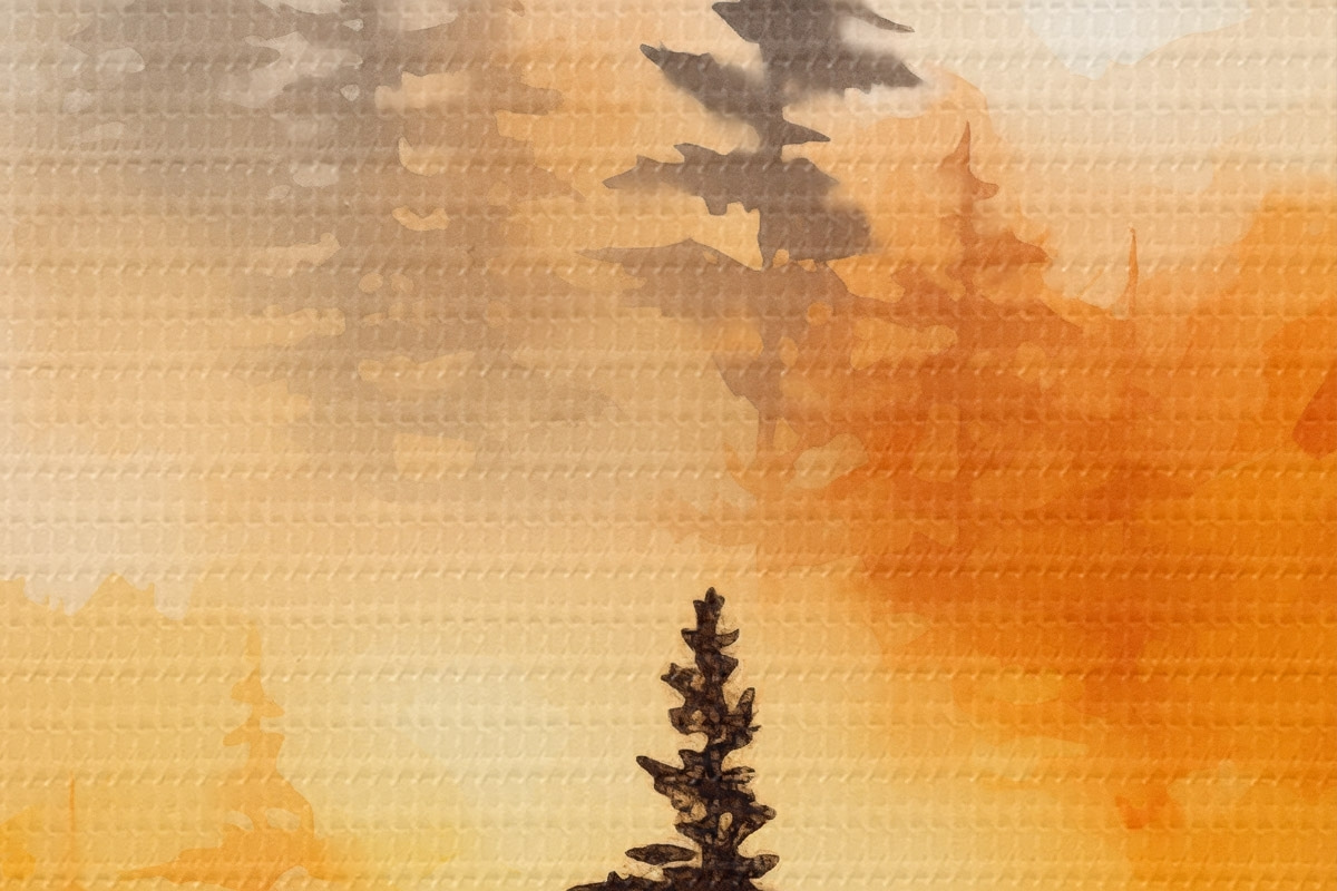 Afbeelding Een landschap aquarel imitatie van een bos met hoge pijnbomen en bergen op de achtergrond Nr r45170