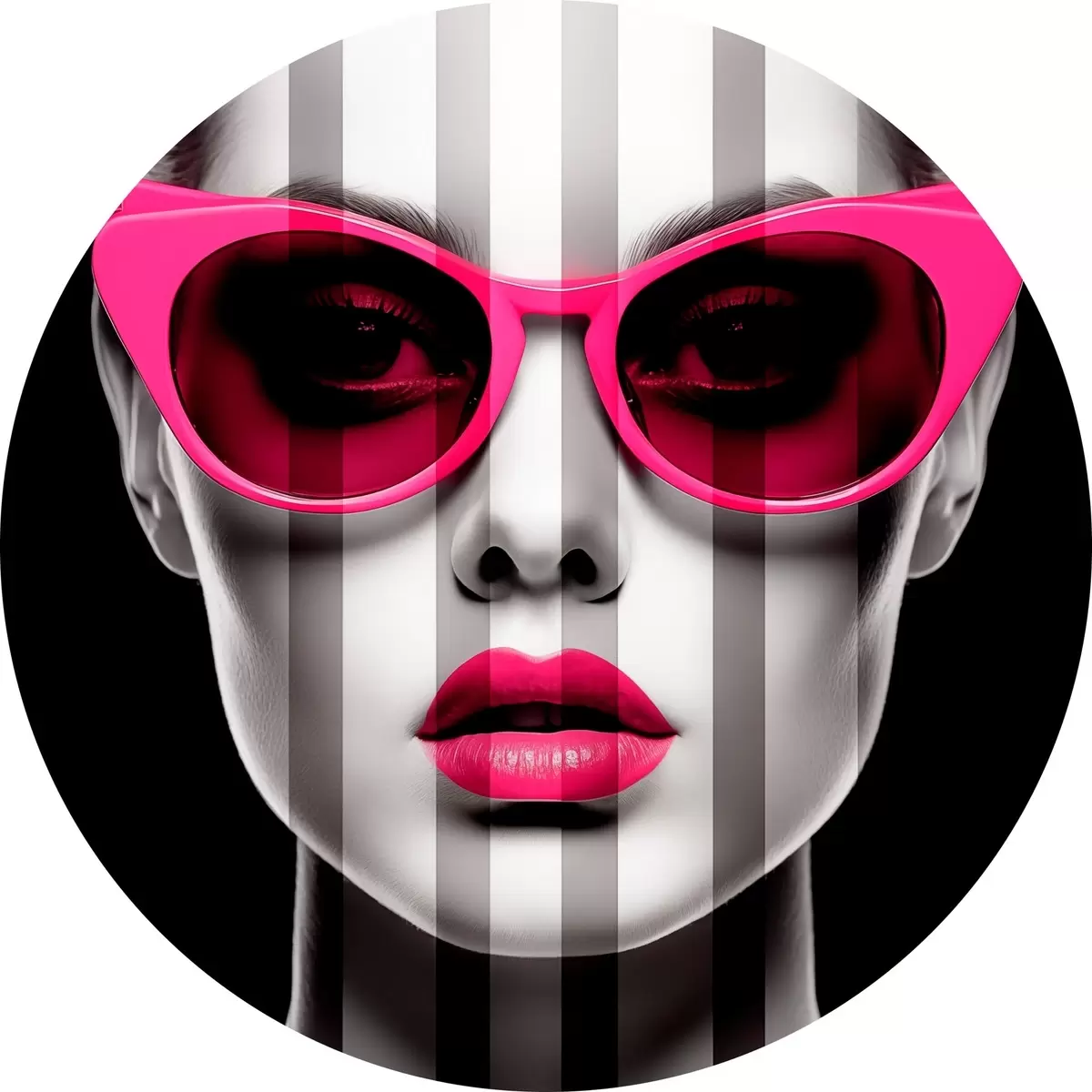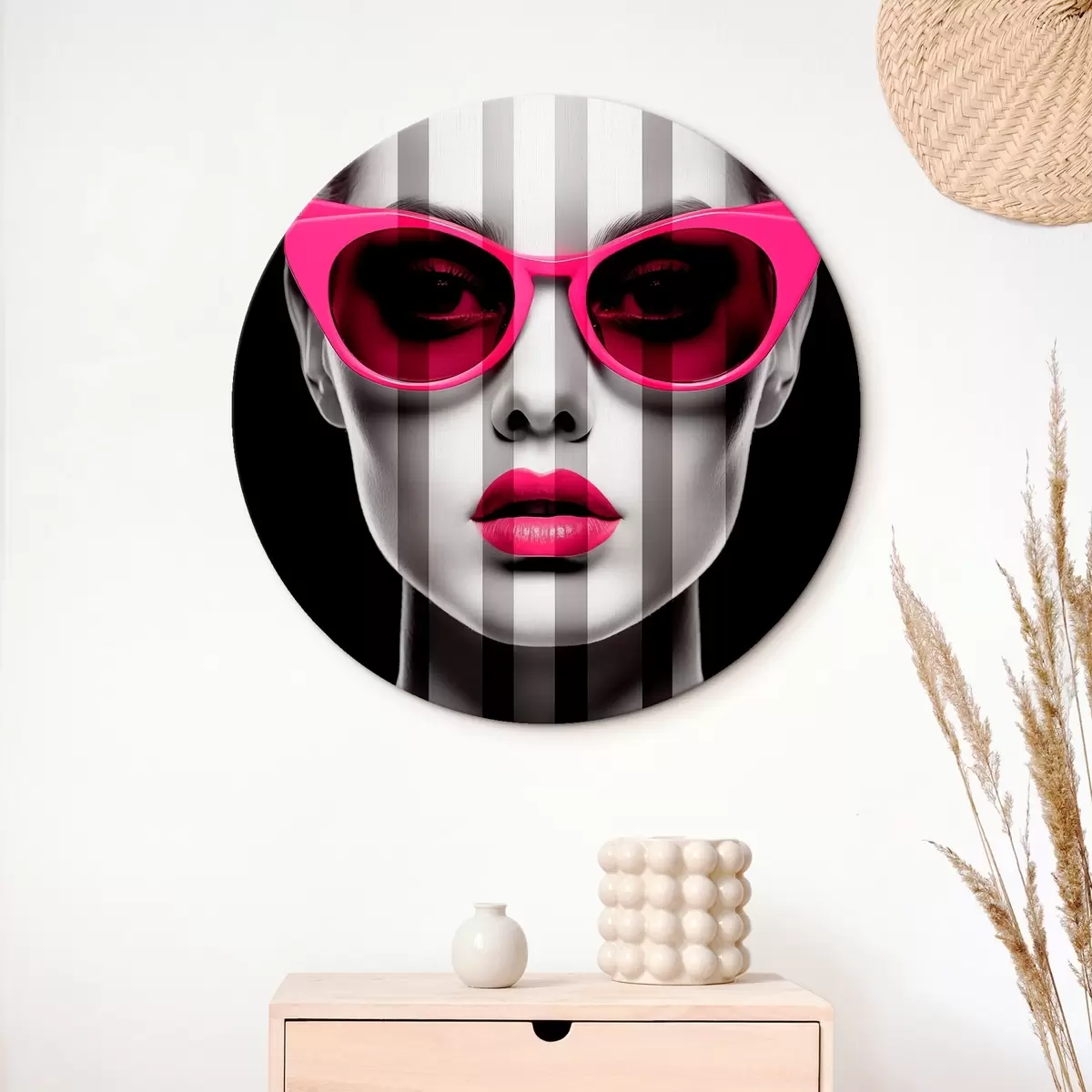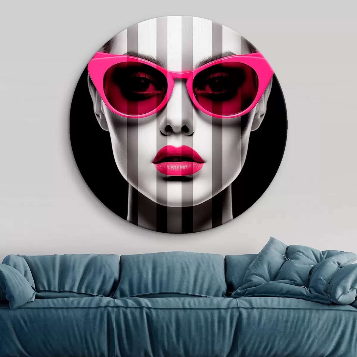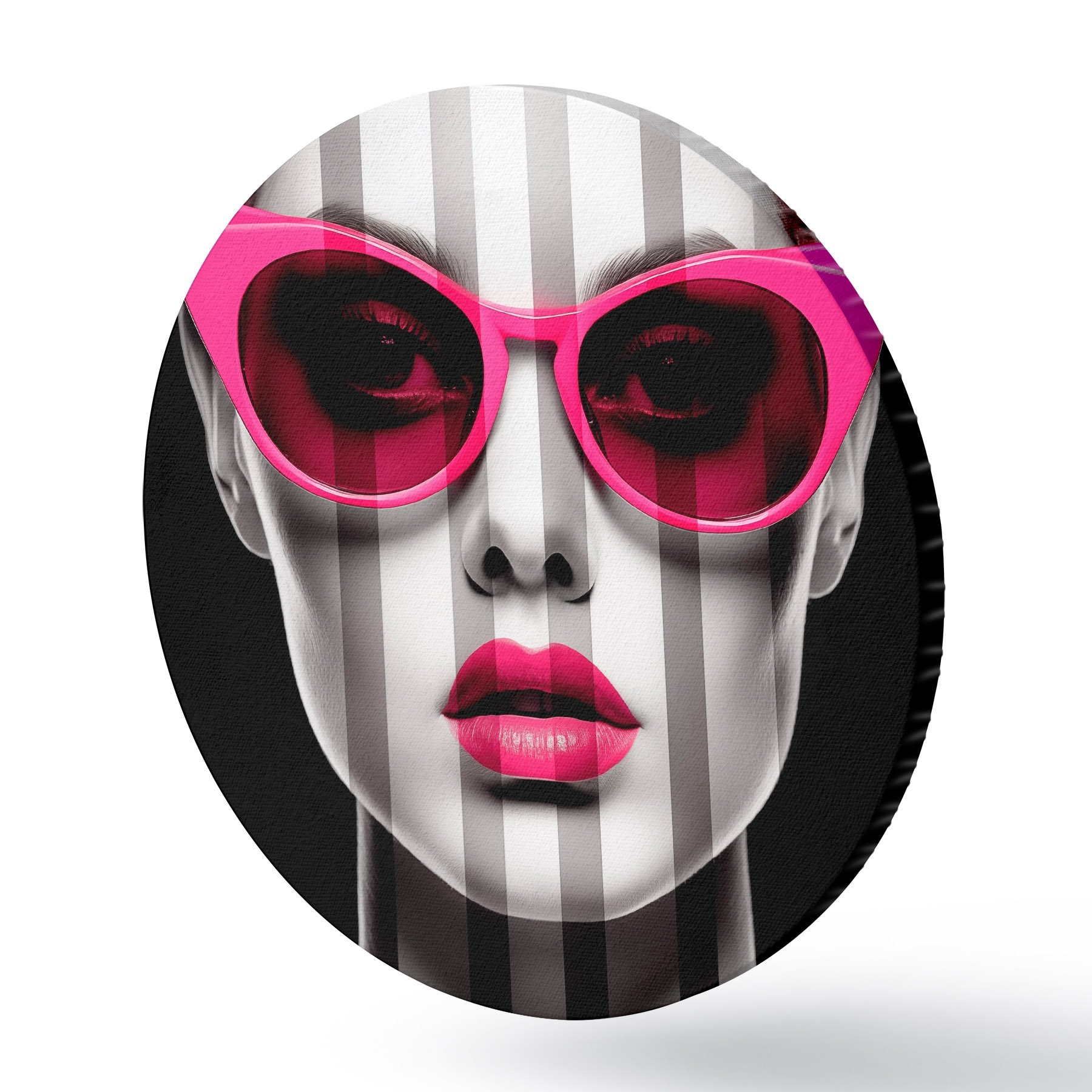 Ronde schilderijen Vrouw met roze bril met zwarte en witte strepen r45315