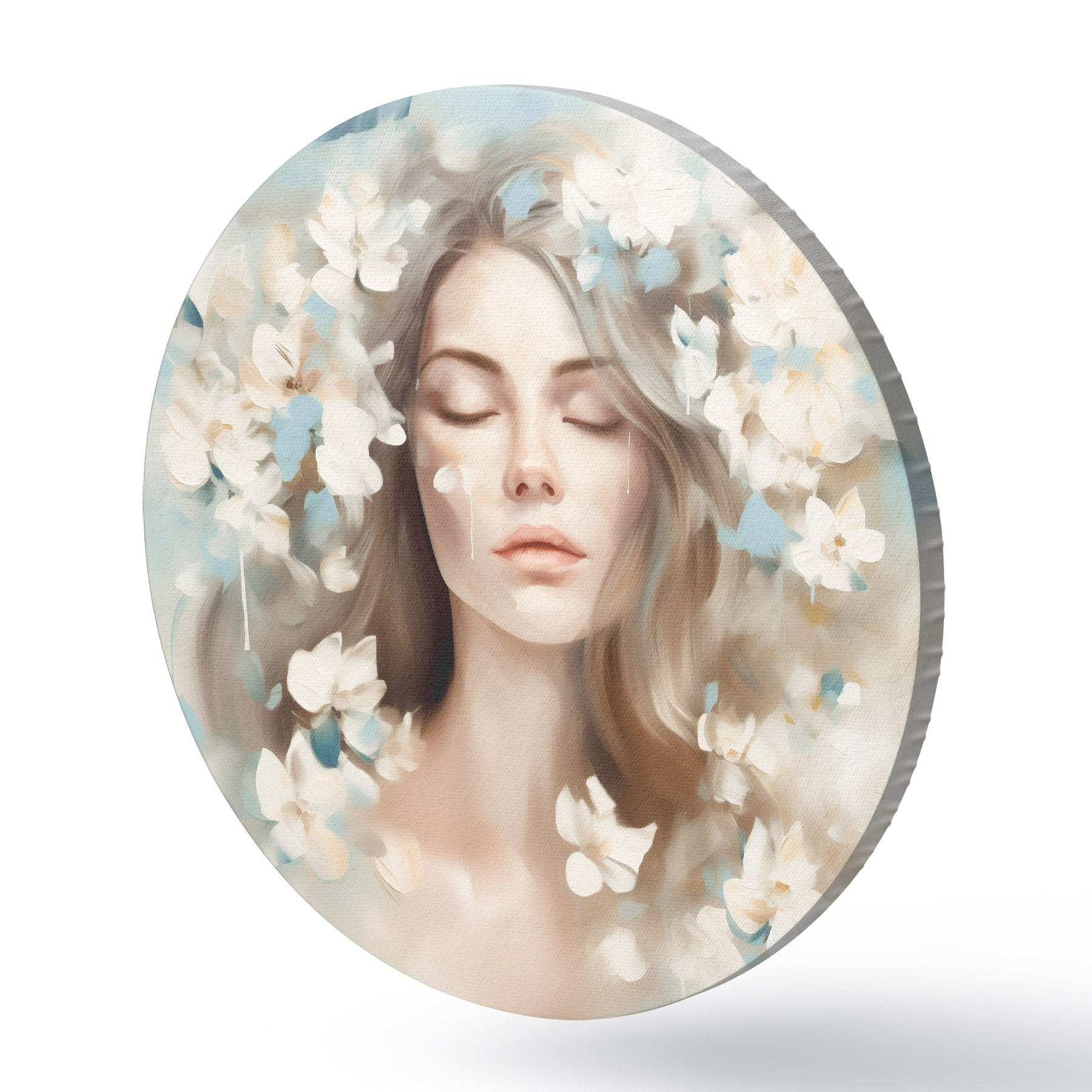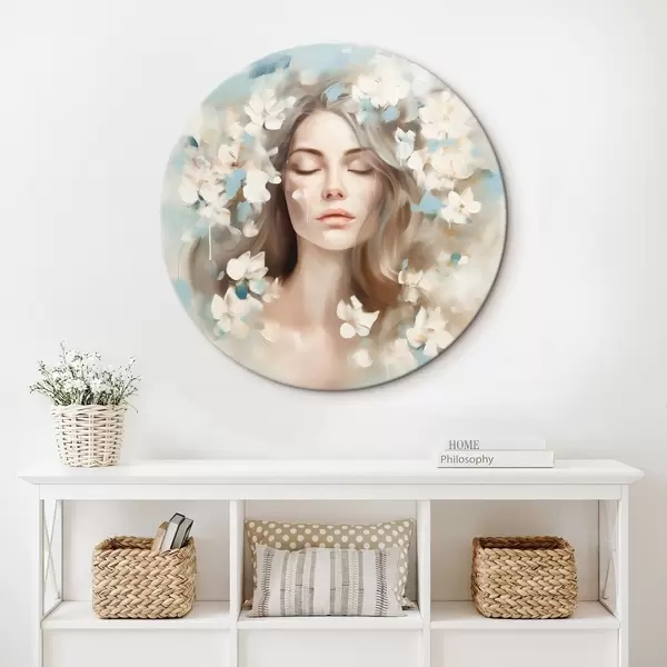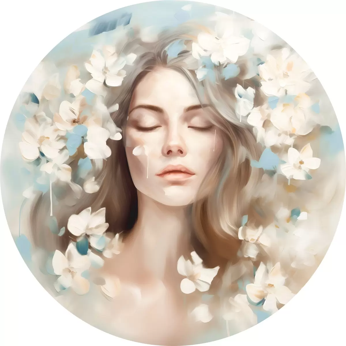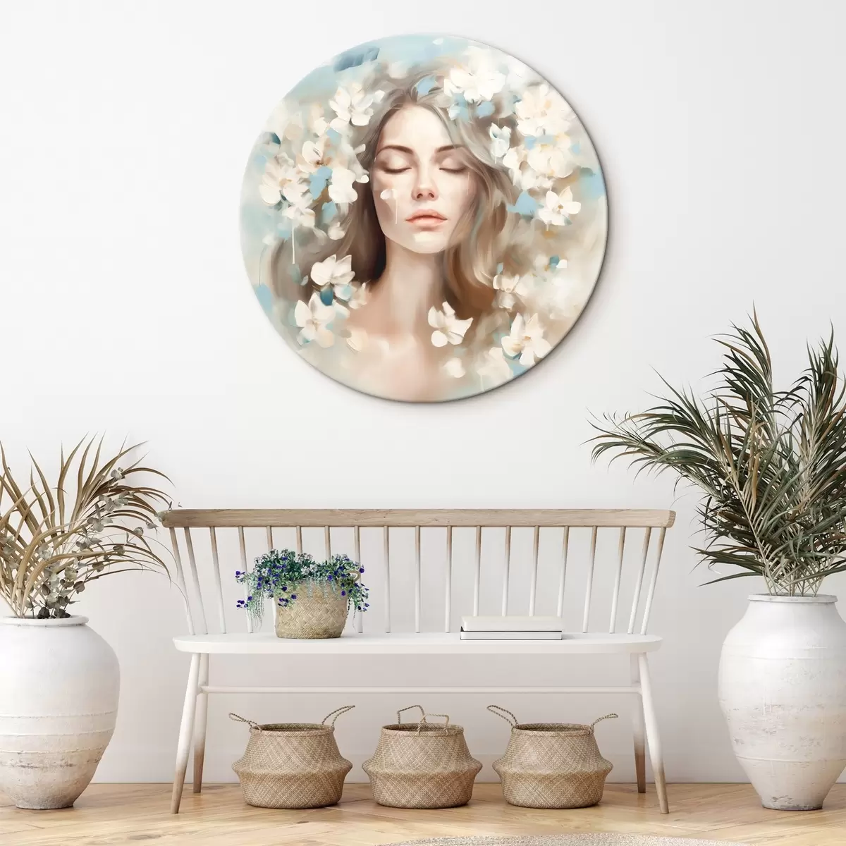 Ronde schilderijen Abstract portret van een vrouw met bloemen in de vorm van penseelstreken r45450