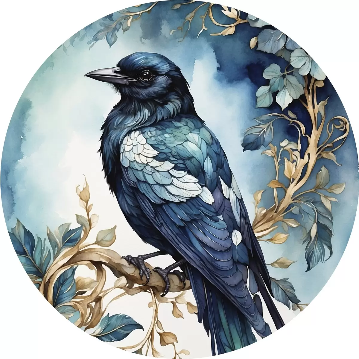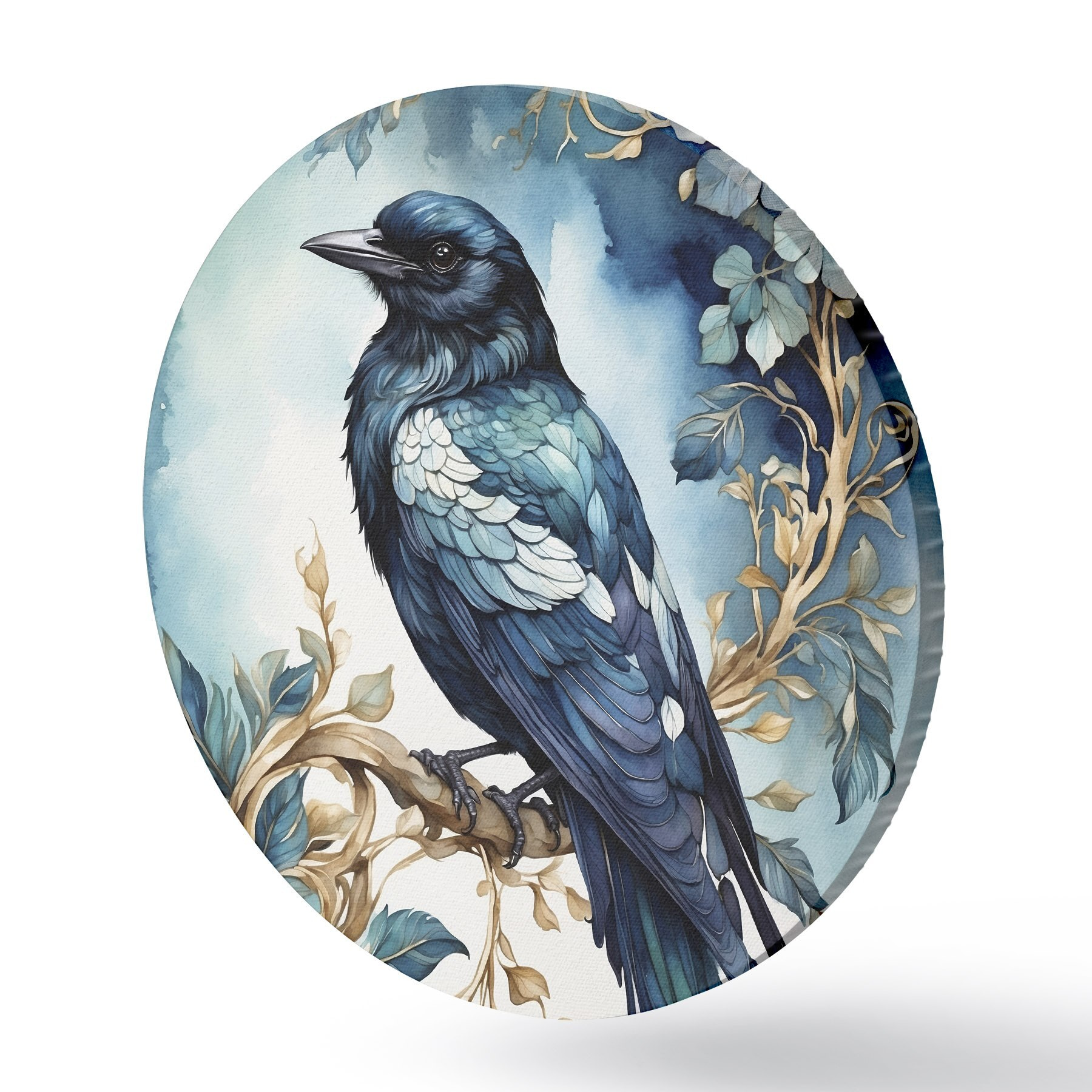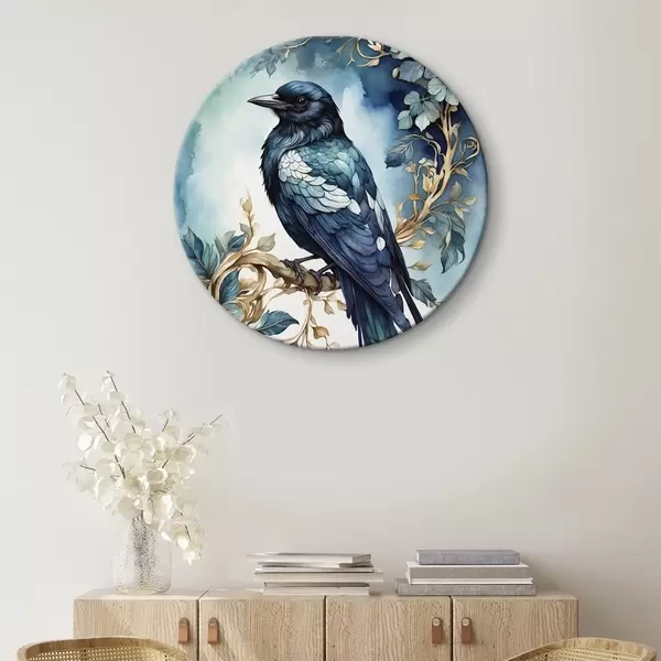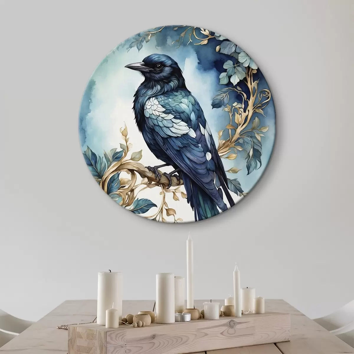 Ronde schilderijen Blauwe vogel op een tak met bladeren in aquarelstijl r45483
