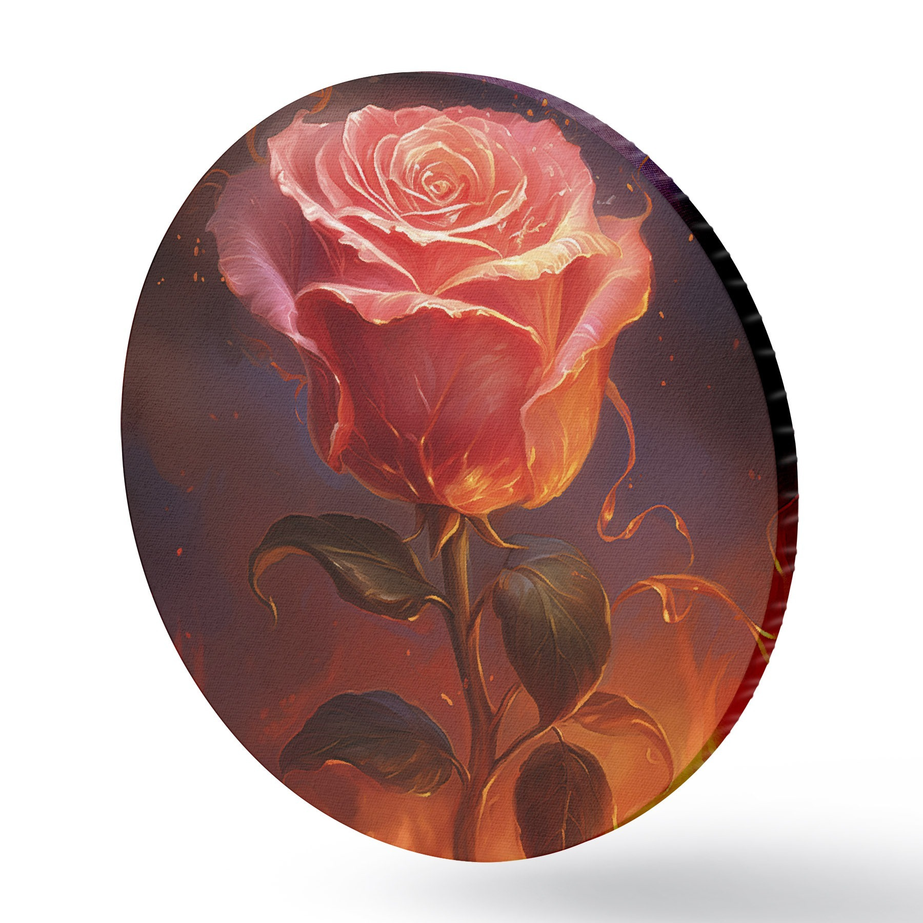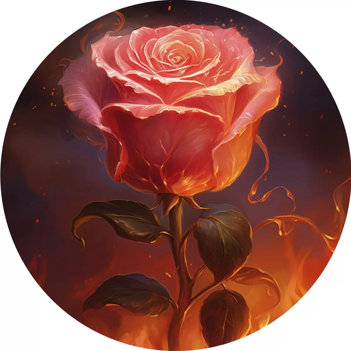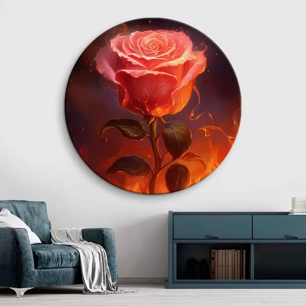 Ronde schilderijen Rode roos tussen vuur en vonken r45523