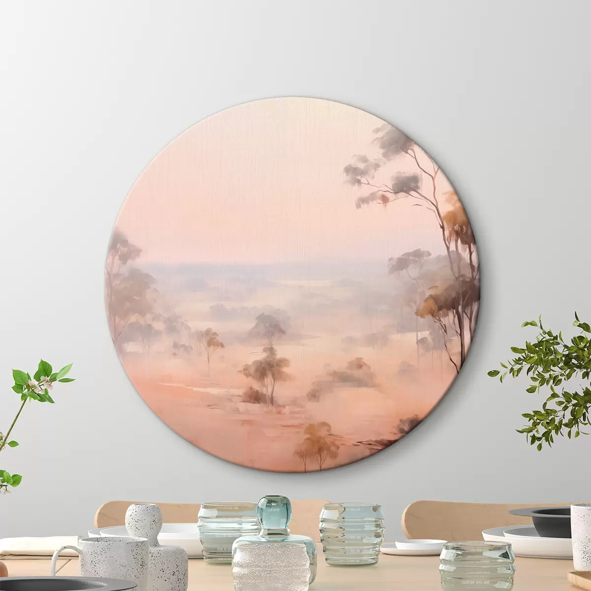 Ronde schilderijen Een landschap met struiken en bomen in pasteltinten roze , oranje en bruin , met bergen op de achtergrond r45554