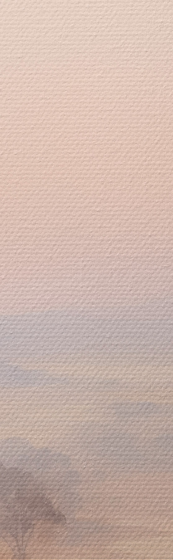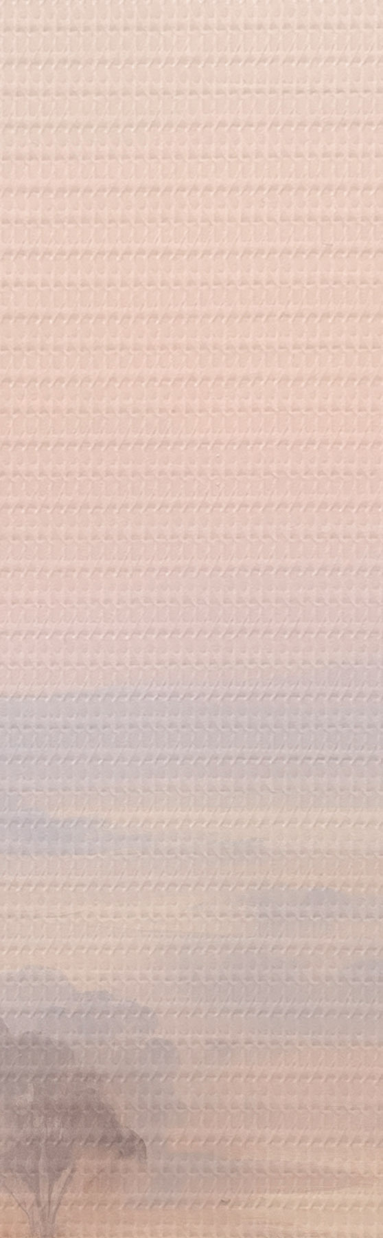 Afbeelding Een landschap met struiken en bomen in pasteltinten roze , oranje en bruin , met bergen op de achtergrond Nr r45554