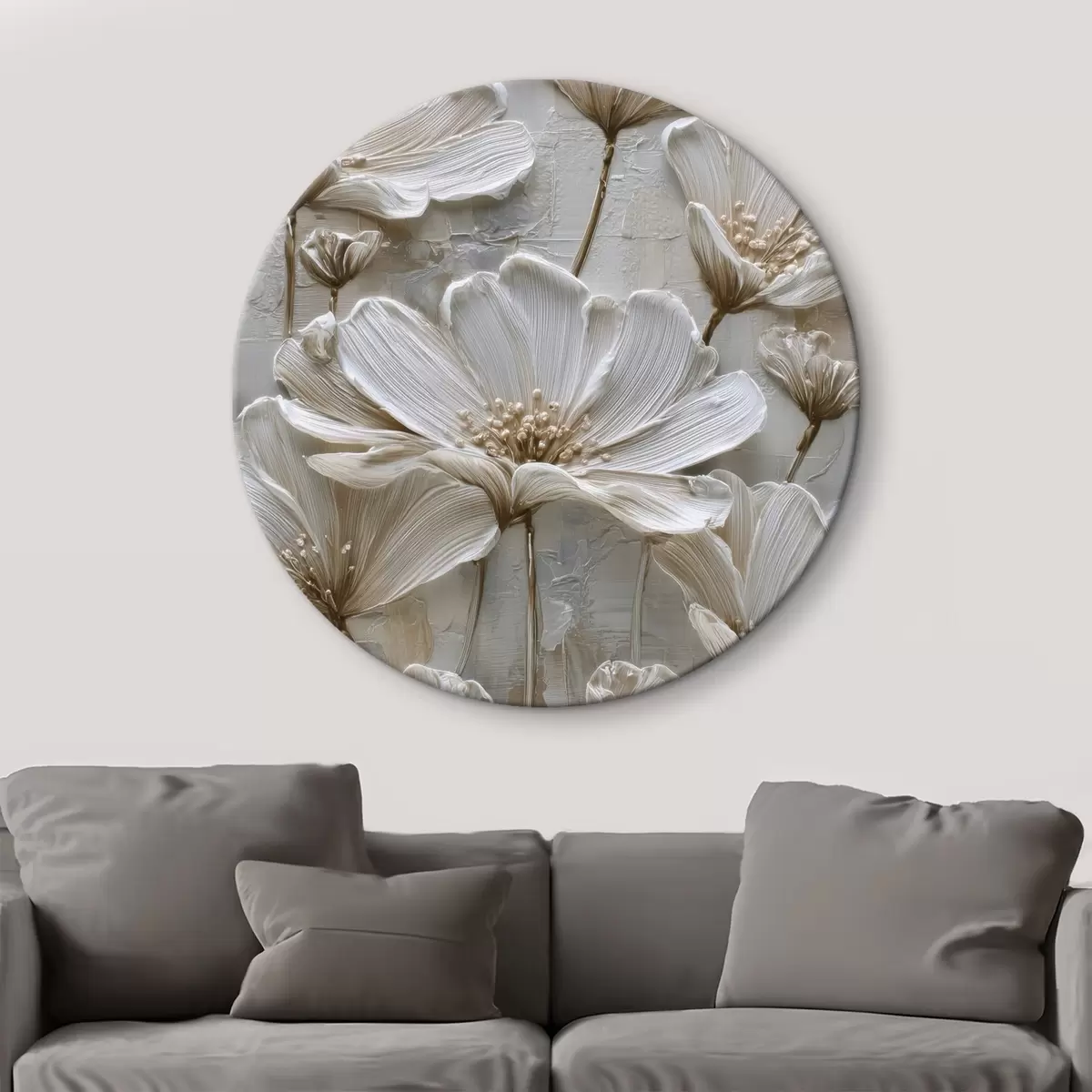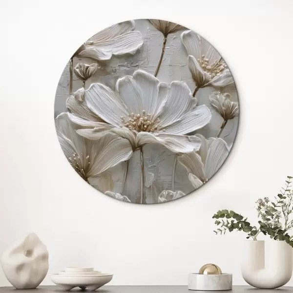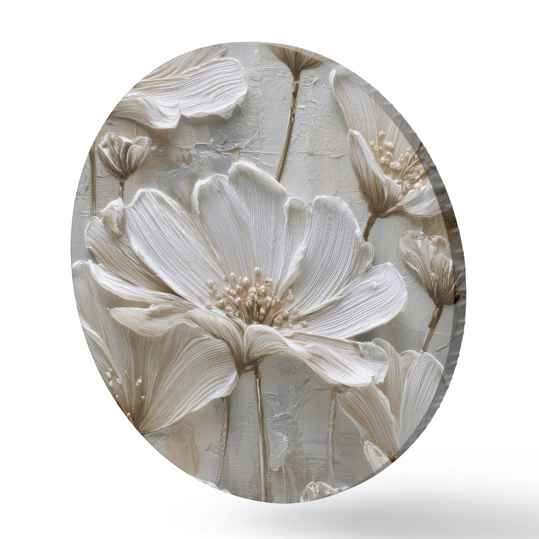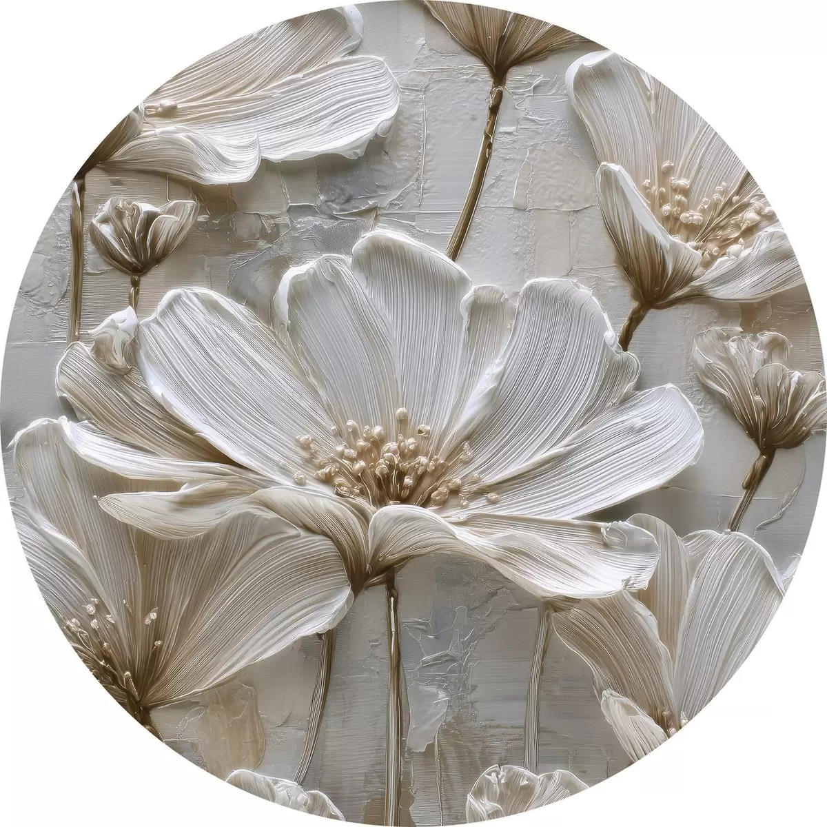 Ronde schilderijen crèmekleurige bloemen in imitatie-impastostijl r45713
