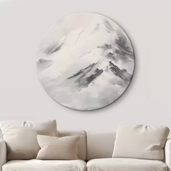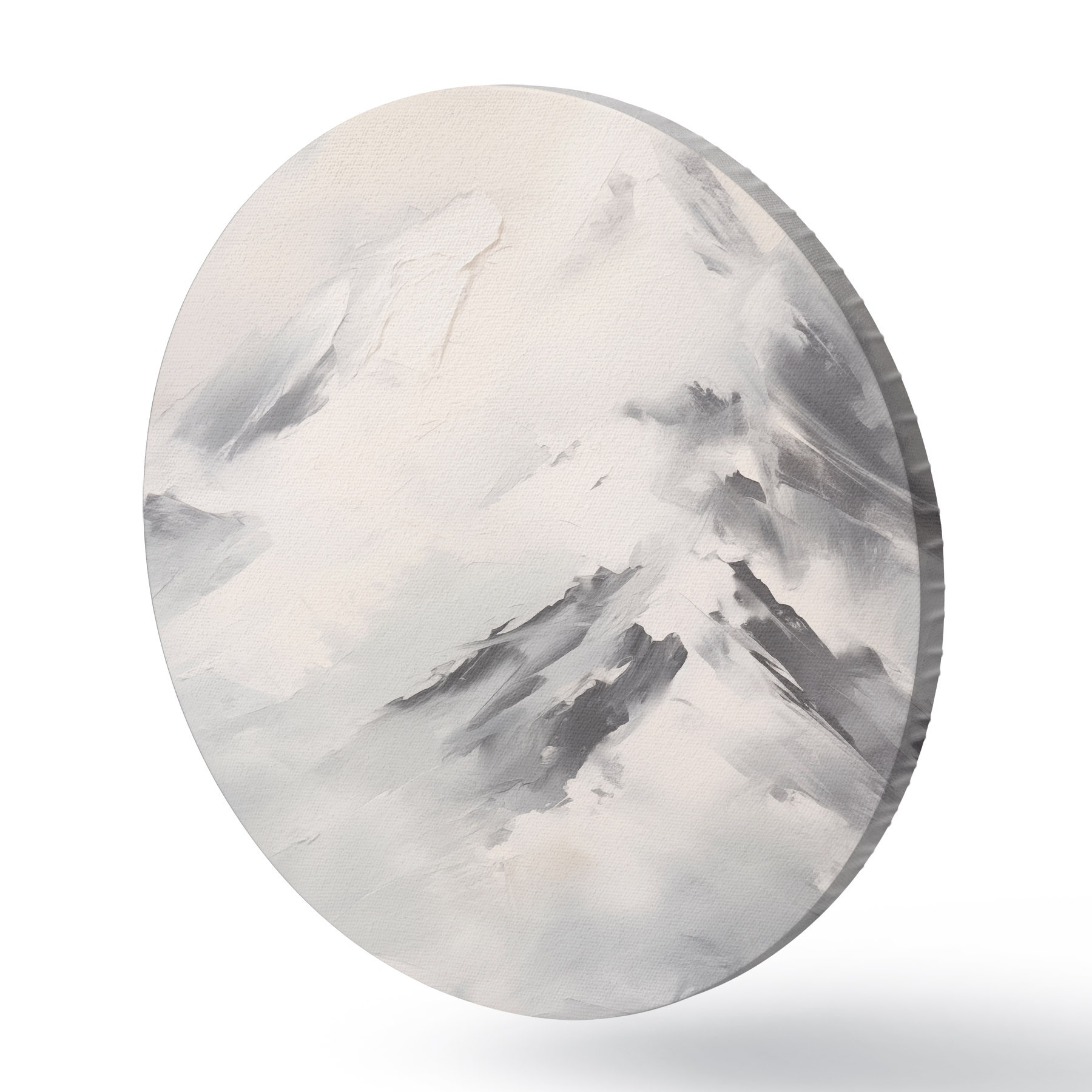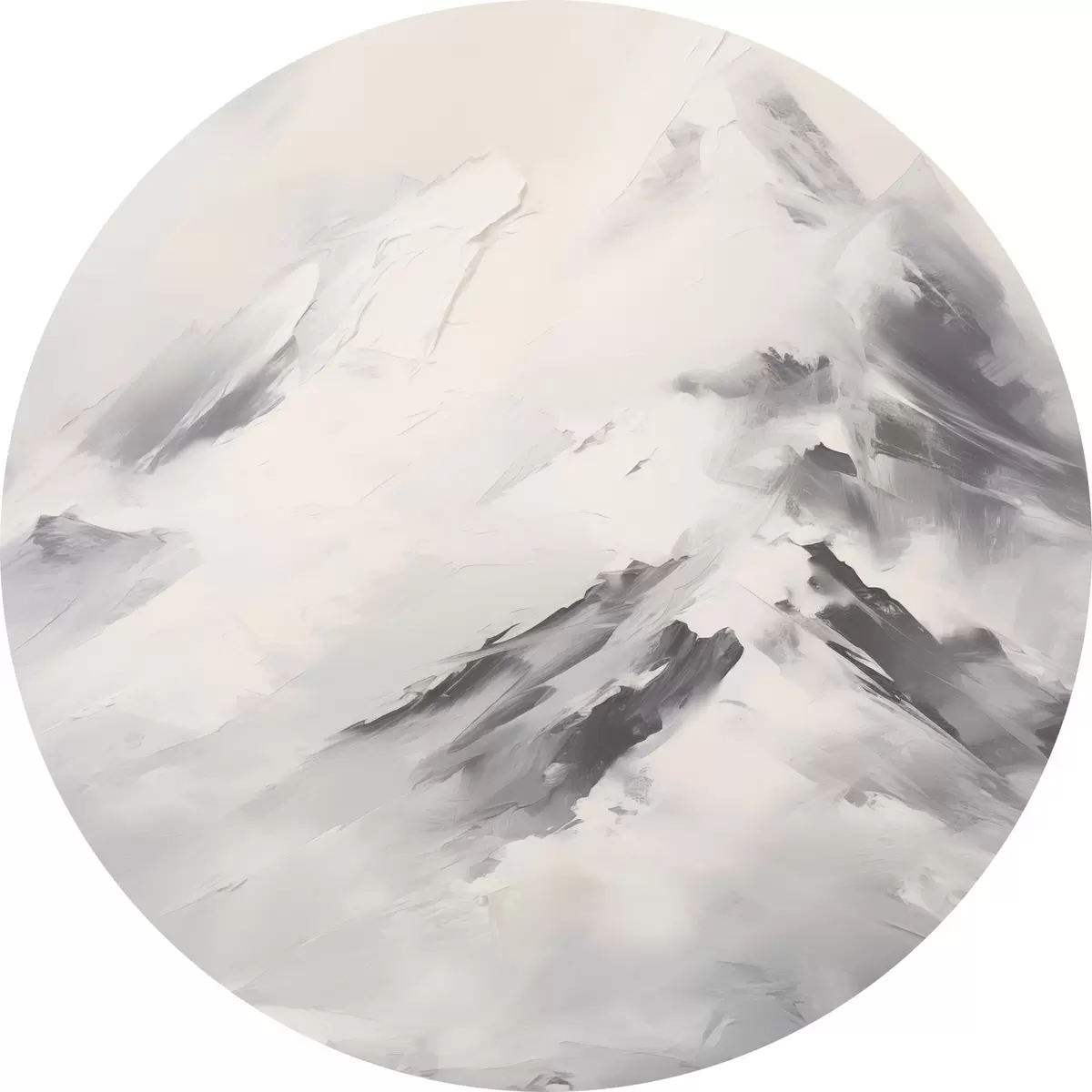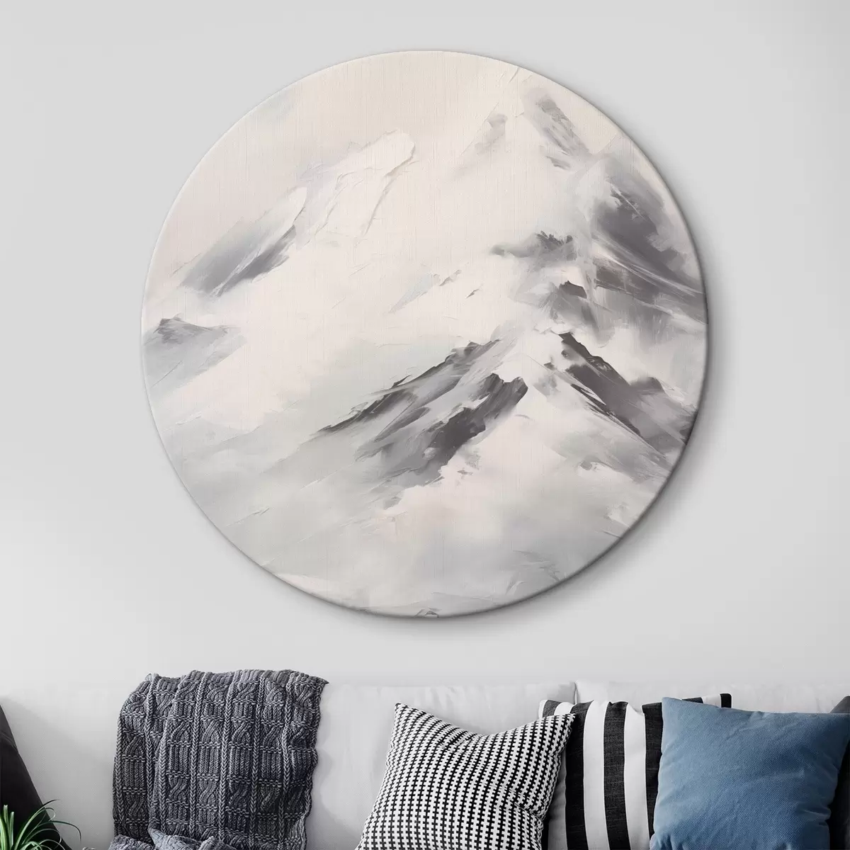 Ronde schilderijen Besneeuwde bergtoppen met grijze schaduwen, grijze lucht, penseelstreken, gestructureerd, minimalistisch r45932