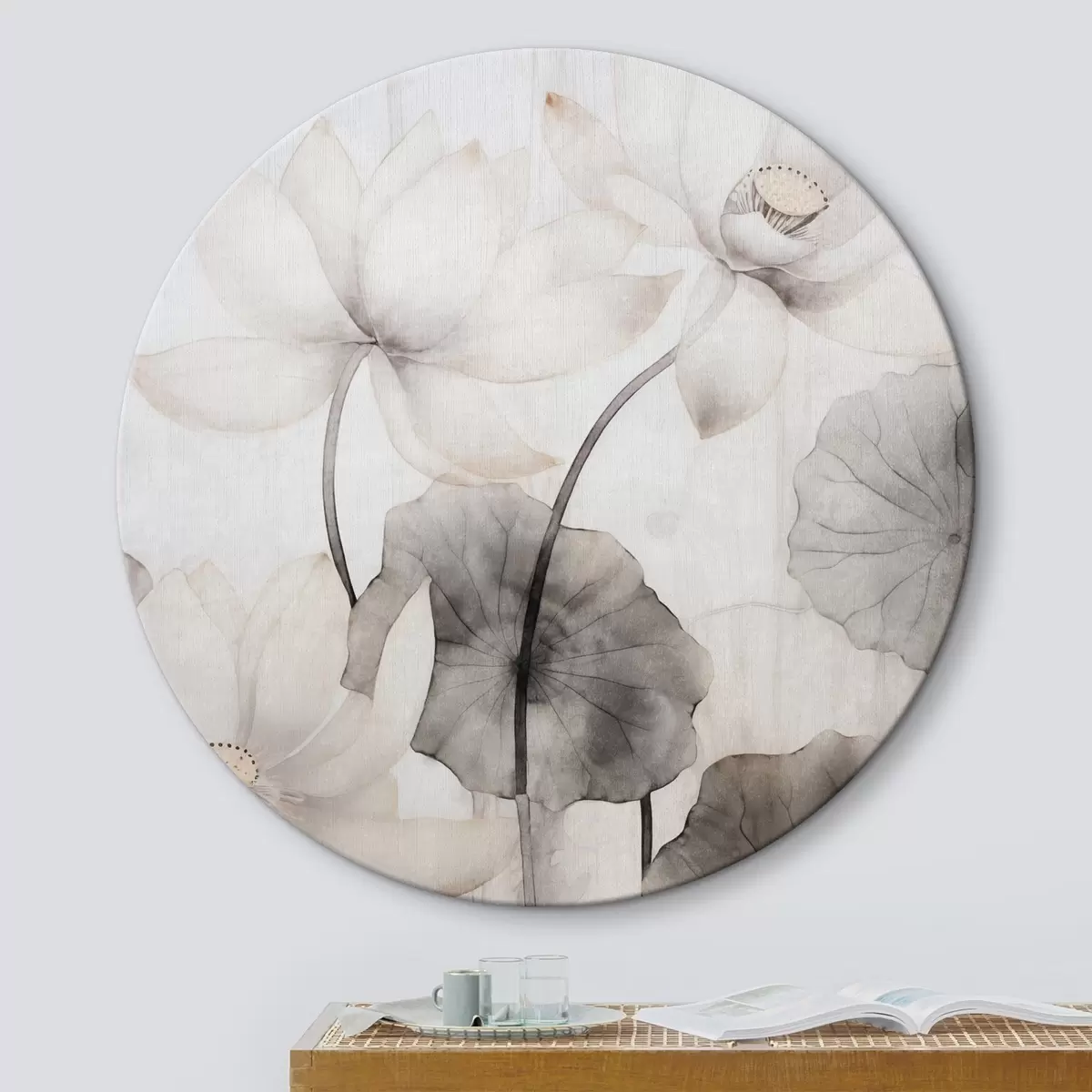 Ronde schilderijen Witte lotusbloemen met textuur en donkere bladeren, lichte achtergrond, minimalistisch ontwerp r45937