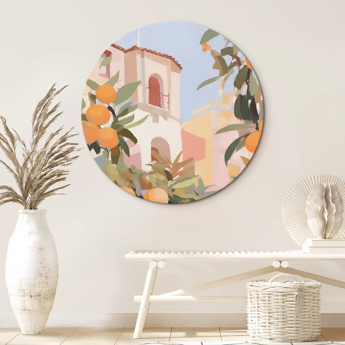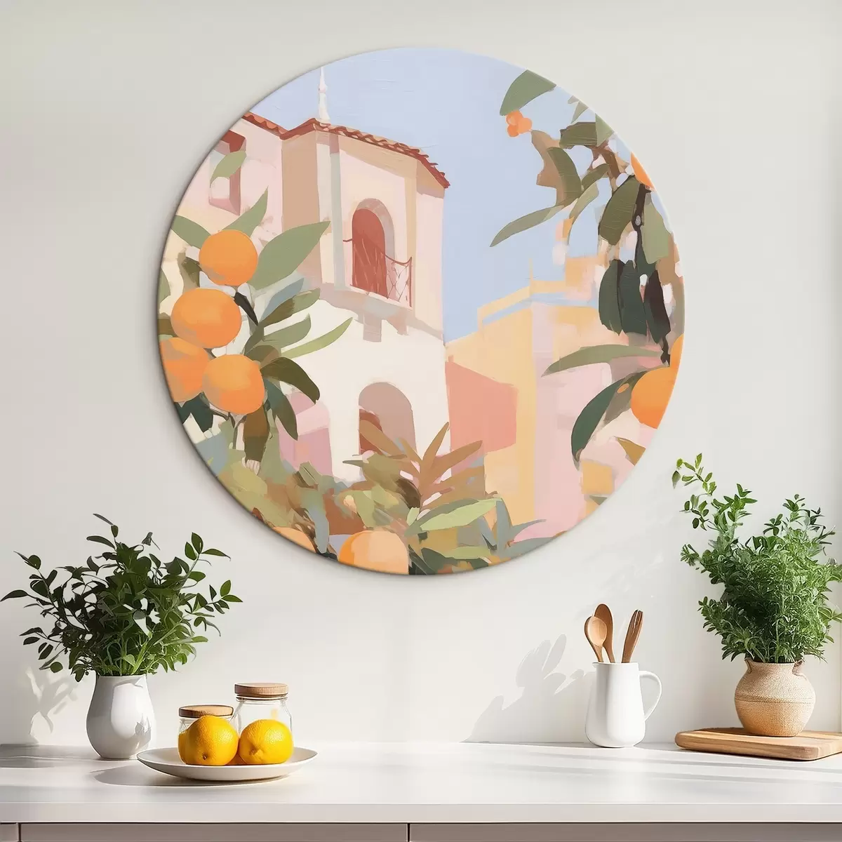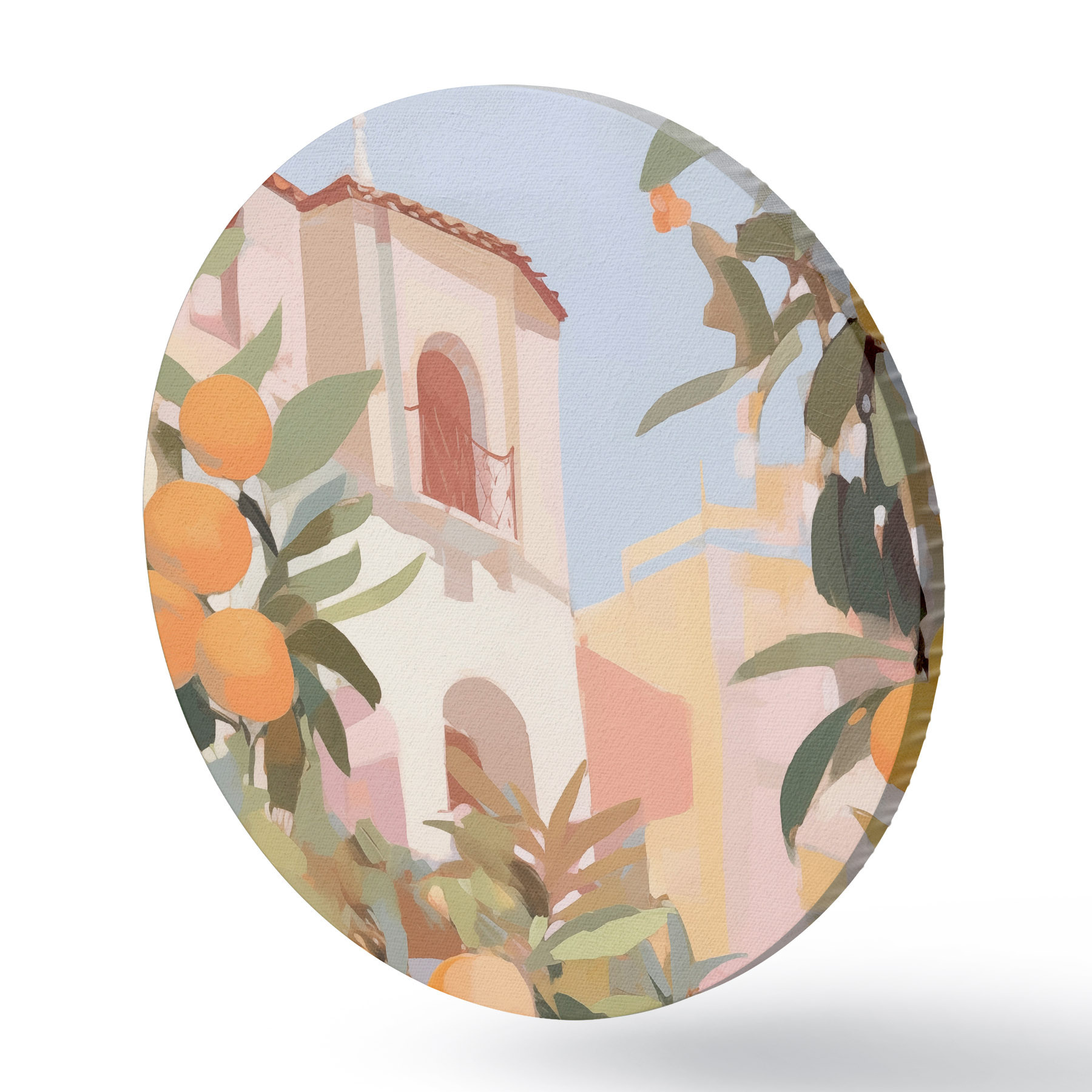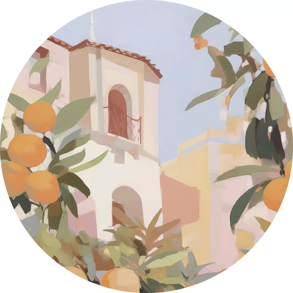 Ronde schilderijen Sinaasappels aan een tak voor het huis r46060