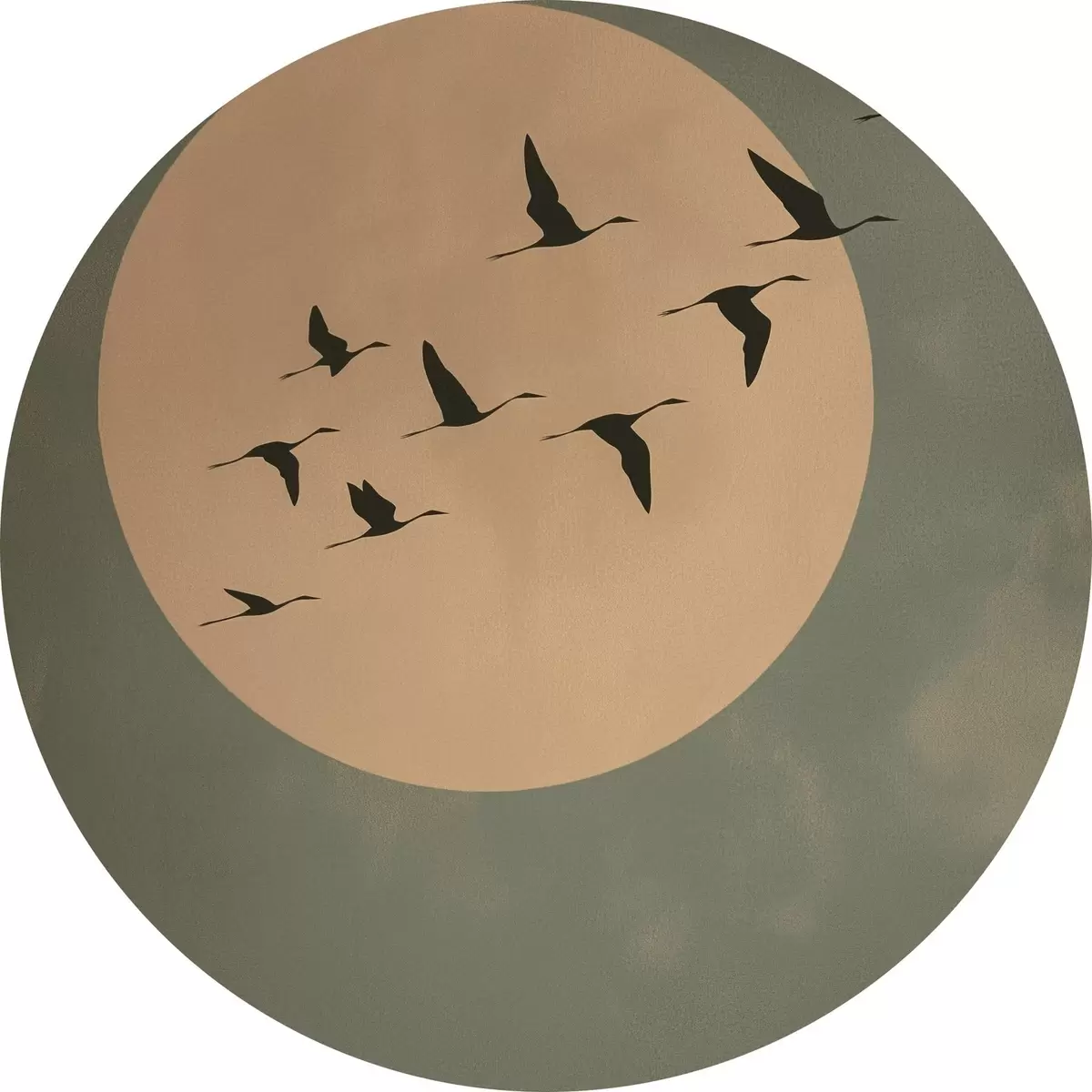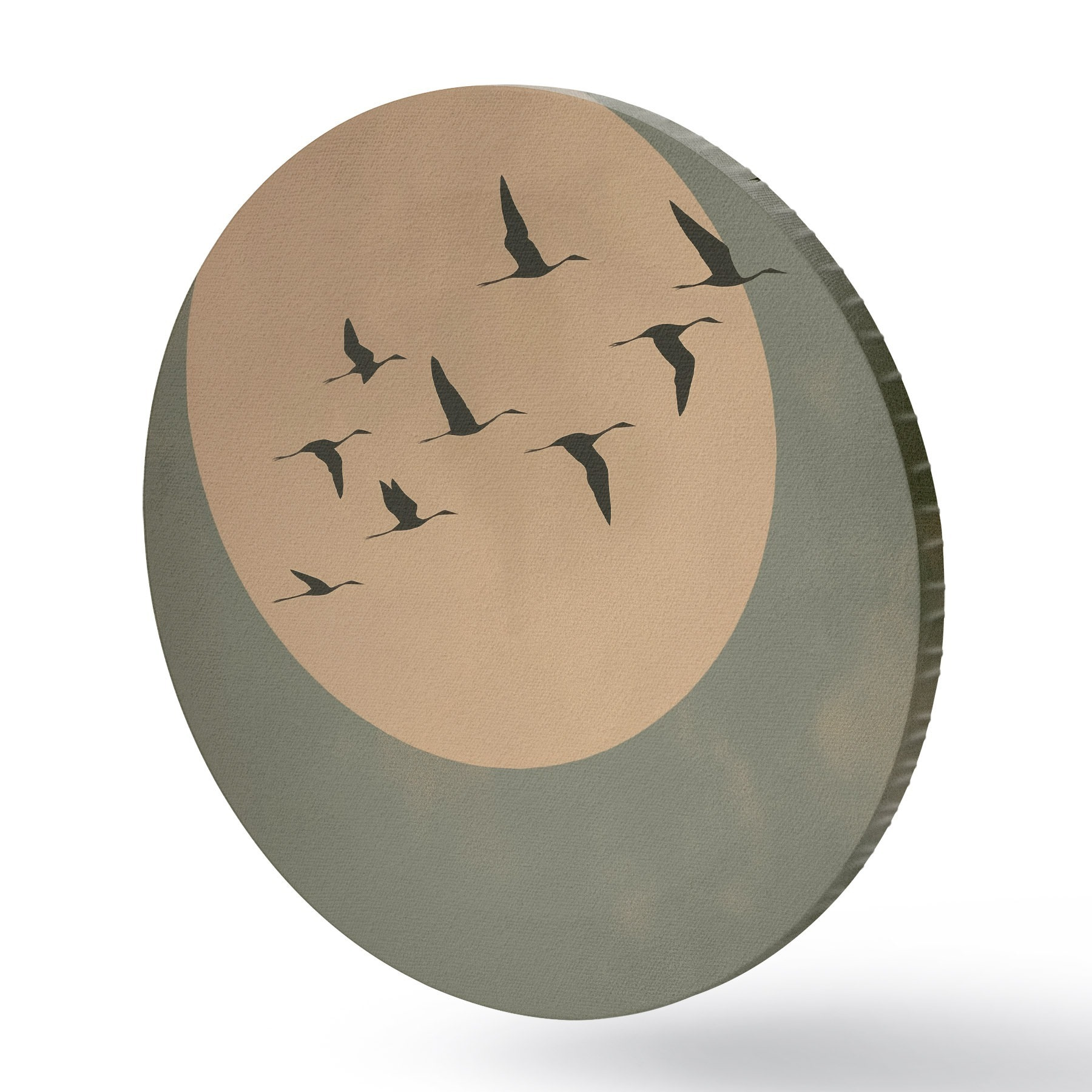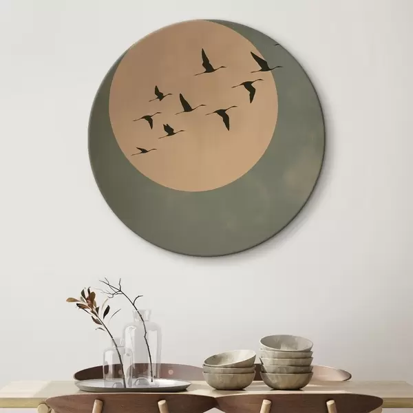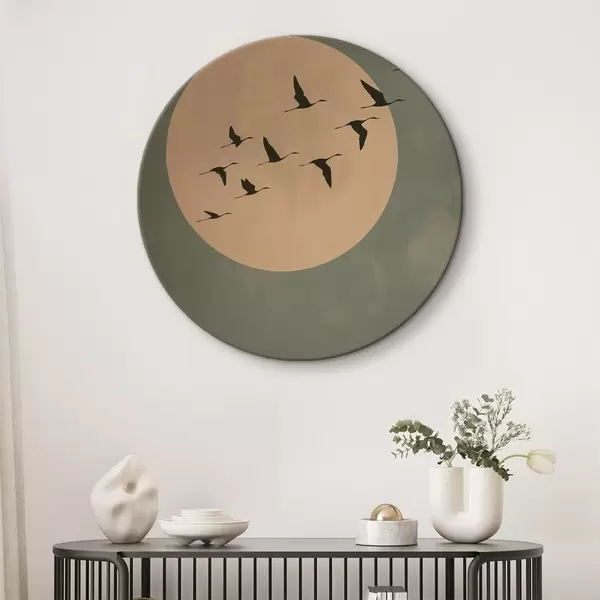 Ronde schilderijen Een zwerm vogels die tegen een grote warme maan vliegt r46162