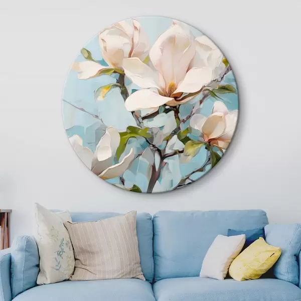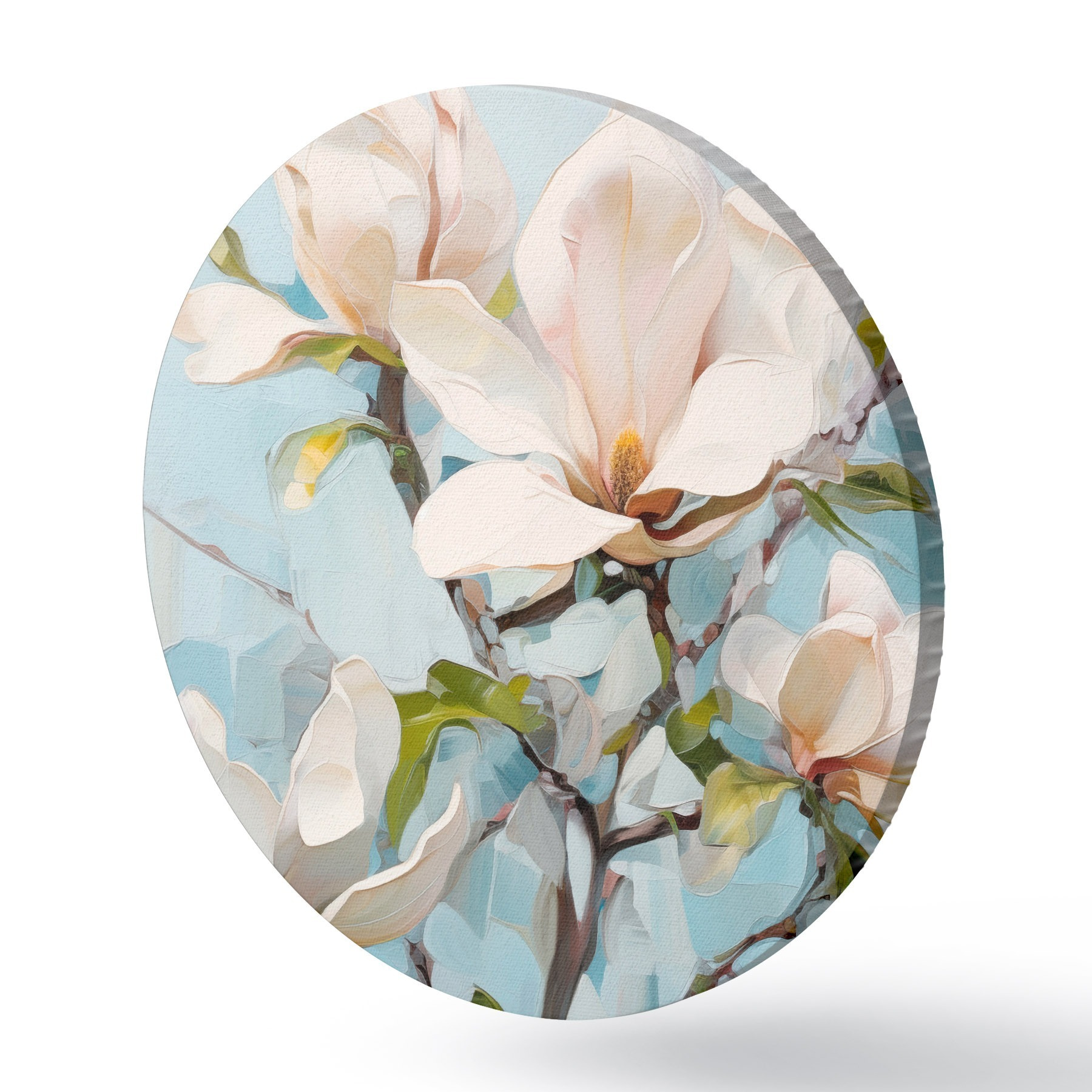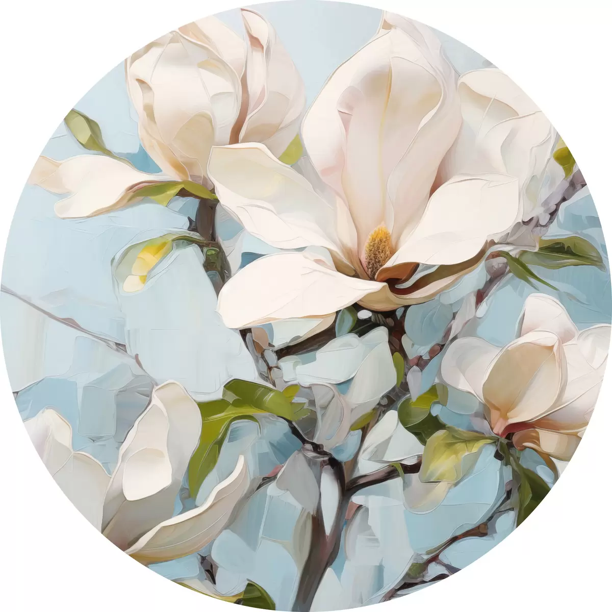 Ronde schilderijen Witte magnoliabloemen, lichtblauwe achtergrond met zachte penseelstreken, olieverfstijl, impasto-textuur r46277