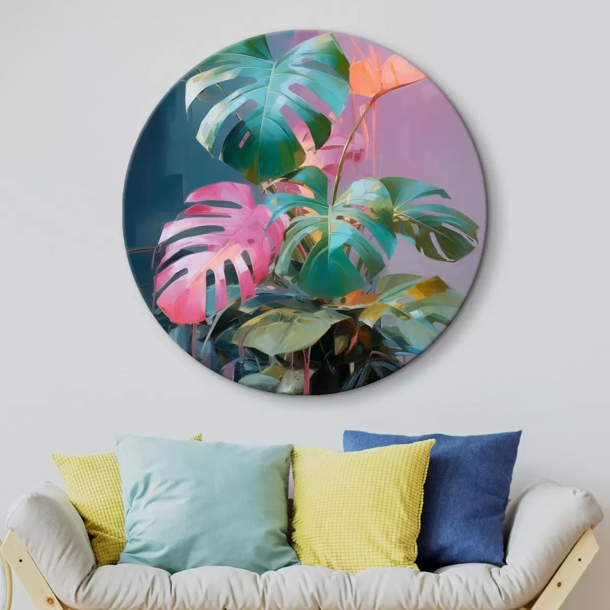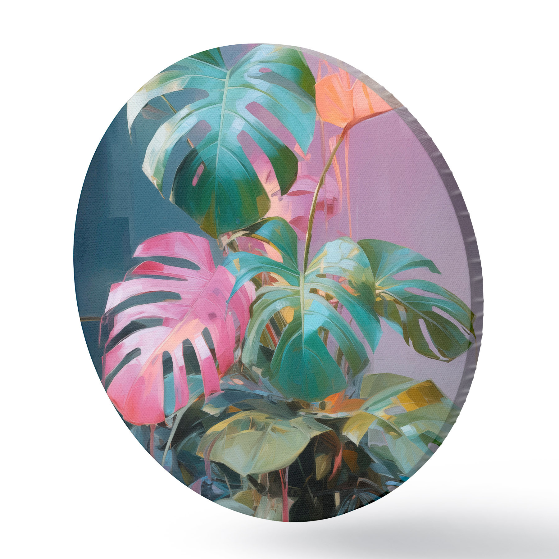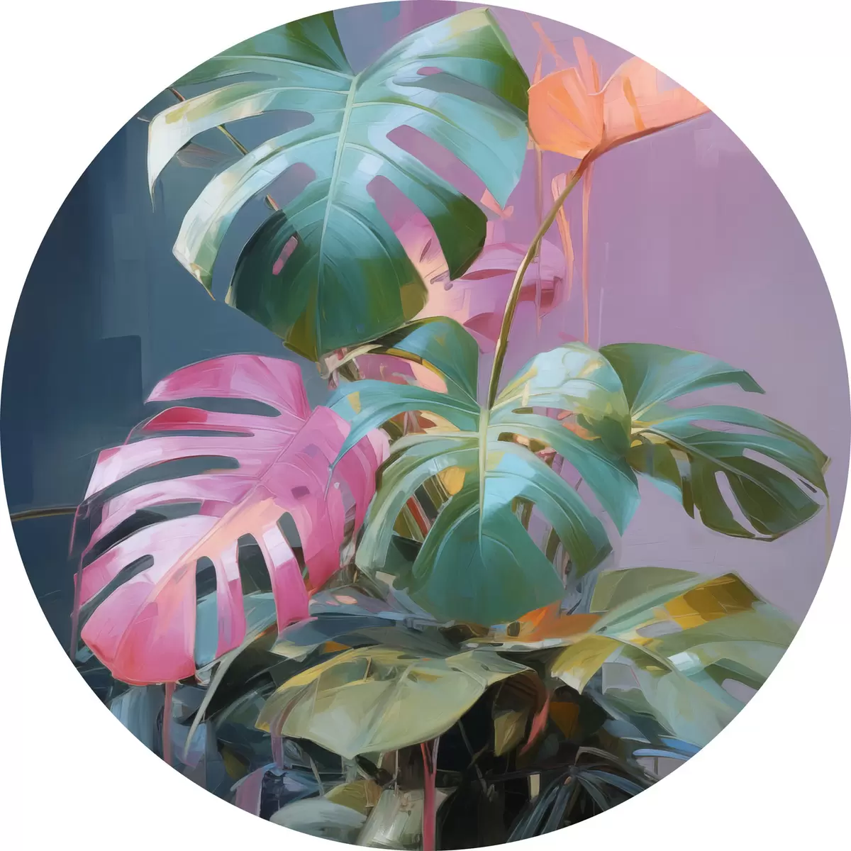 Ronde schilderijen Abstracte monstera-plant met roze en groene bladeren, levendige kleuren, tegen een wazige achtergrond r46287